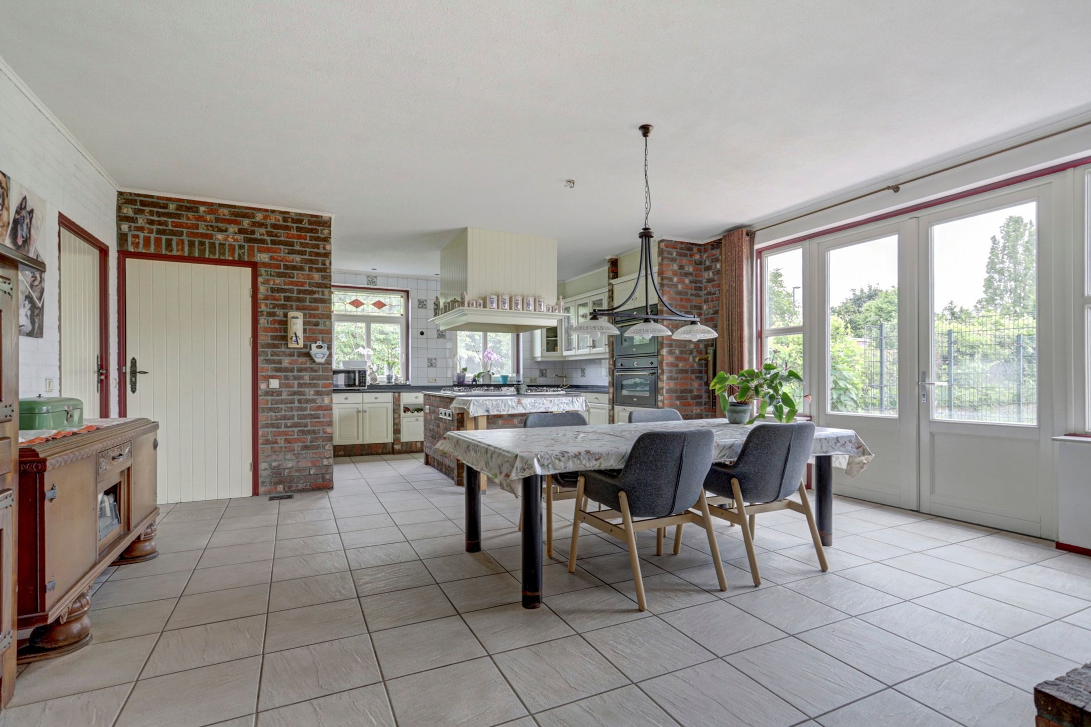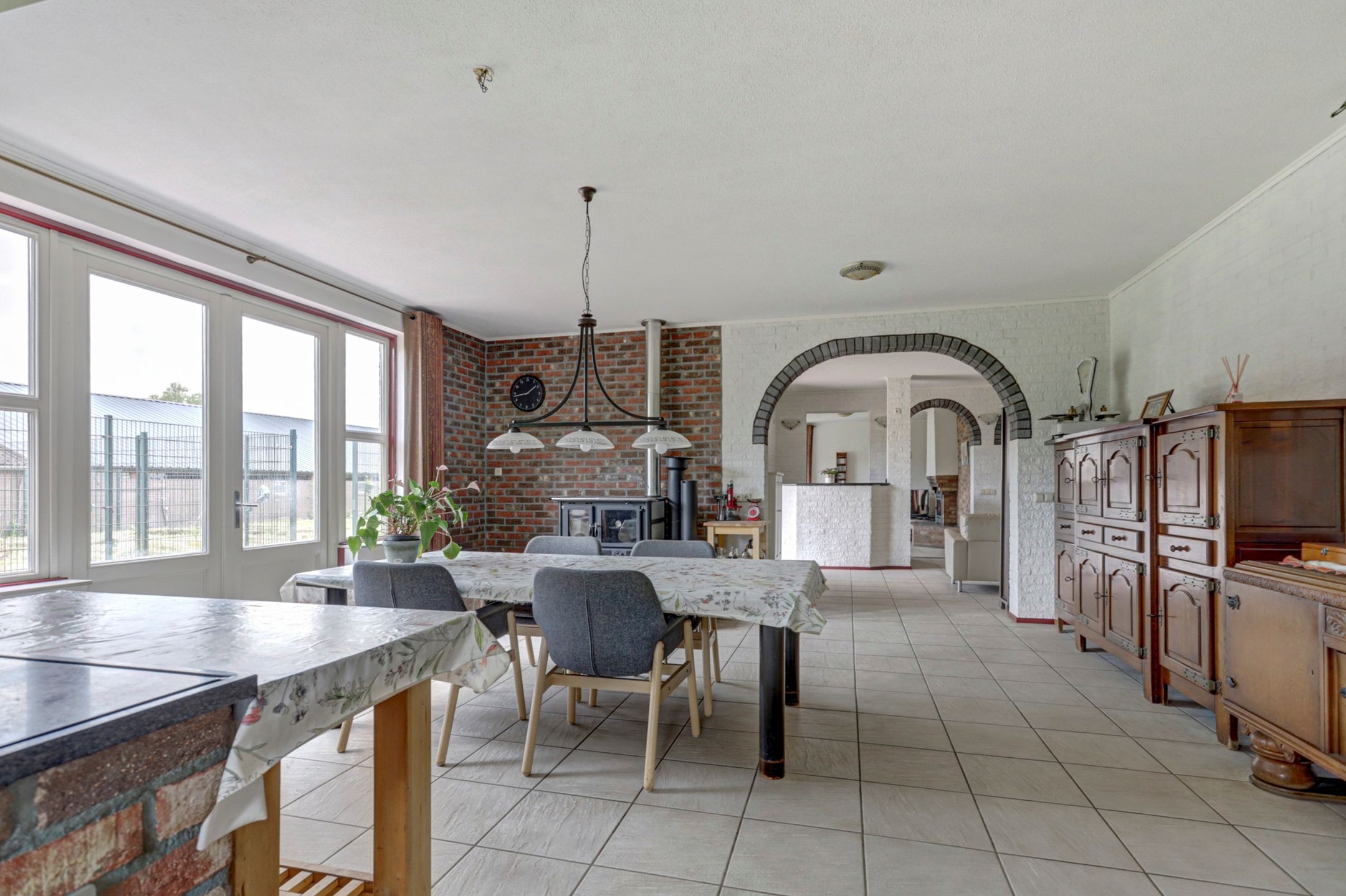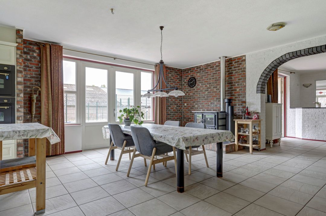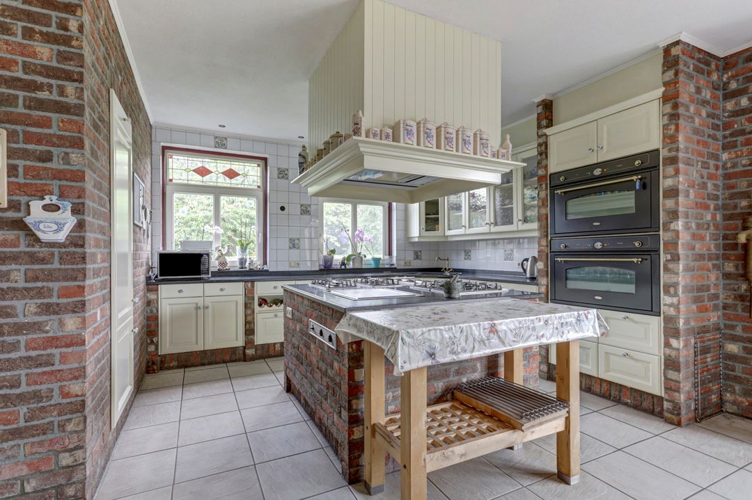 De keuken is de grootste ruimte van het woongedeelte. De keuken is zeer professioneel aangelegd. Het kookeiland bestaat volledig uit Boretti apparatuur waaronder een 4-pits gasfornuis, een wokpit, een vispit, een teppanyaki plaat en een ingeb frituurpan. In een grote schouw boven het eiland zit de afzuiging. De rest van de keuken is gebouwd in een L-vorm en hier beschik je nog over twee grote ovens, een ingebouwde koelkast, een dub spoelbak met close-in-boiler en heel veel opbergmogelijkheden in de vele keukenkastjes en -lades waaronder ook kruidenlaadjes en een wijnrek. Voor de provisie is nog een handige muurkast aanwezig. Als extra staat er nog een prachtige speksteenkachel die niet alleen voor een aangename warmte kan zorgen maar waar je ook op kunt koken of een pizza in klaar kunt maken. In de keuken is meer dan genoeg plaats voor een enorme eettafel en er is zelfs een barretje aanwezig waar een biertap op aangesloten kan worden. Via twee dubbel openslaande deuren kun je de tuin inlopen.