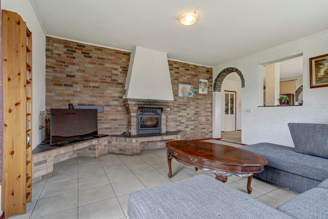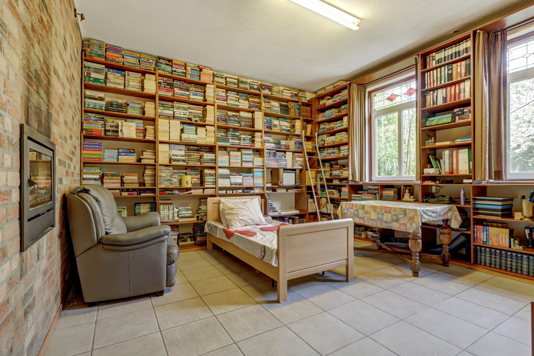 Ook aan de rechterkant bevindt zich een verlaagde ruimte die in gebruik is als bibliotheek. Van de vloer tot aan het plafond en tegen iedere wand zijn op maat gemaakte boekenplanken bevestigd die helemaal vol liggen met boeken. Met een laddertje kun je op de bovenste planken komen. De doorkijkhaard in de woonkamer bevindt zich ook in deze ruimte. Door de twee draaikiepramen met glas in lood komt er mooi natuurlijk licht binnen.