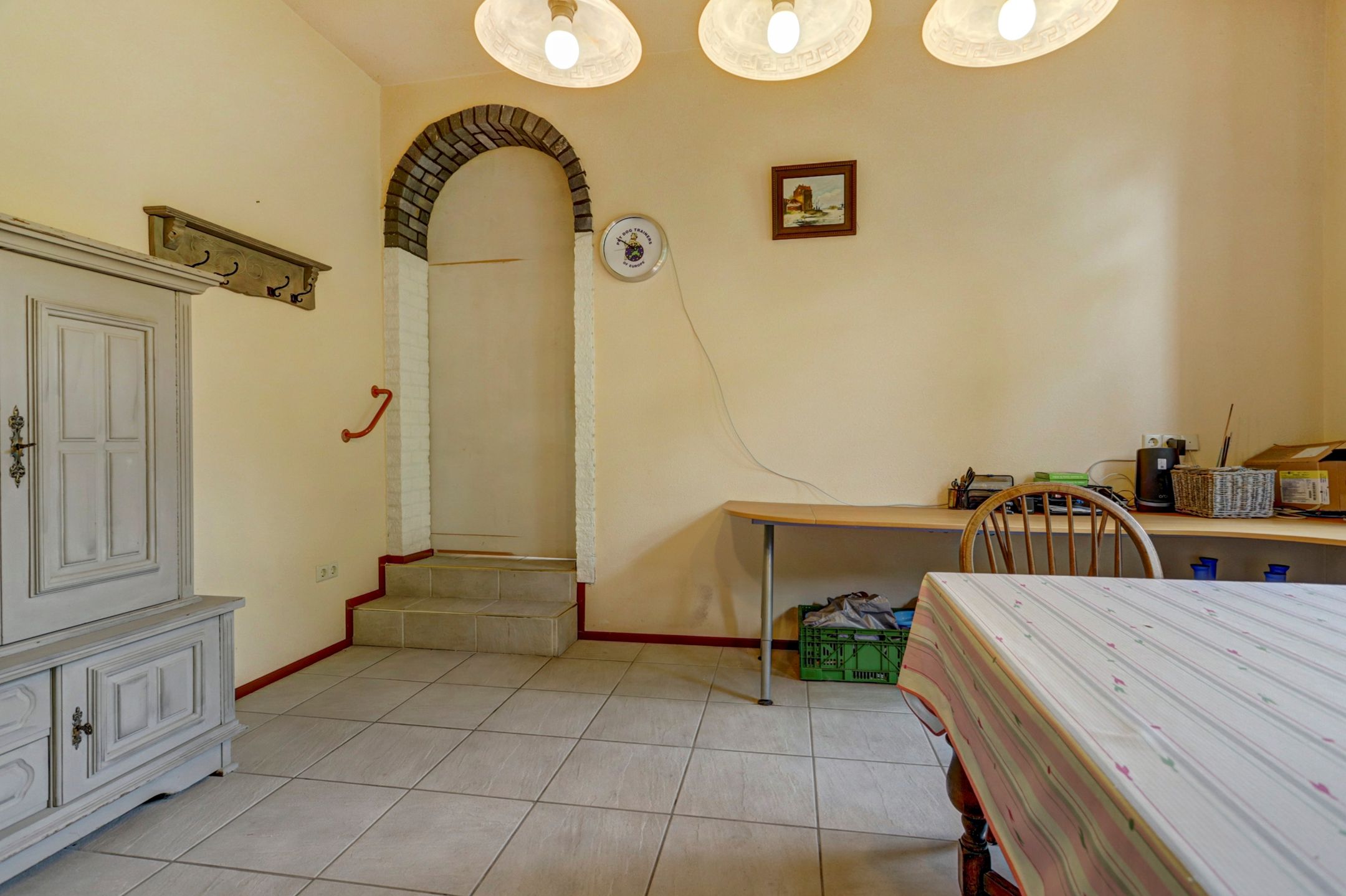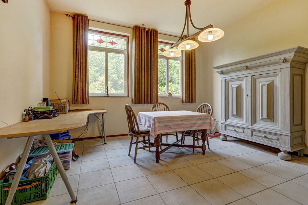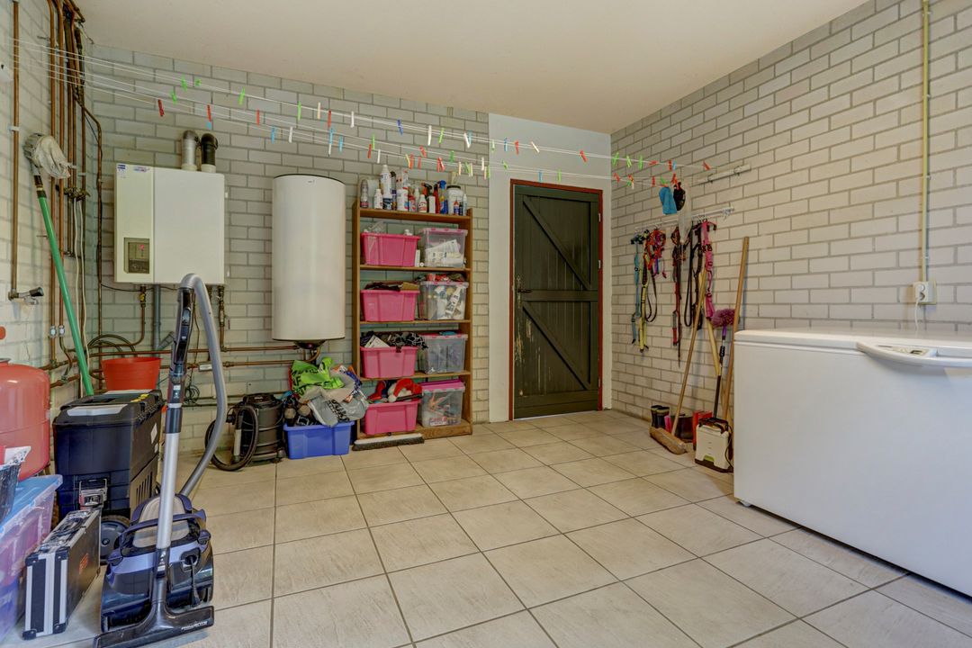Naast de keuken ligt een handige bijkeuken met witgoedaansluitingen, de Nefit CV ketel en (120 liter) Nefit boiler. Om goed in het geheel van de woning te passen zijn in deze ruimte ook twee draaikiepramen met glas in lood aanwezig. Aan de zijkant is bovendien een eigen ingang gemaakt.