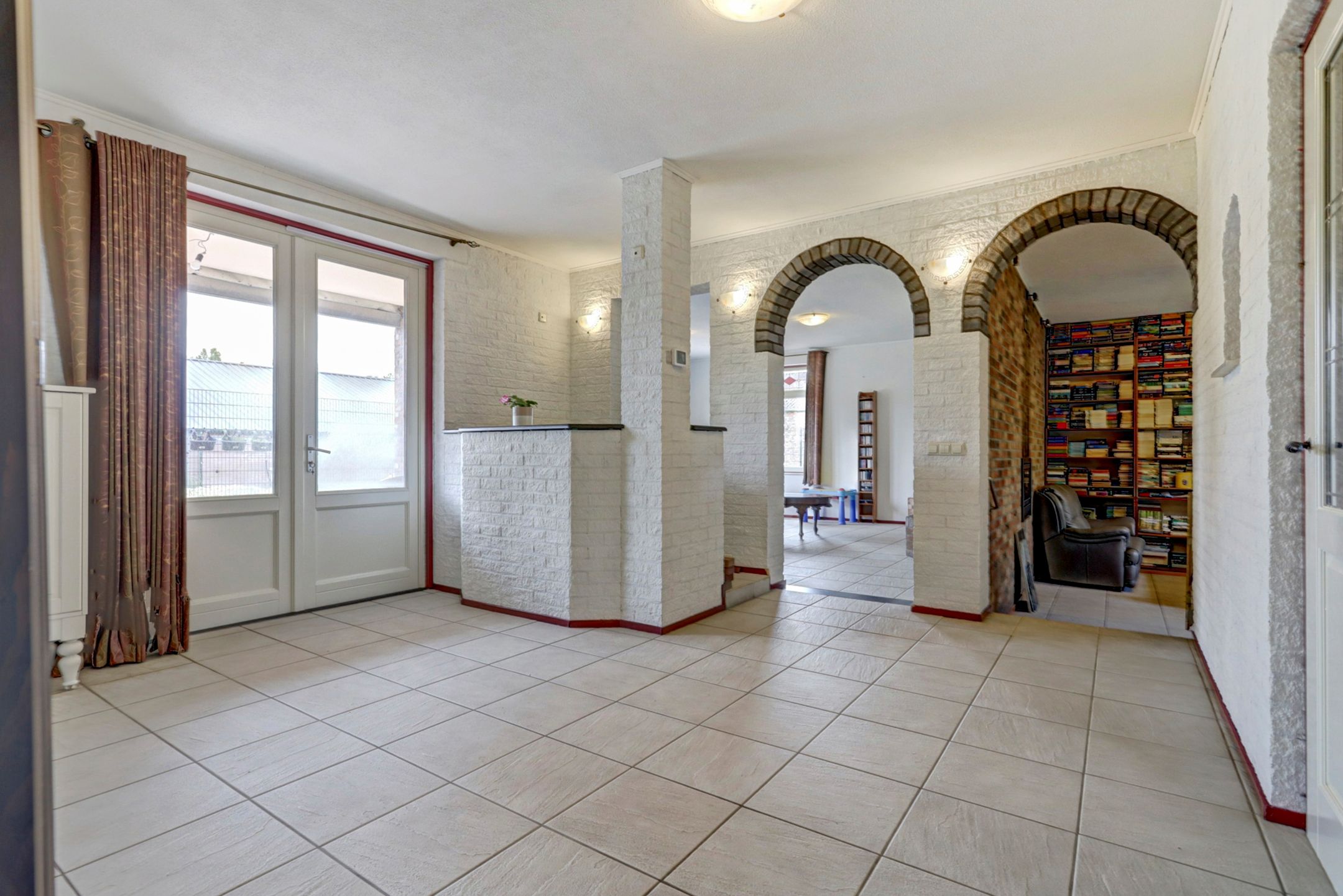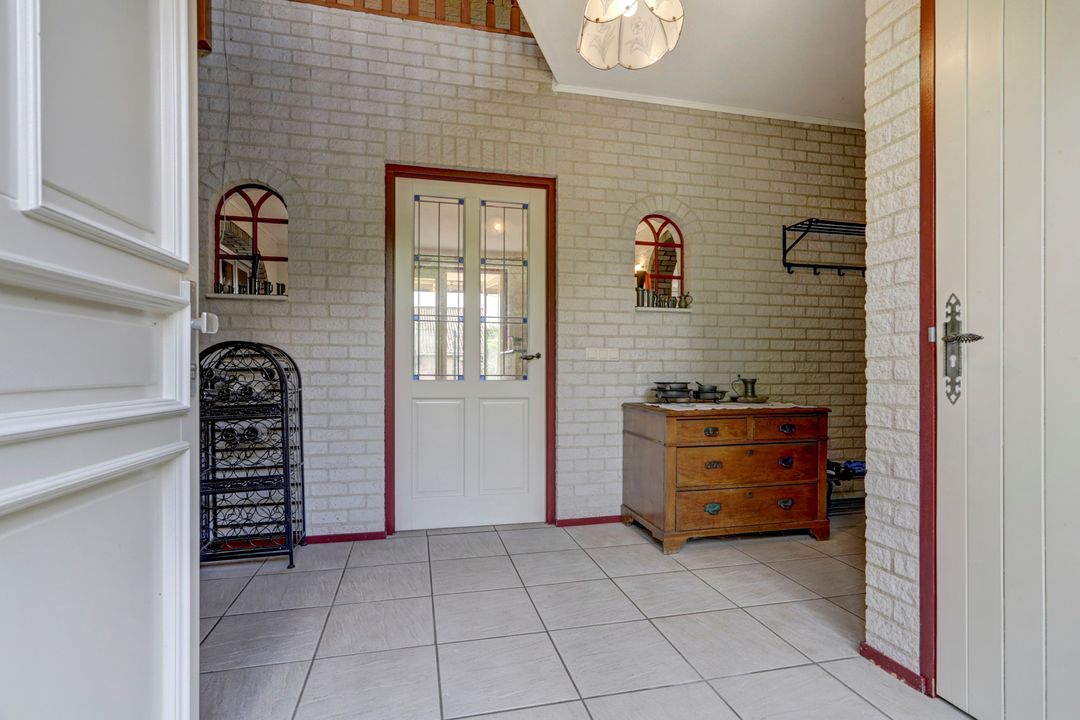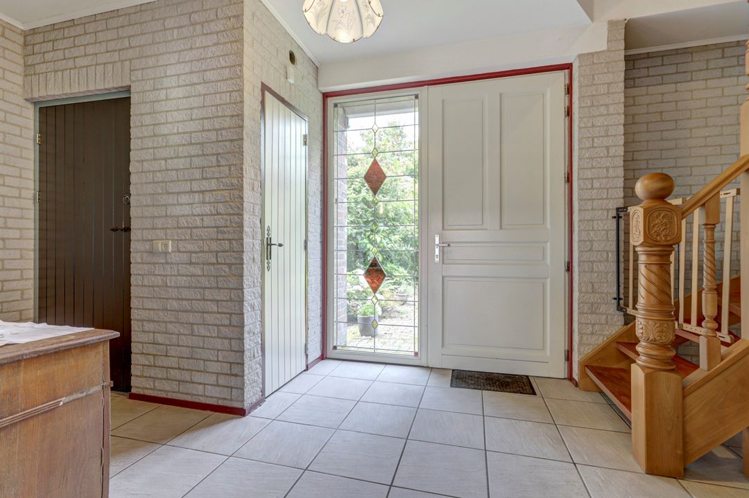 Bij zo’n grootse woning hoort ook een grootse entree en die krijg je hier! De oprijlaan is maar liefst 60 m. lang met aan beide kanten lindebomen en enkele notenbomen. Aan het einde van de oprit bevindt zich een dubb smeedijzeren poort die toegang geeft tot het ommuurde deel. Voor de woning liggen div parkeerplaatsen en via een beklinkerd paadje loop je door de aangelegde siertuin naar de voordeur. De prachtige houten voordeur met daarnaast een groot raam met glas in lood leidt naar de ontvangsthal waar de grote trap met houtsnijwerk. In de hal is een toiletruimte aanwezig en de meterkast met GVaansluiting.
