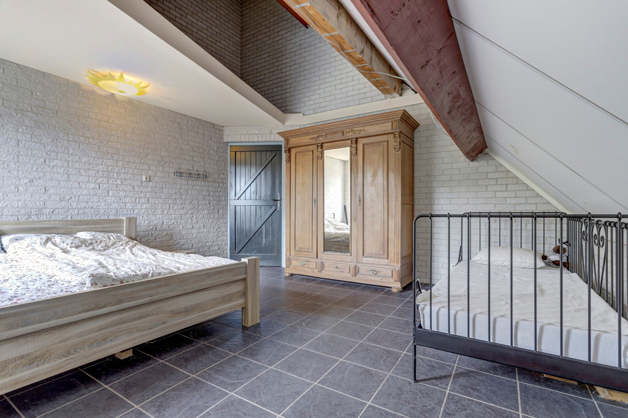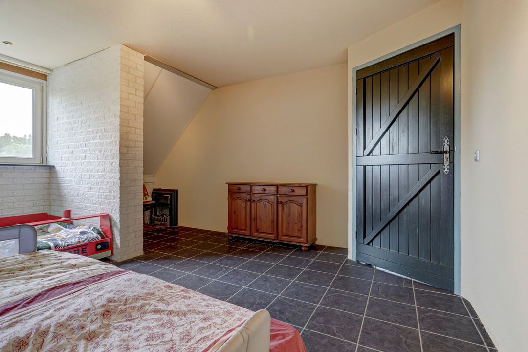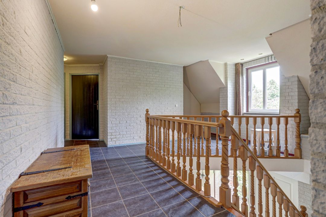 De houten trap, die versierd is met houtsnijwerk, brengt je naar de eerste verdieping. Boven de trap is een bak gemaakt waar je eventueel planten in kunt poten om ook wat groen in huis te hebben. Via een dakkapel komt er licht binnen op de overloop. Er zijn vier slaapkamers aanwezig, een badkamer en een inloopkast. De hele verdieping is voorzien van een donkere tegelvloer met vloerverwarming.