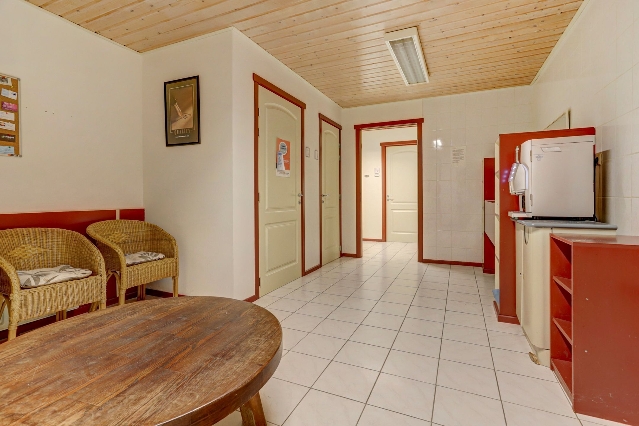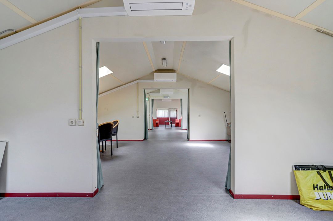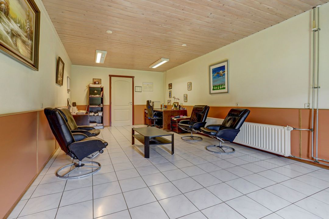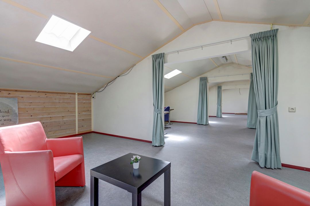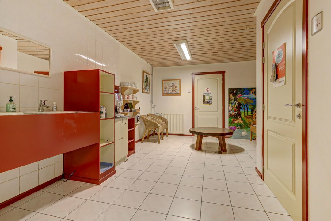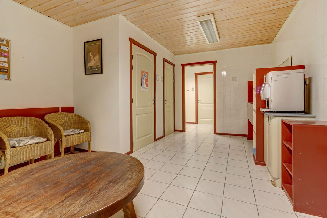 De praktijkruimte heeft een eigen ingang die je via een beklinkerd pad met beukenhaag kunt bereiken. Om de privacy in de achtertuin te behouden is er een muur gemetseld die begroeid is met druivenstruiken en blauwe regen. De praktijkruimte bestaat uit een receptie, vier behandelkamers, een wachtruimte met twee toiletten en doucheruimte en een archief. In de keuken is een keukenblok, ruimte voor een fornuis, een Daalderop boiler van 120 liter, witgoedaansluitingen en een koelcel. Helemaal achterin ligt een groepsruimte met een eigen uitgang en een plek voor de meterkast, de CV ketel en de omvormer van de zonnepanelen. Boven het complex ligt nog een complete zolder die met een vaste trap te bereiken is en bestaat uit vier ruimtes die elk beschikken over een airco die kan koelen en verwarmen. Een kleine deur zorgt ervoor dat je in geval van nood via het dak de zolder kunt verlaten.