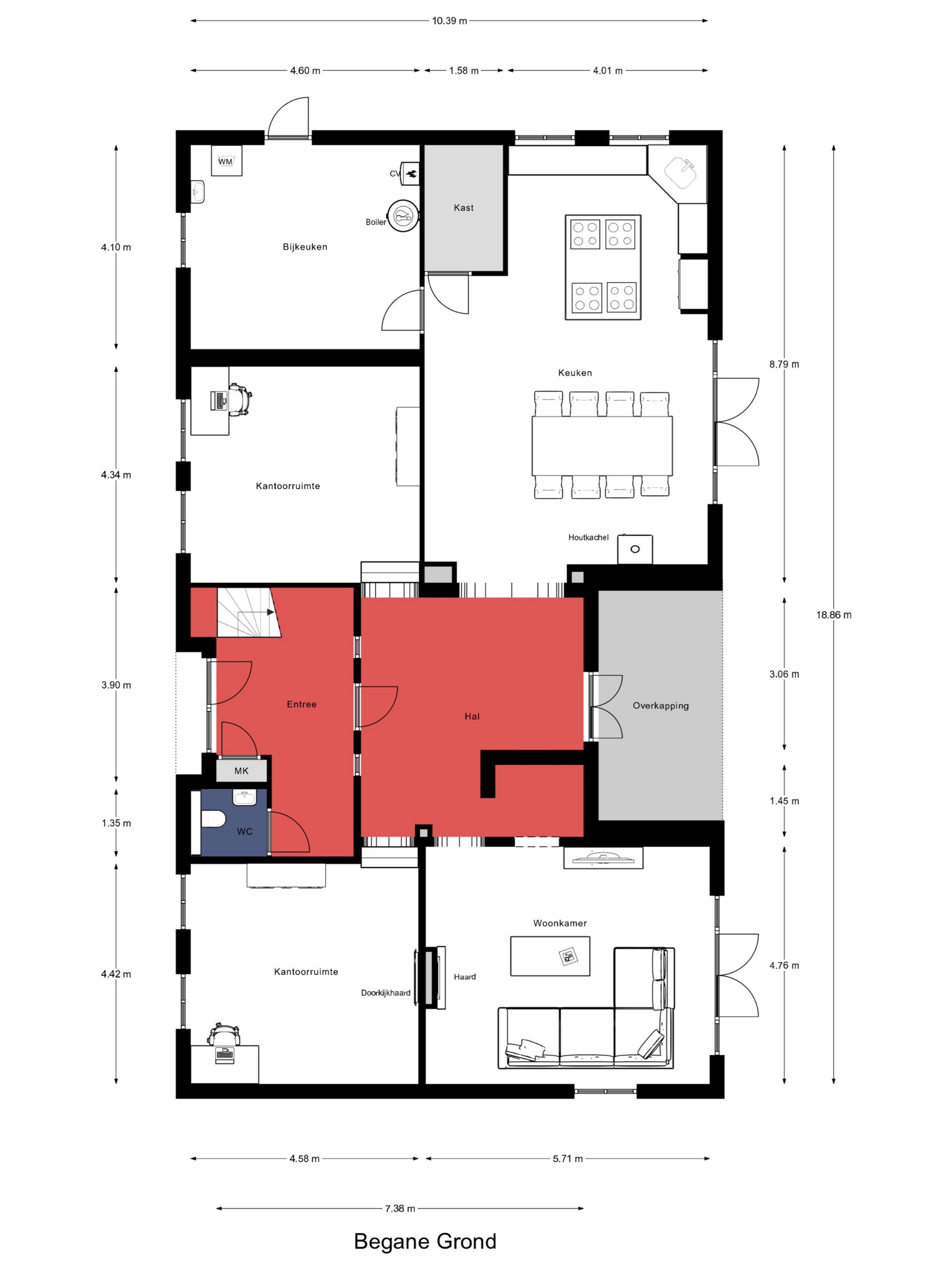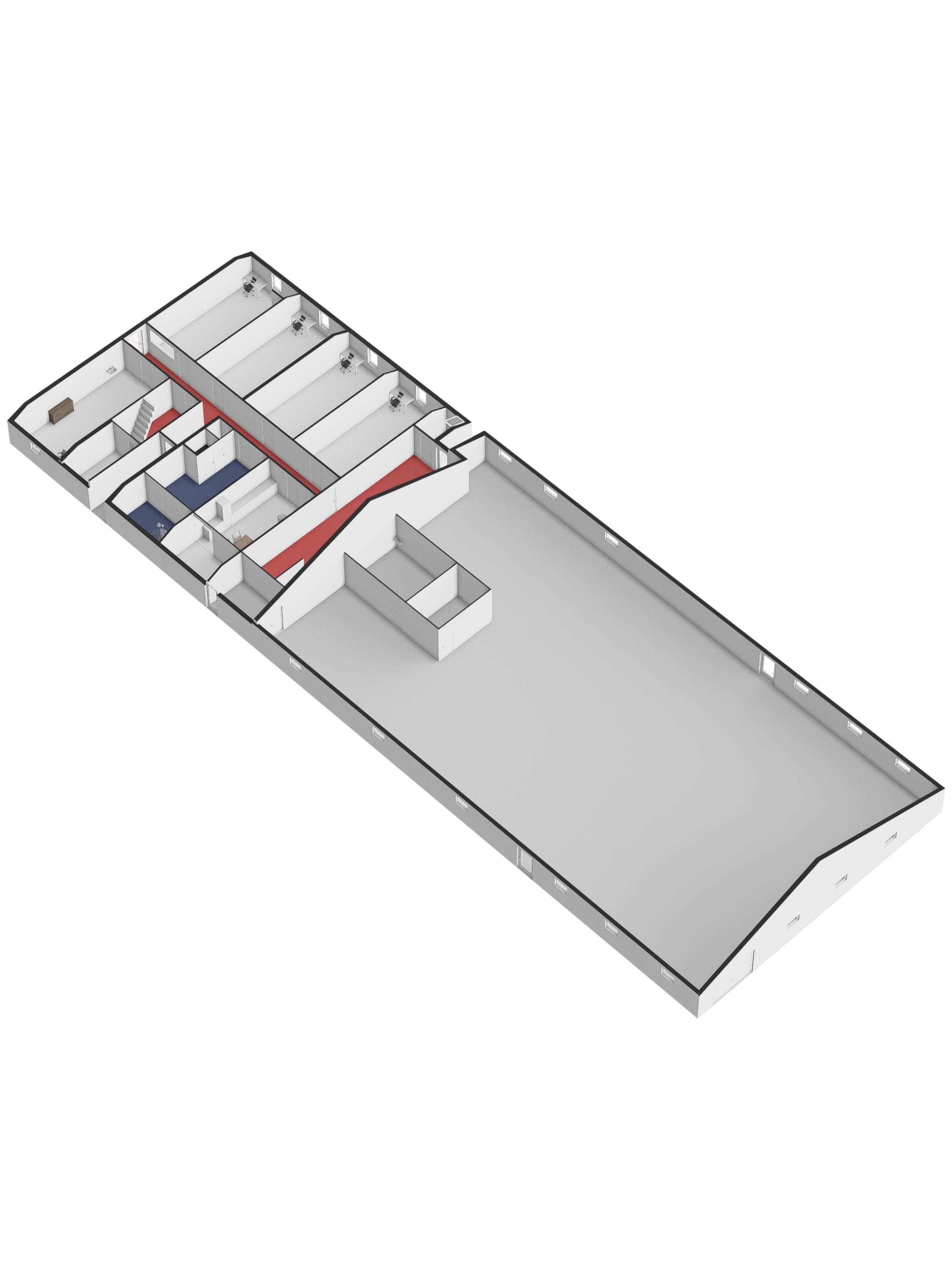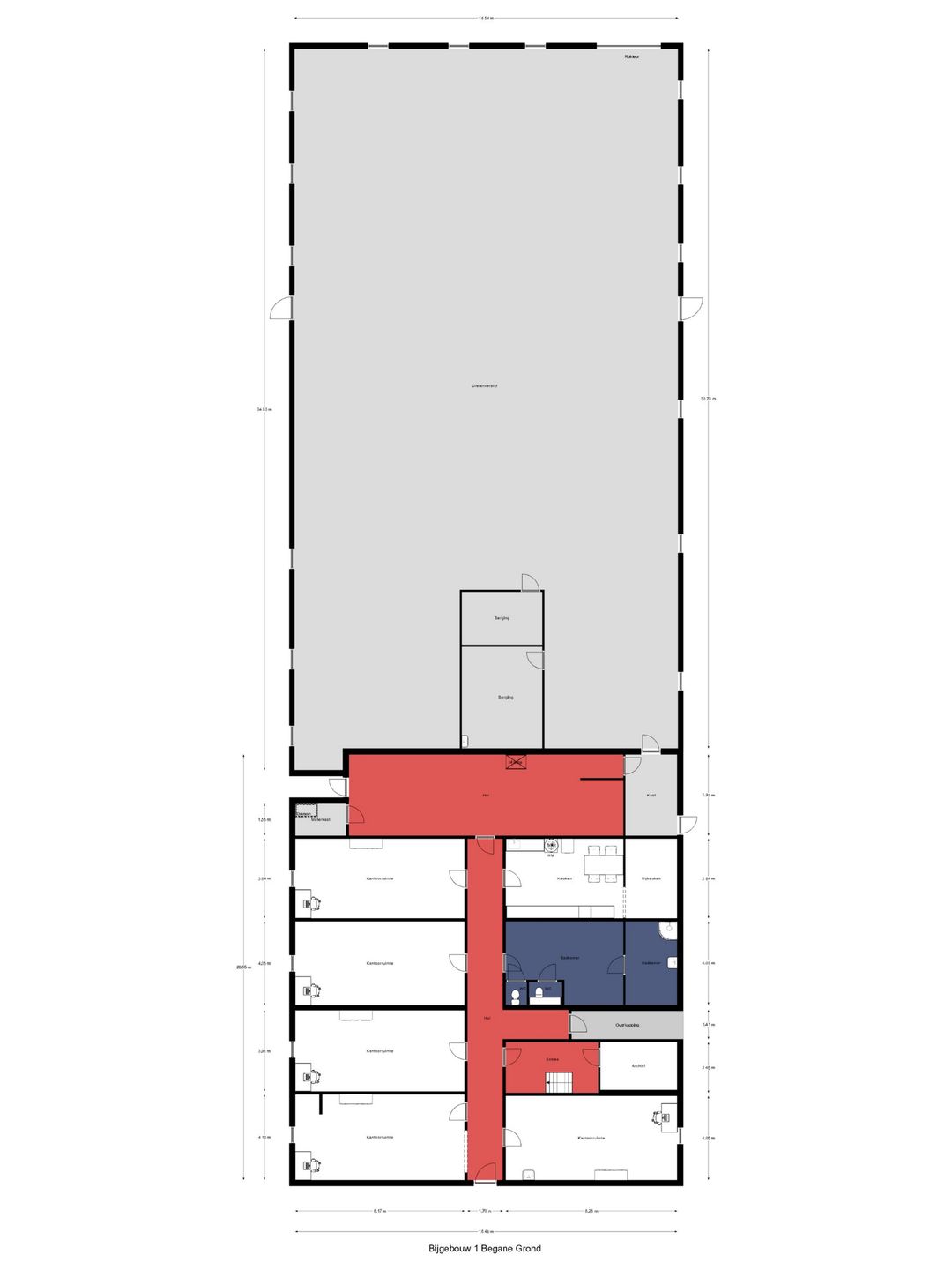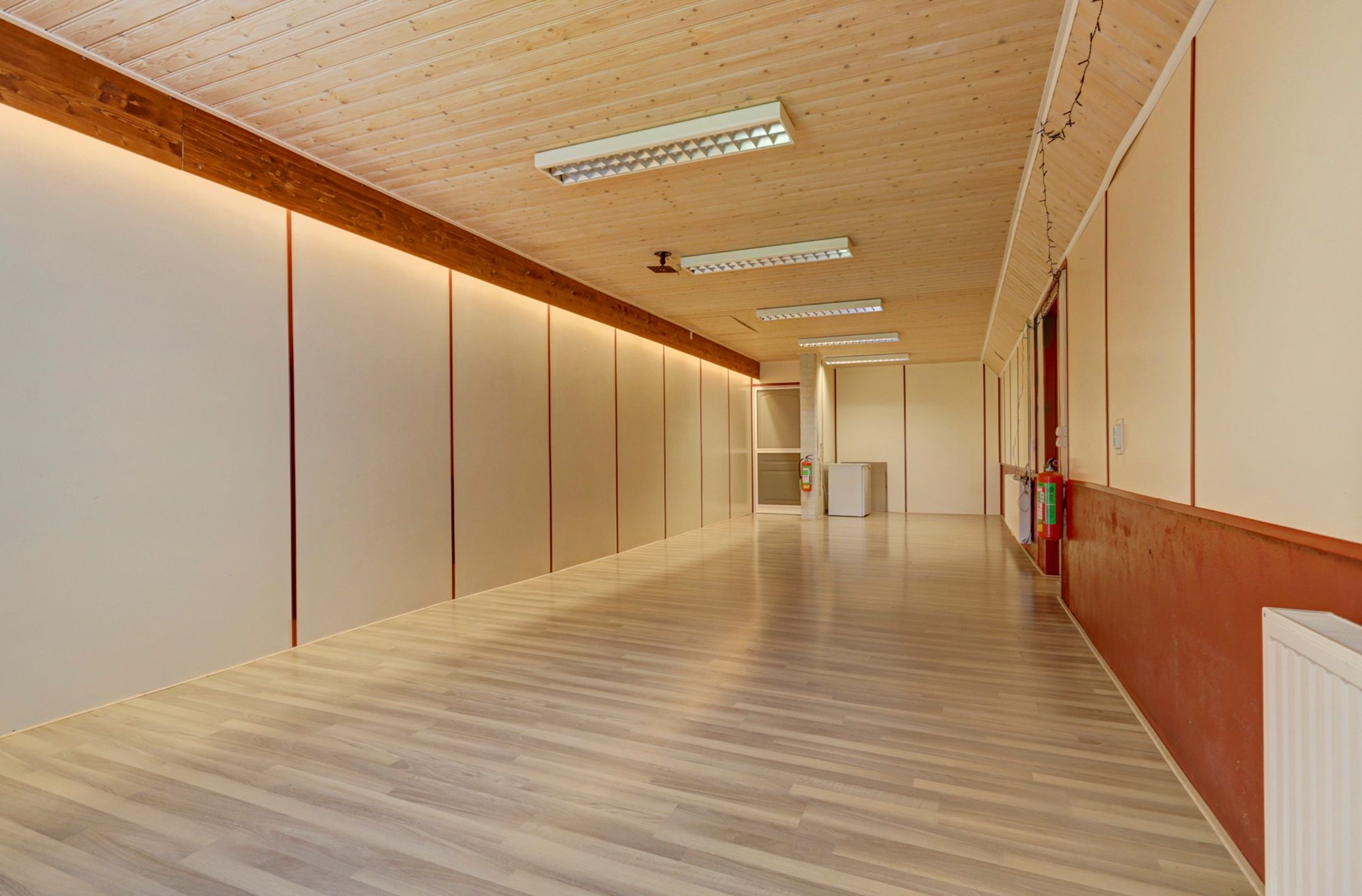 De praktijkruimte heeft een eigen ingang die je via een beklinkerd pad met beukenhaag kunt bereiken. Om de privacy in de achtertuin te behouden is er een muur gemetseld die begroeid is met druivenstruiken en blauwe regen. De praktijkruimte bestaat uit een receptie, vier behandelkamers, een wachtruimte met twee toiletten en doucheruimte en een archief. In de keuken is een keukenblok, ruimte voor een fornuis, een Daalderop boiler van 120 liter, witgoedaansluitingen en een koelcel. Helemaal achterin ligt een groepsruimte met een eigen uitgang en een plek voor de meterkast, de CV ketel en de omvormer van de zonnepanelen. Boven het complex ligt nog een complete zolder die met een vaste trap te bereiken is en bestaat uit vier ruimtes die elk beschikken over een airco die kan koelen en verwarmen. Een kleine deur zorgt ervoor dat je in geval van nood via het dak de zolder kunt verlaten.