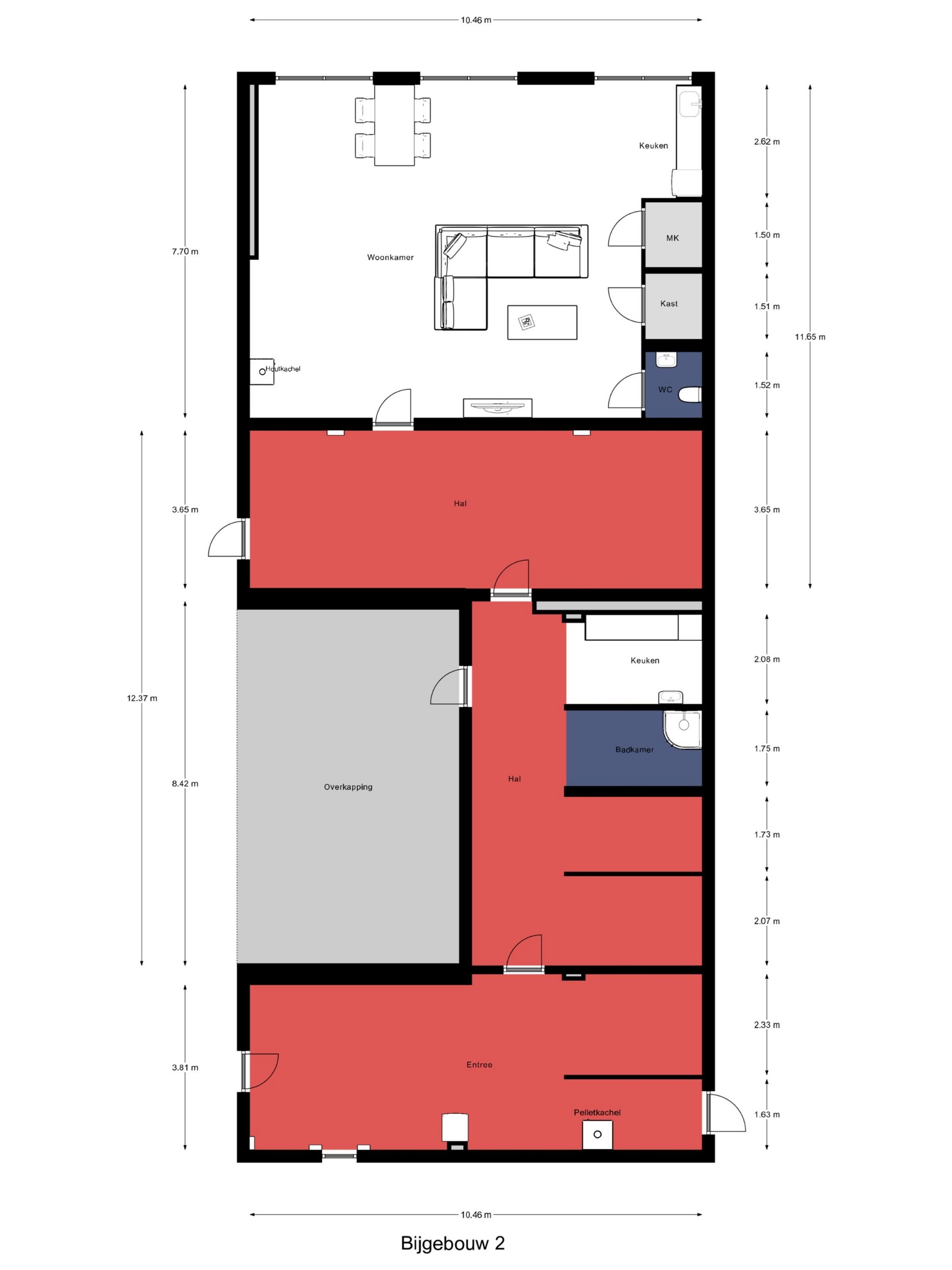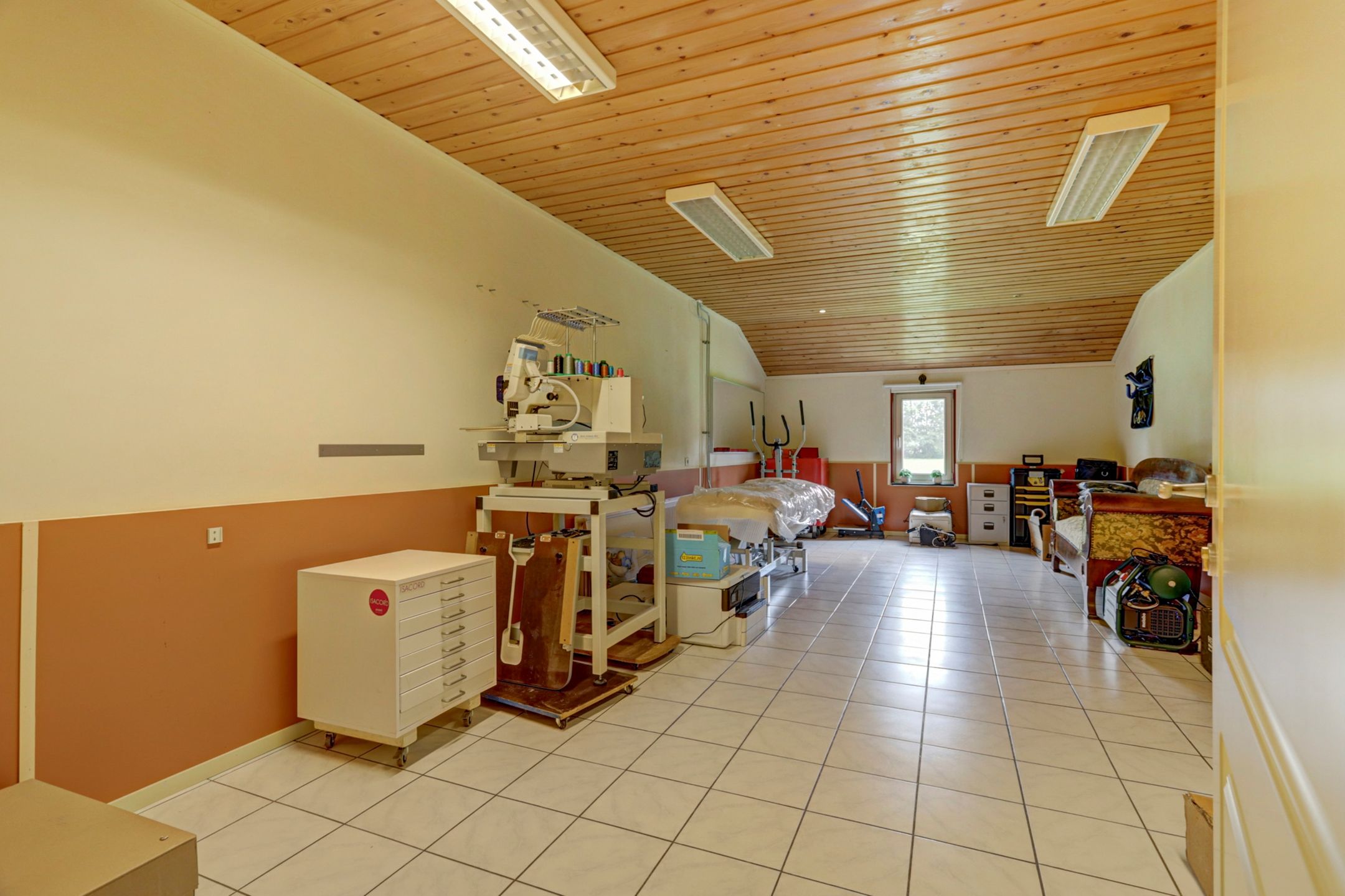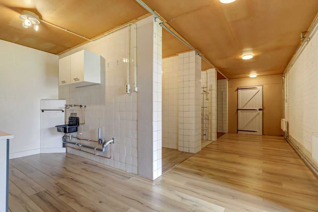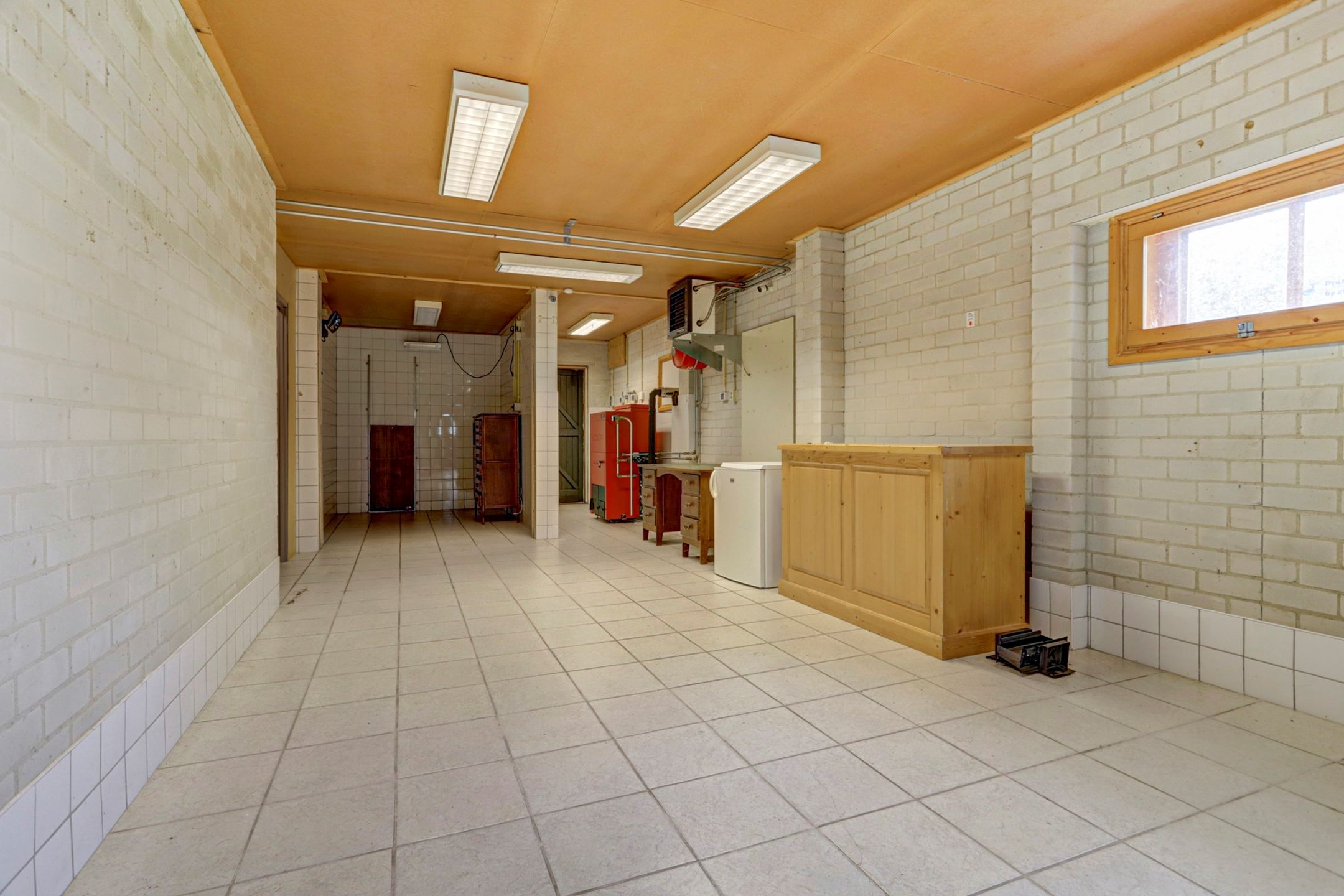 De voormalige varkensstal ligt een stuk achter de woning en een groot gedeelte wordt als opslag gebruikt. In dit gedeelte hebben ook jarenlang paarden gestaan waardoor er een zadelkamer aanwezig is en een werkplaats. In een hoek staat een enorme diepvriescel die wel nog even nagekeken moet worden om hem weer werkend te krijgen. Onder dit gedeelte van de stal ligt een gierkelder. Naast de normale stroomvoorziening is er ook krachtstroom aanwezig. De waterleiding die van de stal naar het bijgebouw loopt is bovengronds en van elektrische draad voorzien om bevriezing te voorkomen.