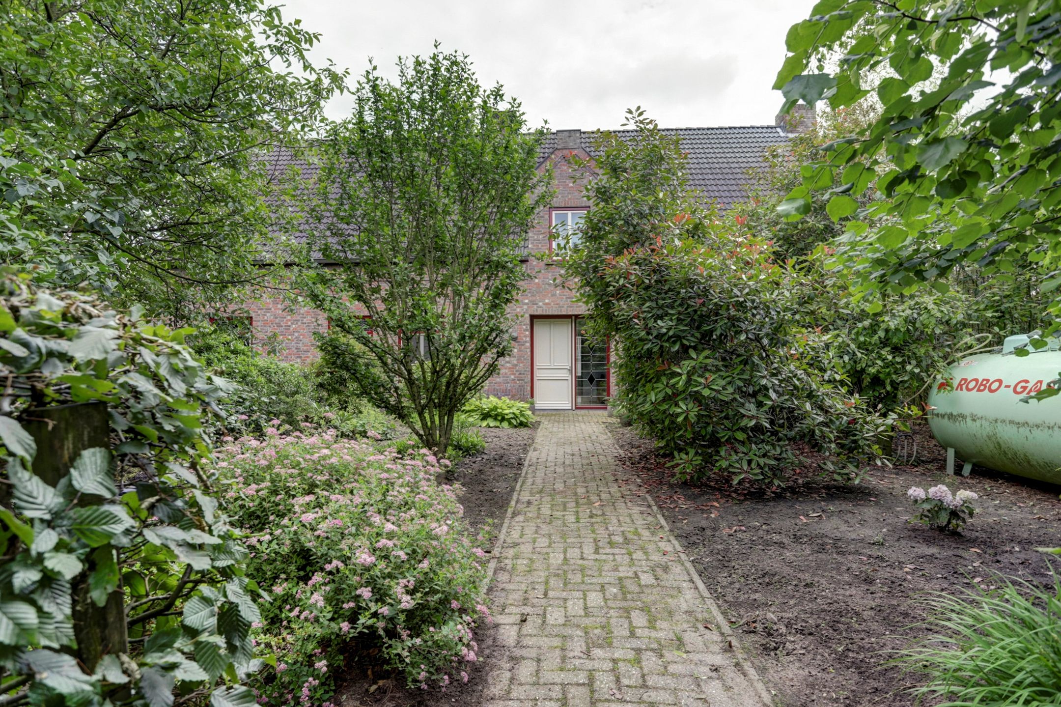 De tuin die direct achter de woning ligt is als het ware afgescheiden van de rest van het perceel. Om een soort Carréboerderijsfeer te creëren is dit gedeelte bijna helemaal ommuurd en op deze manier wordt ook de privacy gewaarborgd als er klanten van de praktijk of hondenschool op het terrein komen. Het grootste gedeelte van de tuin bestaat uit gazon waarop twee hondenrennen zijn gemaakt. Aan de zijkant van het huis ligt een groot terras en direct achter de woning is een open haard gemaakt die wel even wat aandacht nodig heeft. Er is ook een houtopslag aanwezig. De rest van het perceel is opgedeeld in diverse weilanden en geheel omzoomd met bomen en struiken. In een van de weilanden staan verschillende fruitbomen, waaronder appelbomen, perenbomen, kersenbomen, pruimenbomen en notenbomen. In het weiland voor de woning ligt een enorme vijver. Het hele perceel is omheind behalve een klein stukje bos dat helemaal vooraan op het perceel ligt. De sloot langs de omheining hoort ook nog bij het perceel en moet onderhouden worden. Bij de parkeerplaats voor de woning ligt het pomphuis met de 70 meter diepe grondwaterpomp die dient als de watervoorziening van het hele terrein.