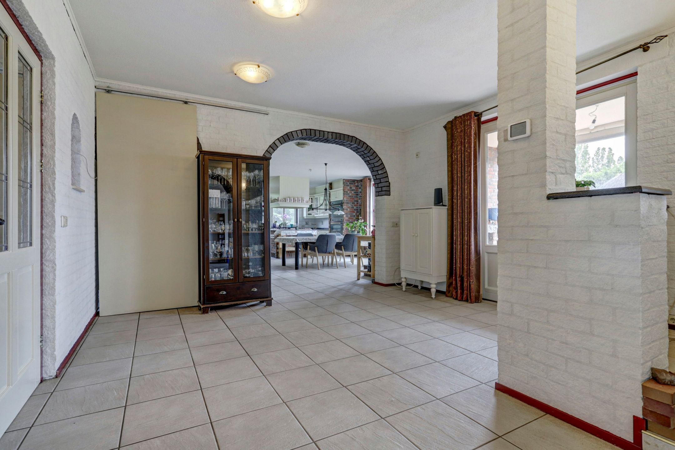 Via de deur met glas in lood loop je naar het woongedeelte waar alle ruimtes in open verbinding met elkaar staan. Over de gehele begane grond ligt een tegelvloer in een neutrale kleur en vloerverwarming. Aan de rechterkant ligt een ruime woonkamer met een doorkijkhaard in een grote schouw. Via dubbel openslaande deuren heb je direct contact met de tuin. BIBLIOTHEEK