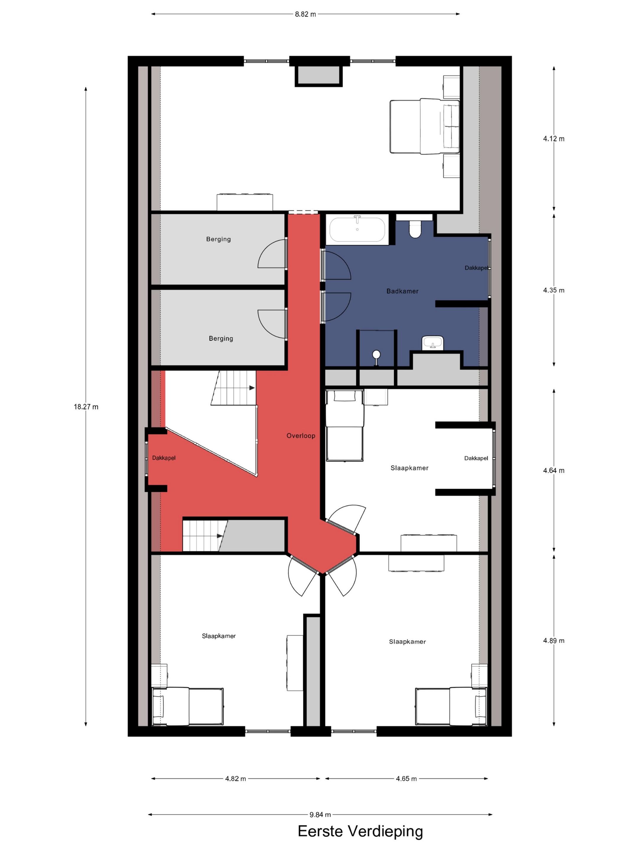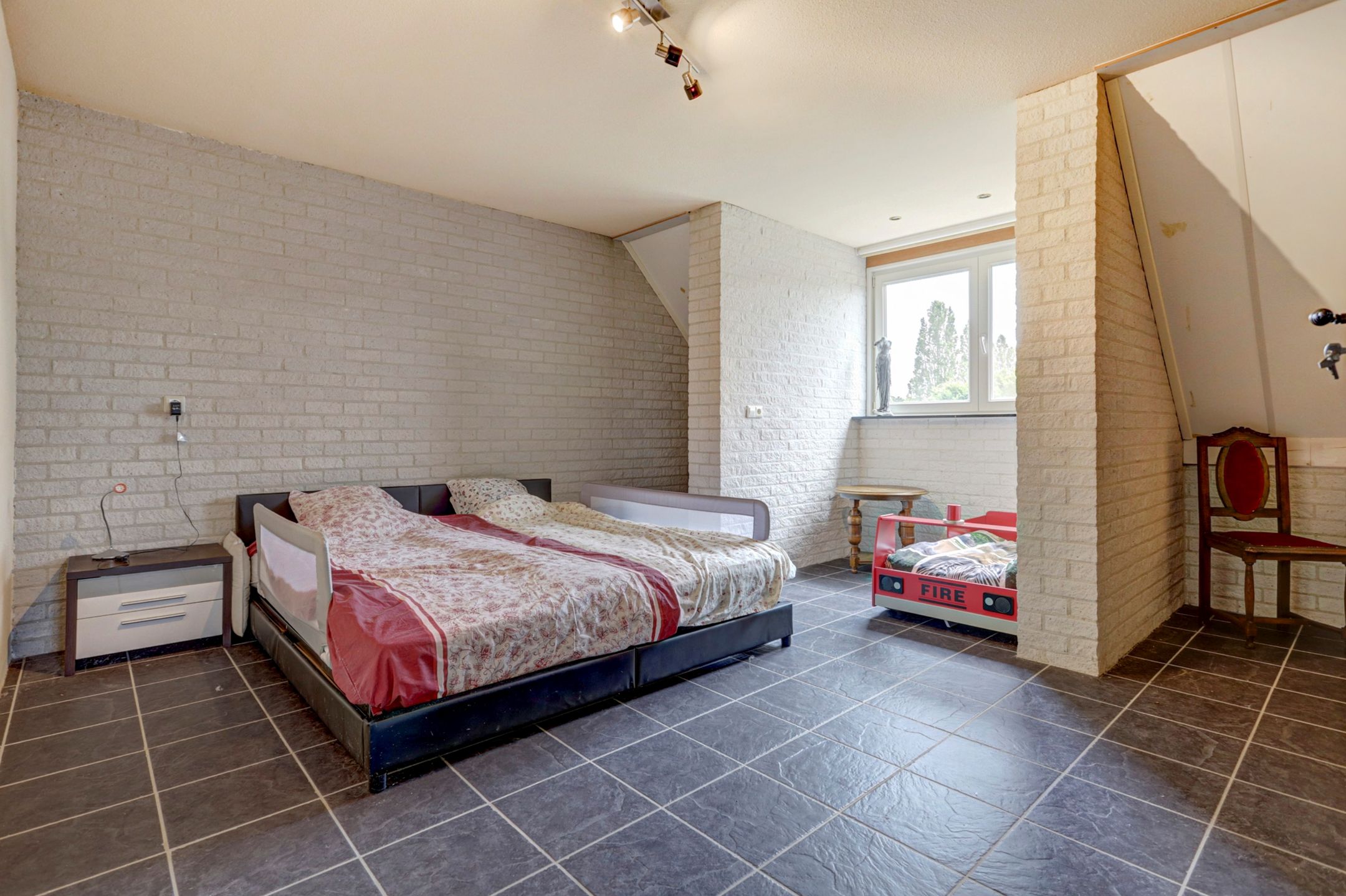 De grootste slaapkamer ligt aan de linkerkant van de woning en verdient de naam masterbedroom. De kamer beslaat de volle lengte van de woning en heeft een eigen inloopkast. Als je hier ’s avonds je kleren uittrekt gooi je ze via de stortkoker naar beneden in de bijkeuken waar de wasmachine staat.