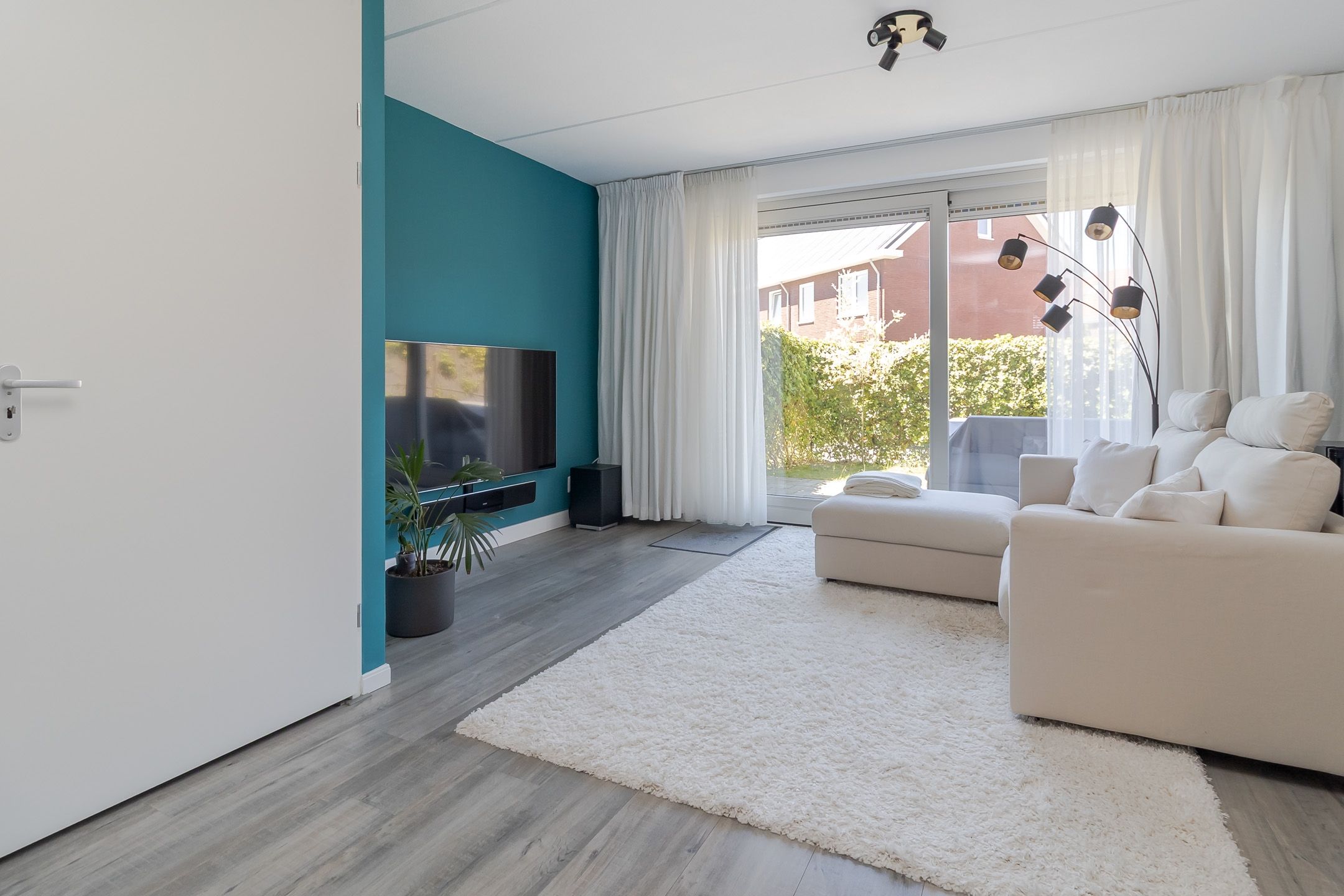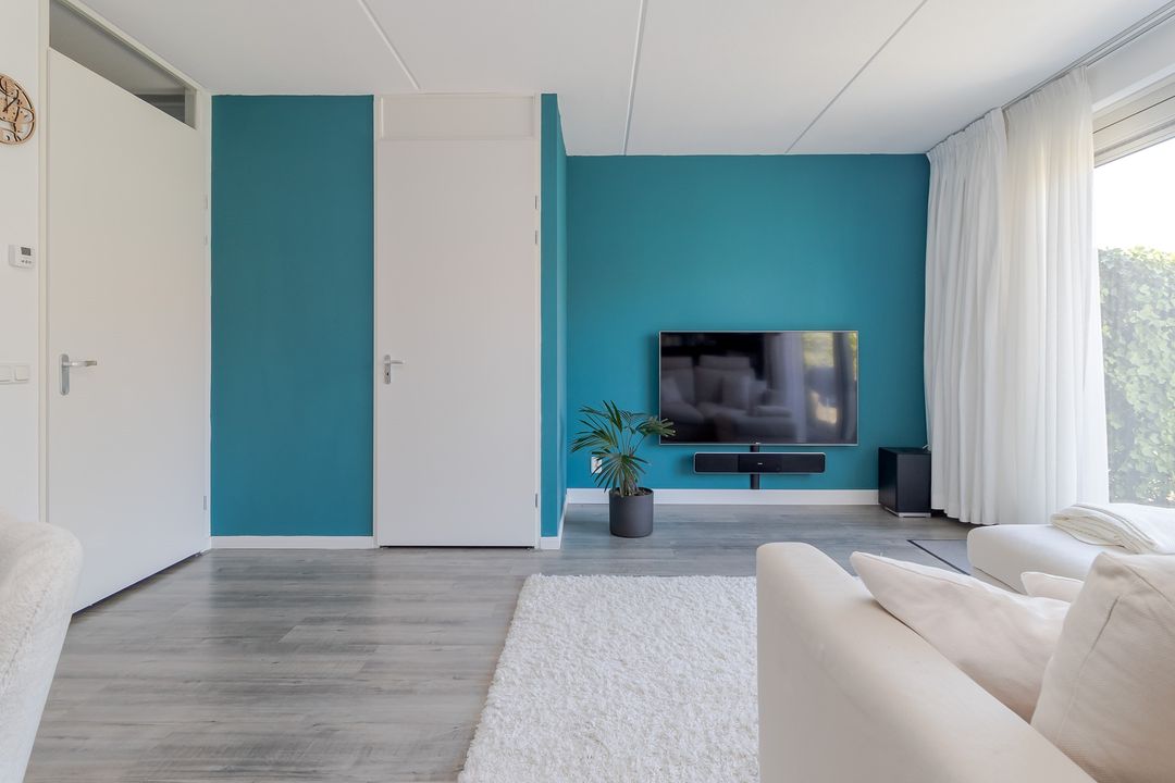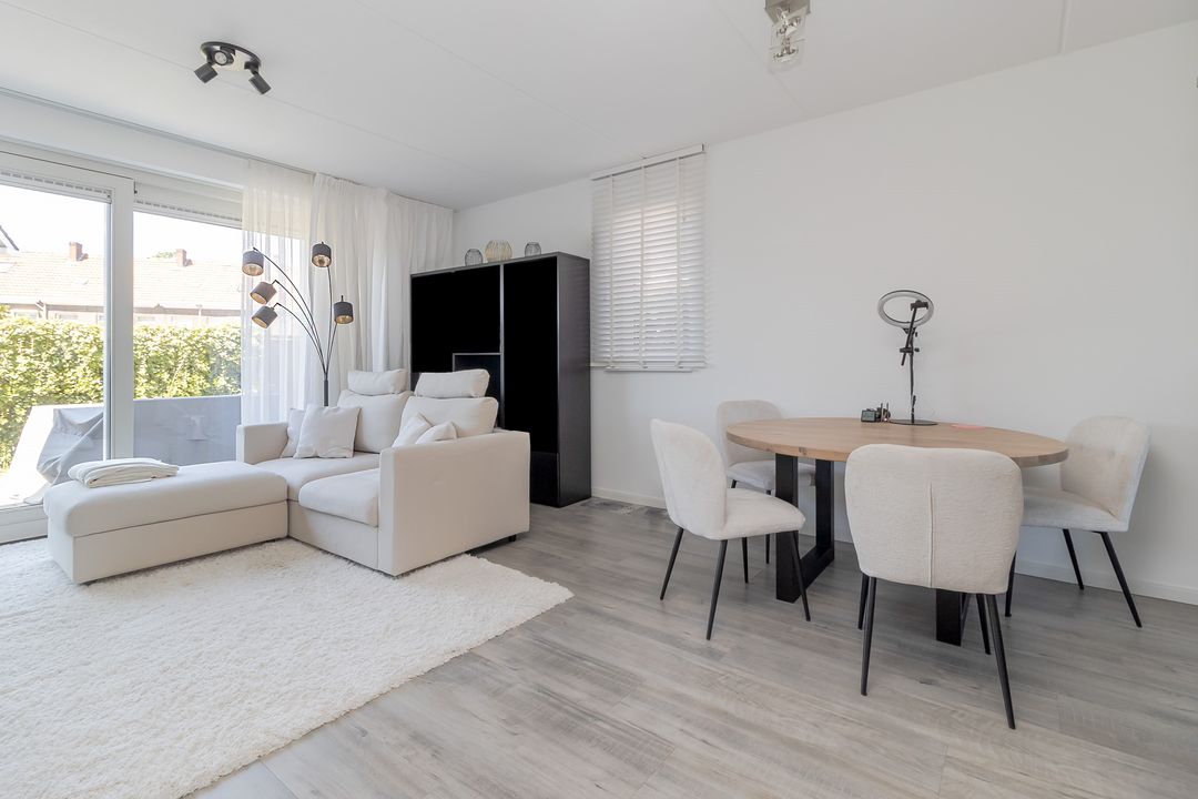 De woonkamer is licht en ruim. Aan de achterkant zorgt een grote schuifpui voor veel daglicht en zicht op de tuin en het terras. Onder de trap zit een handige bergkast. De laminaatvloer en strakke muren geven een neutrale, verzorgde basis.