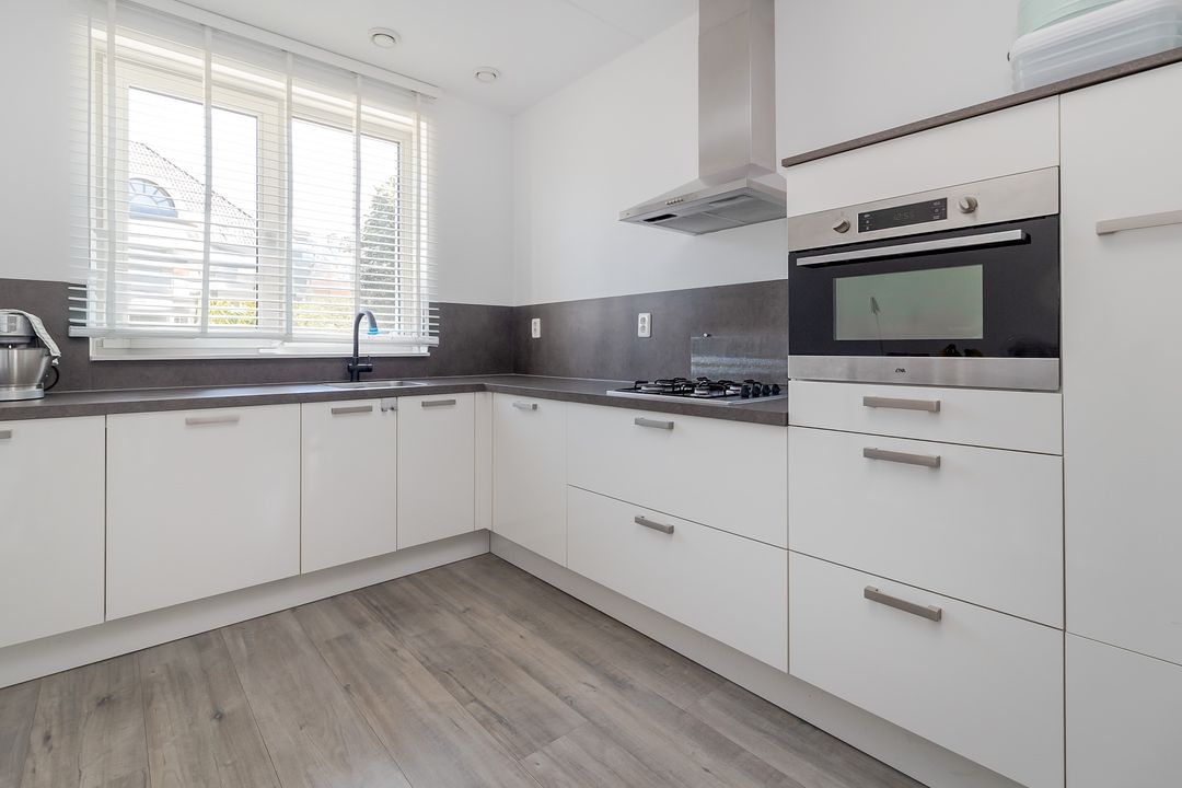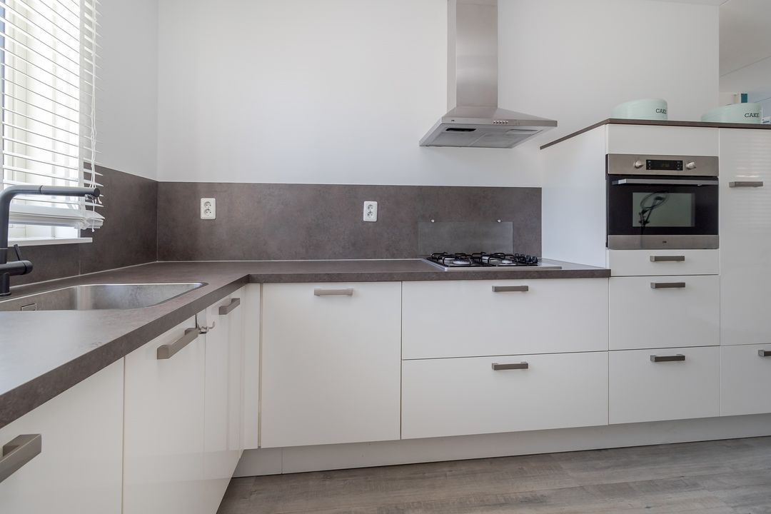 Aansluitend vind je de halfopen keuken. Wit, modern en compleet ingericht met: