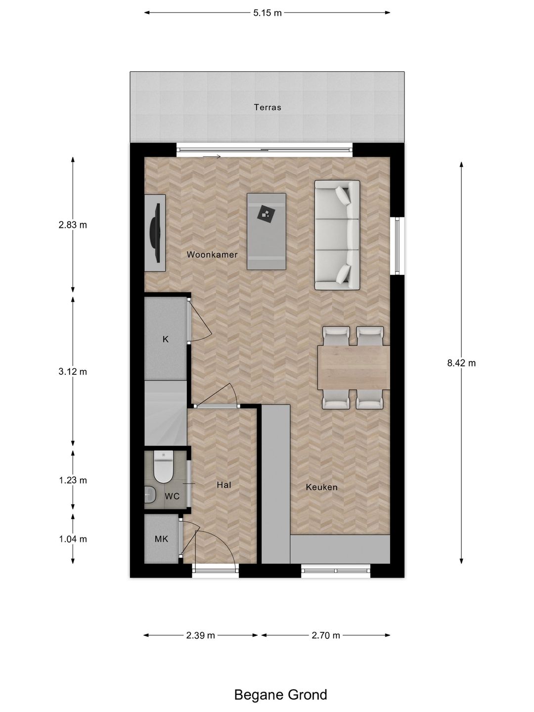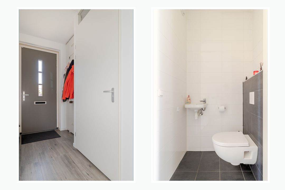 Via de voordeur kom je in de hal. Hier vind je het toilet, de meterkast, de trap naar boven en de toegang tot de woonkamer.