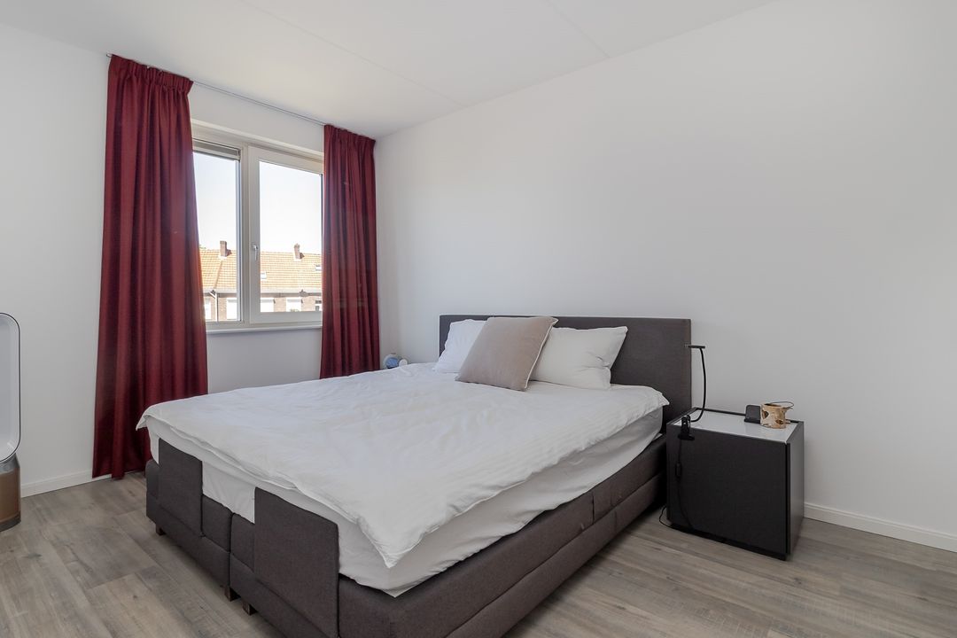 Aan de achterkant ligt de grootste slaapkamer. Twee ramen zorgen voor veel licht en een ruimtelijk gevoel. Er is genoeg plek voor een grote kledingkast.