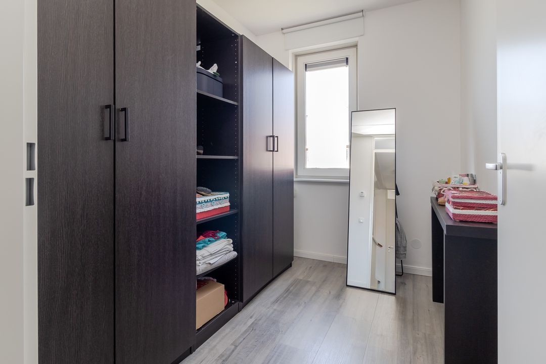 De kleinste kamer ligt ook aan de achterkant. Nu ingericht als kleedkamer, maar prima te gebruiken als een normale slaapkamer.