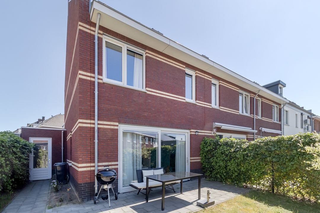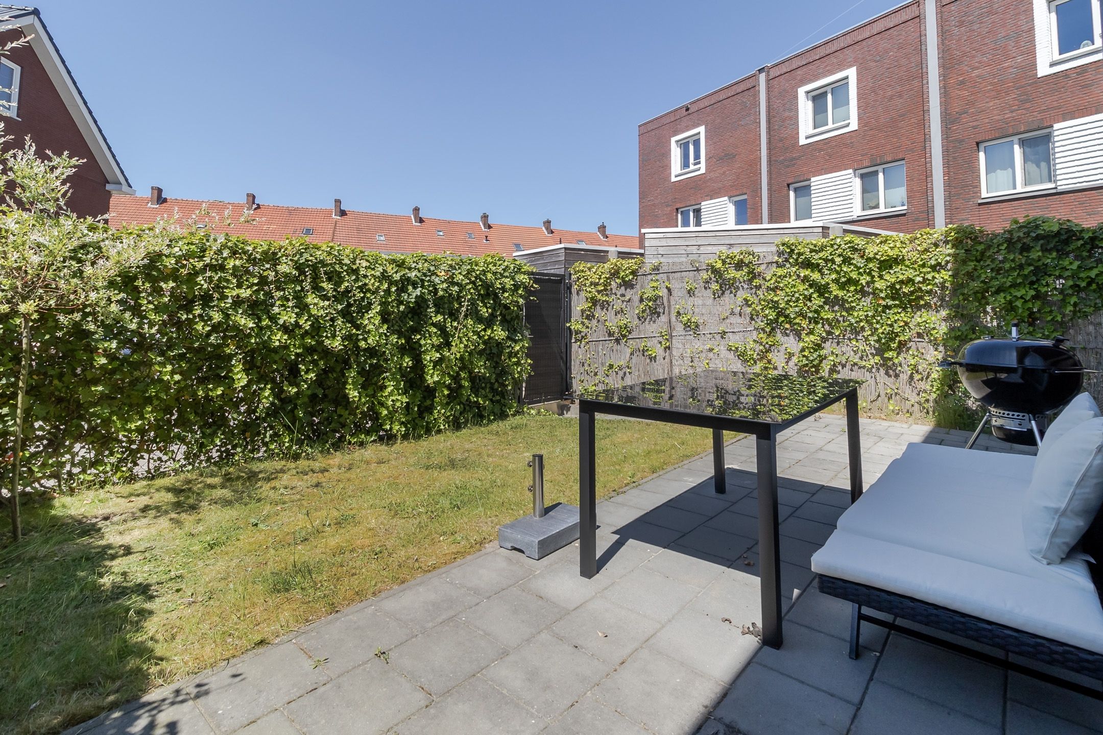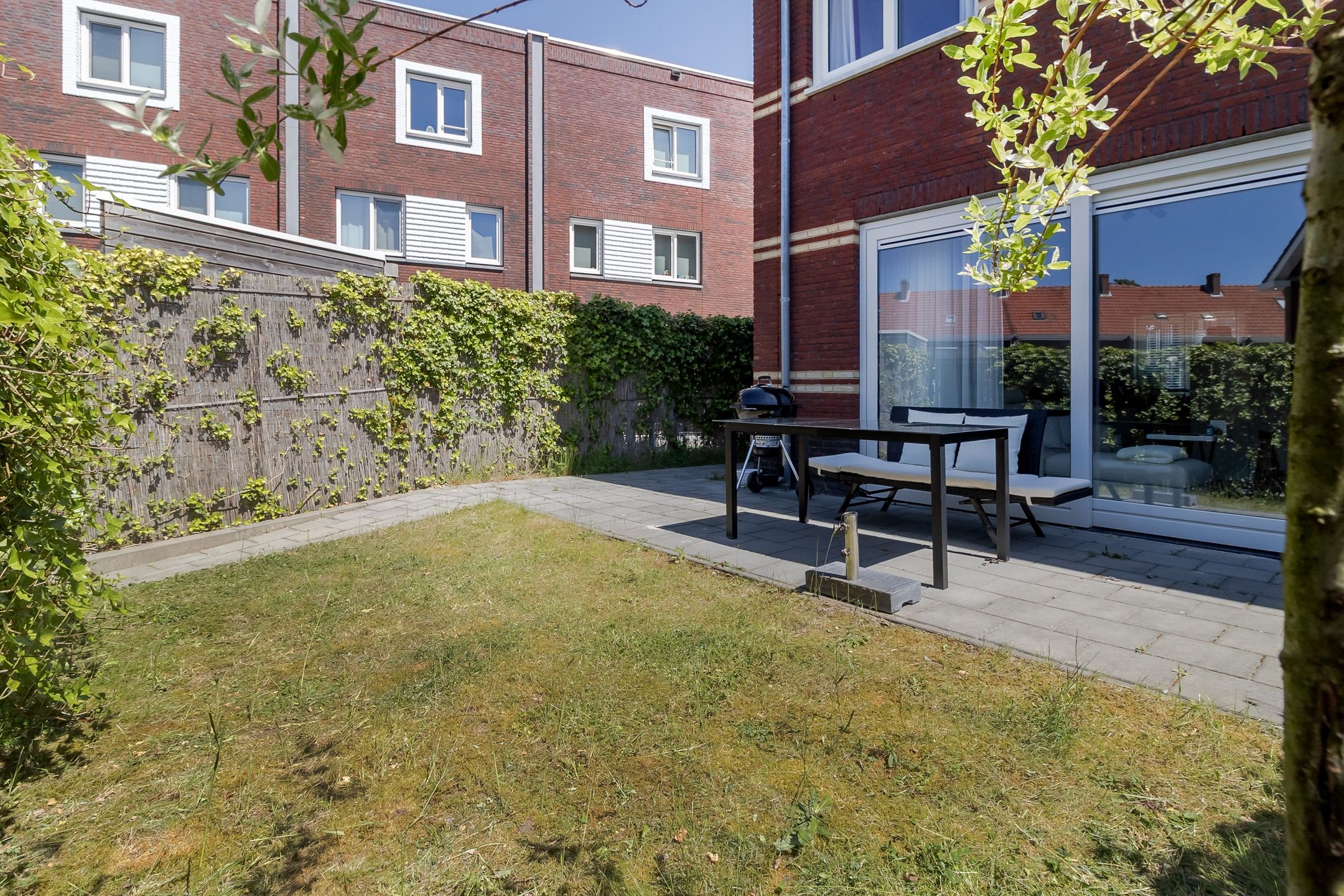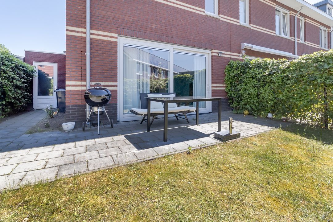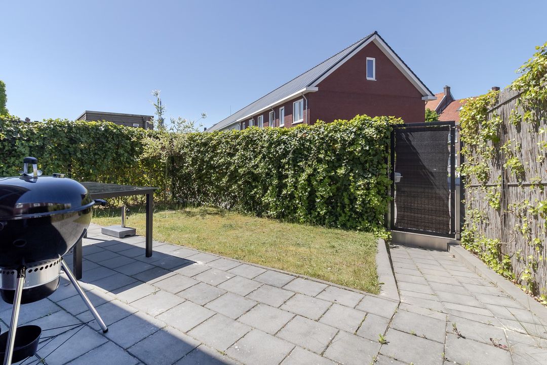 De tuin is eenvoudig maar netjes. Een terras, een stukje gazon en veel mogelijkheden. Je kunt het helemaal naar eigen smaak inrichten. Strak, groen of juist speels? Jij kiest.