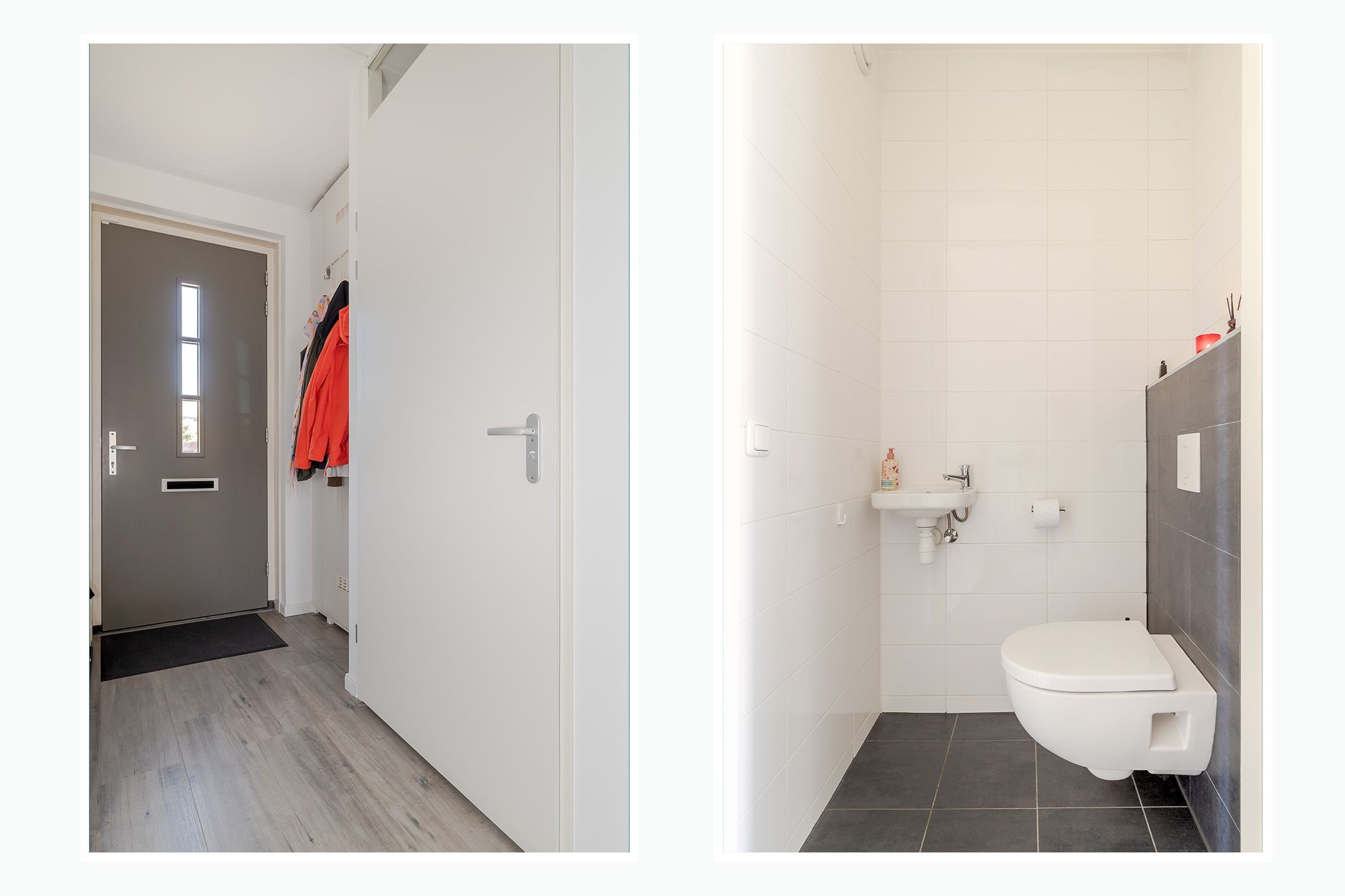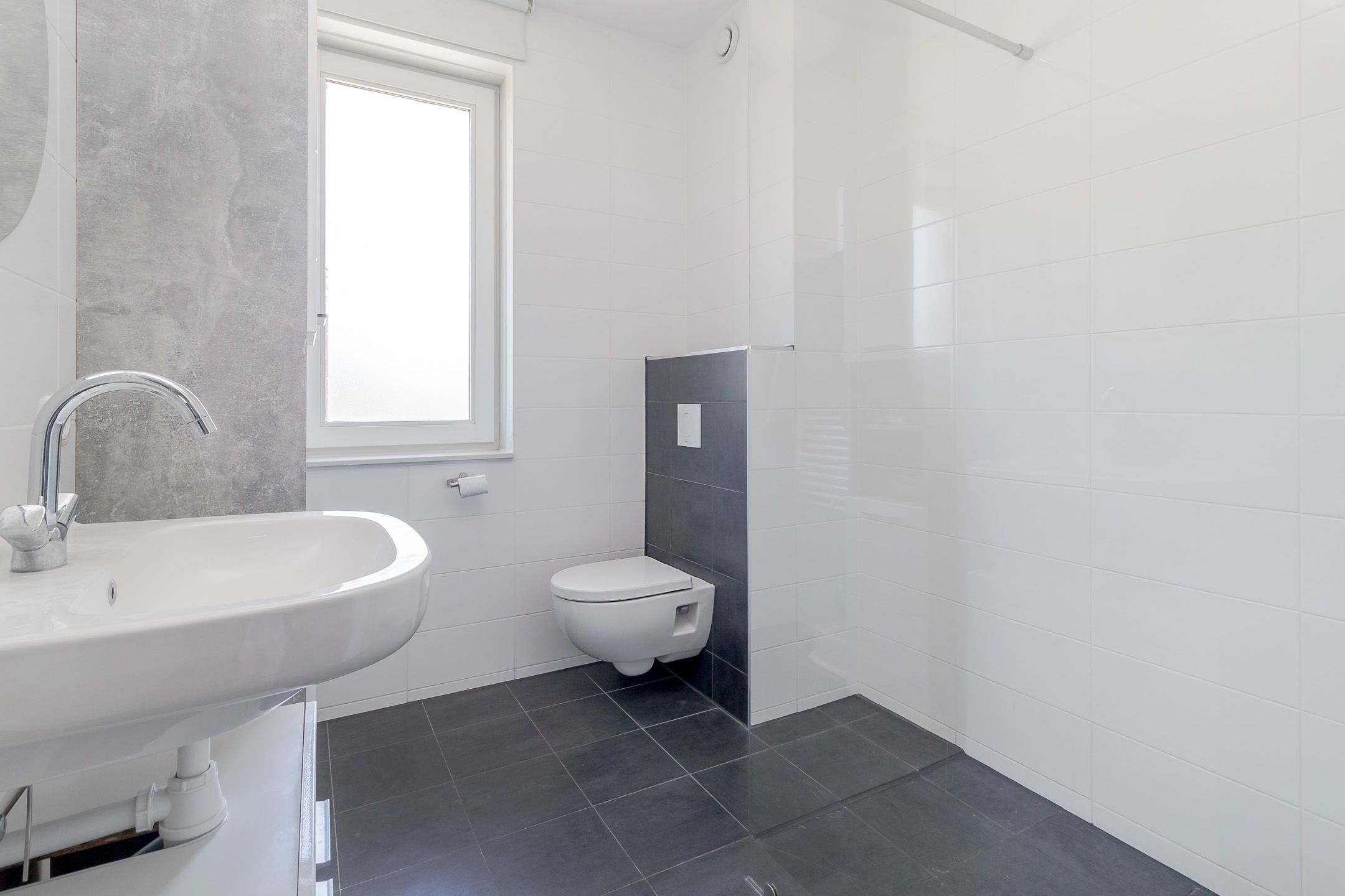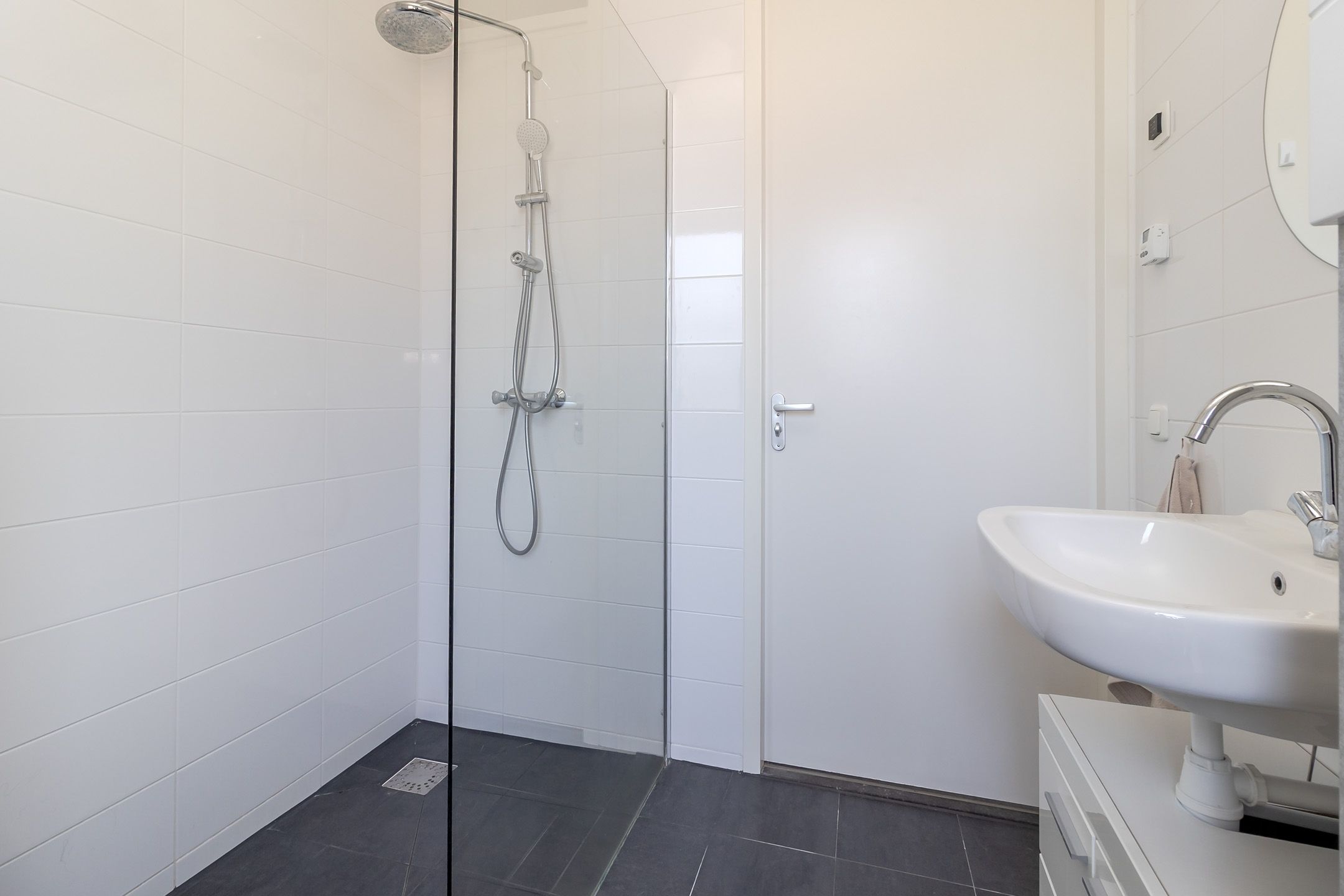 De badkamer is compleet: een extra brede inloopdouche, toilet en wastafel. Witte hoogglans wandtegels en een antracietkleurige vloer zorgen voor een fris contrast. Een fijne badkamer waar je heerlijk je dag begint.