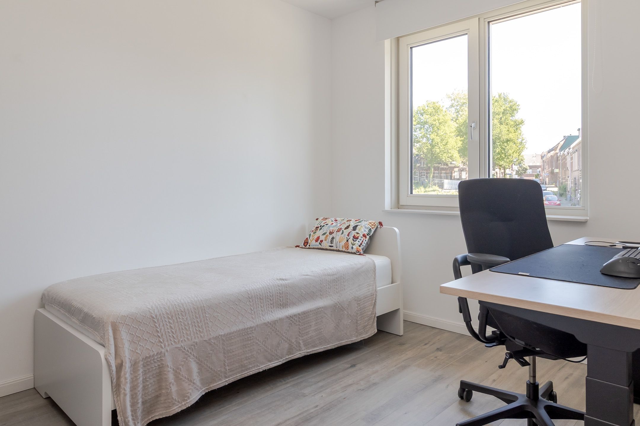 De kamer aan de voorkant doet nu dienst als werk-, studie- of logeerkamer. Natuurlijk kun je deze gewoon gebruiken als slaapkamer.