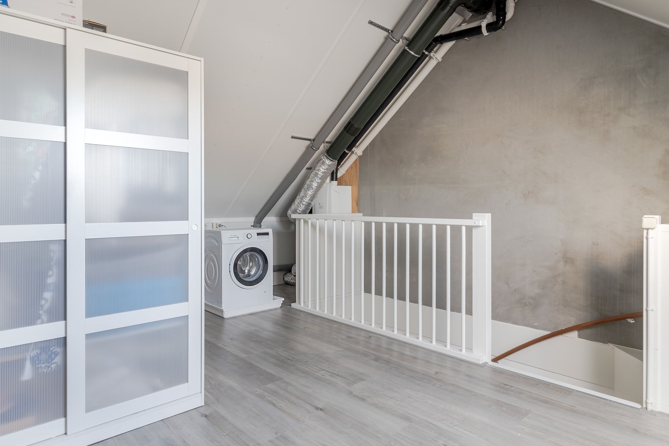Ook de techniek is keurig weggewerkt. Je vindt hier de CV-ketel, de WTW en de regelunit voor 8 zonnepanelen. En de aansluiting voor de wasmachine en droger.