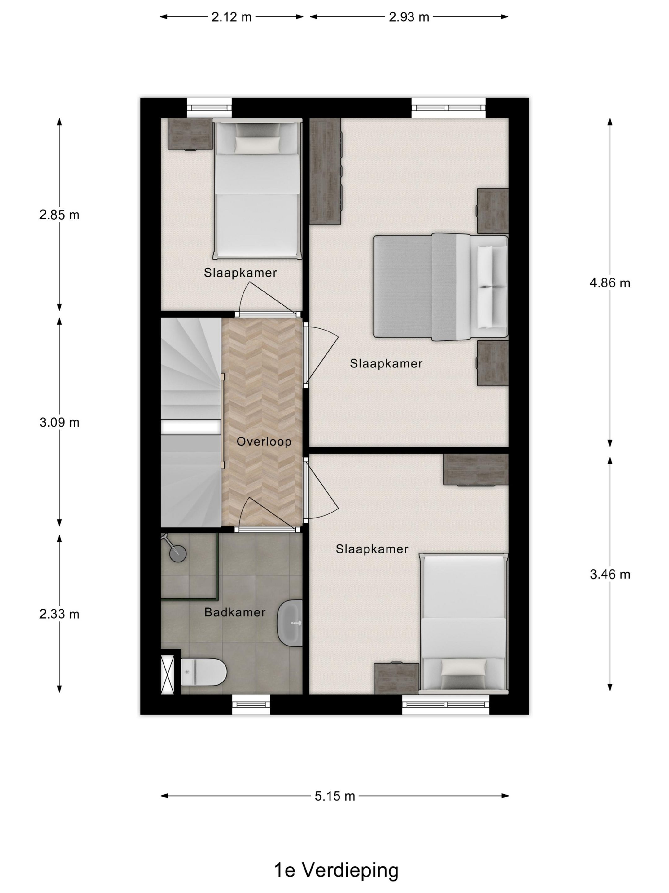 Via de trap in de hal kom je op de eerste verdieping. En via de ruime overloop kom je in de 3 slaapkamers en de badkamer.