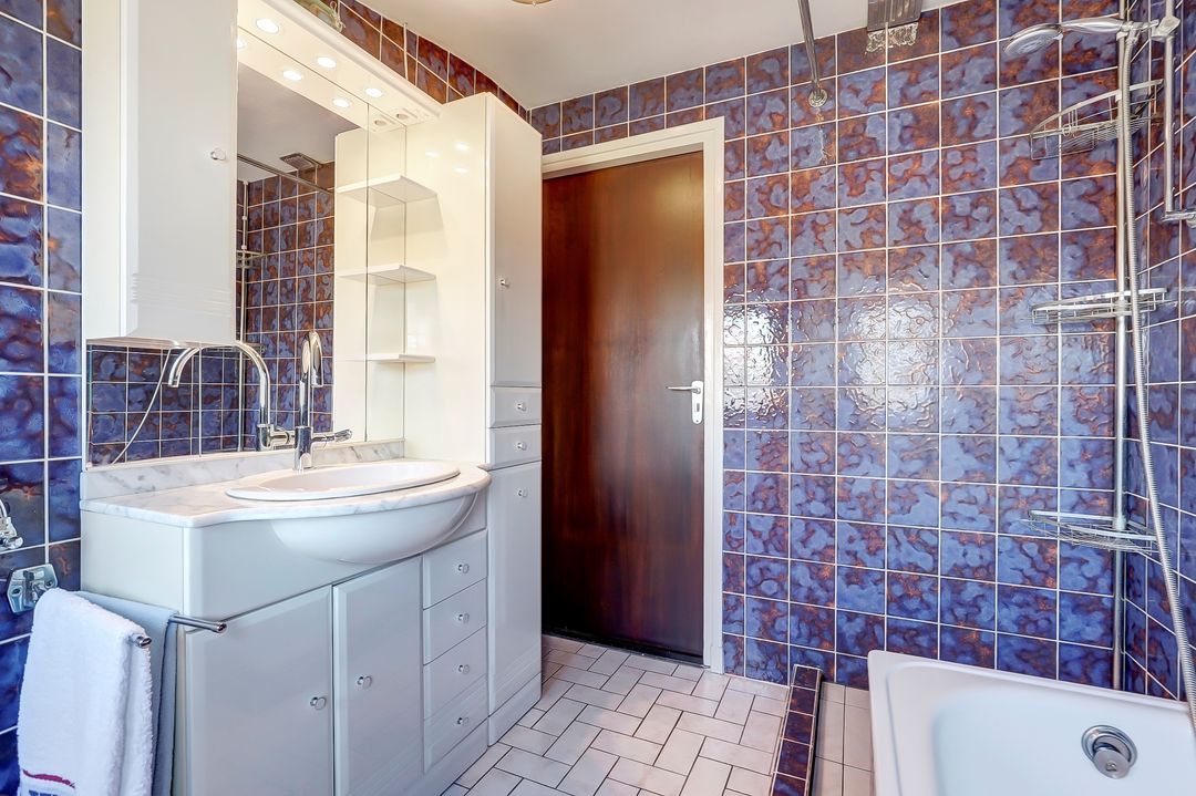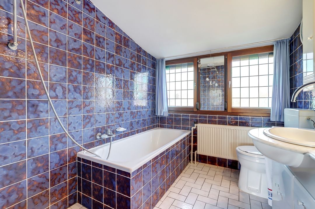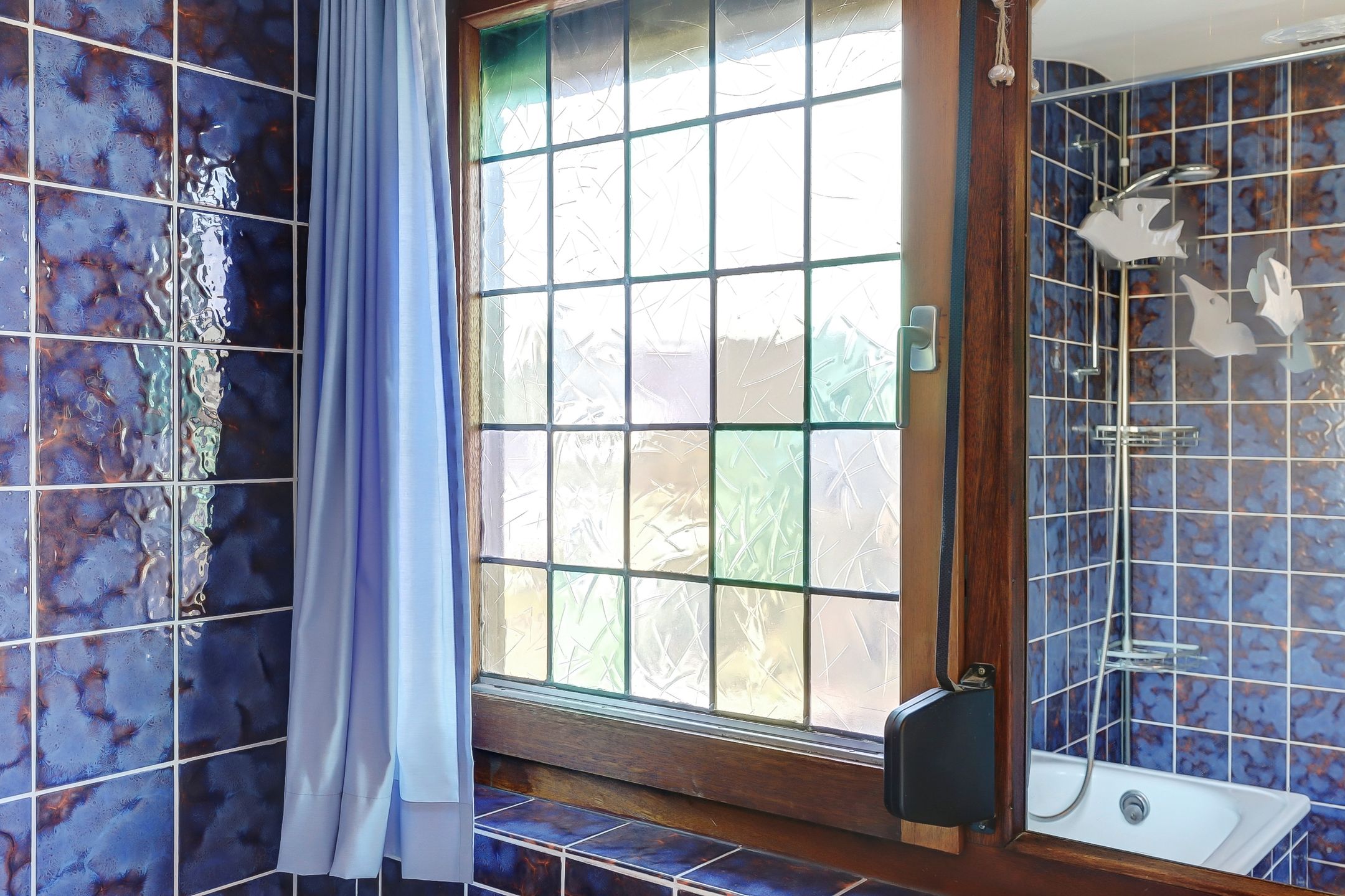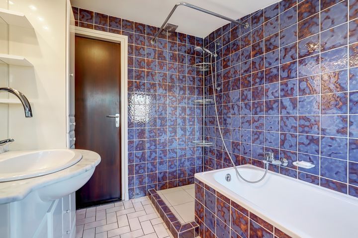 De ruime badkamer is van alle gemakken voorzien, met een douche, ligbad, toilet en wasbak. De dakkapel beschikt over glas-in-loodramen en het gekleurde licht dat hierdoor naar binnen valt voorziet de ruimte van een fijne sfeer. De lichte tegelvloer contrasteert mooi met de blauwe wandtegels met marmerlook. Hoewel de badkamer enigszins gedateerd is, is deze altijd goed onderhouden en functioneel. Alle voorzieningen werken naar behoren, en de ruimte is netjes en verzorgd.