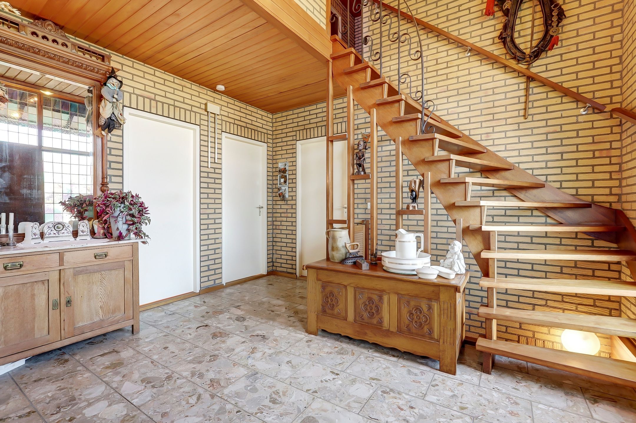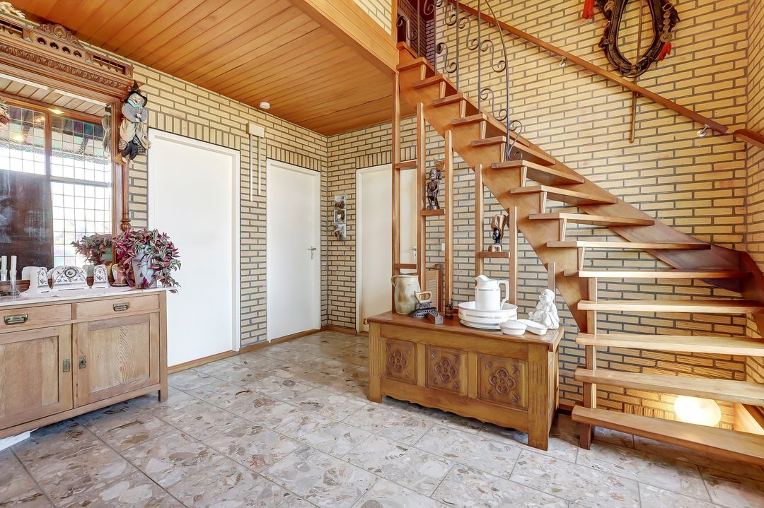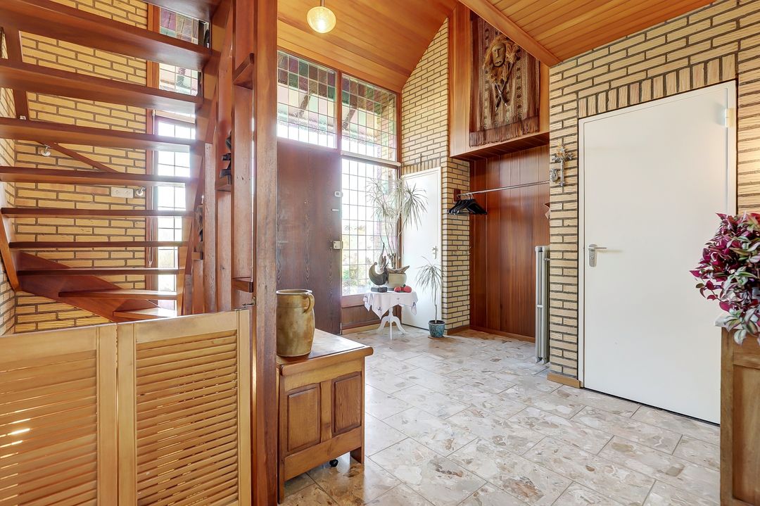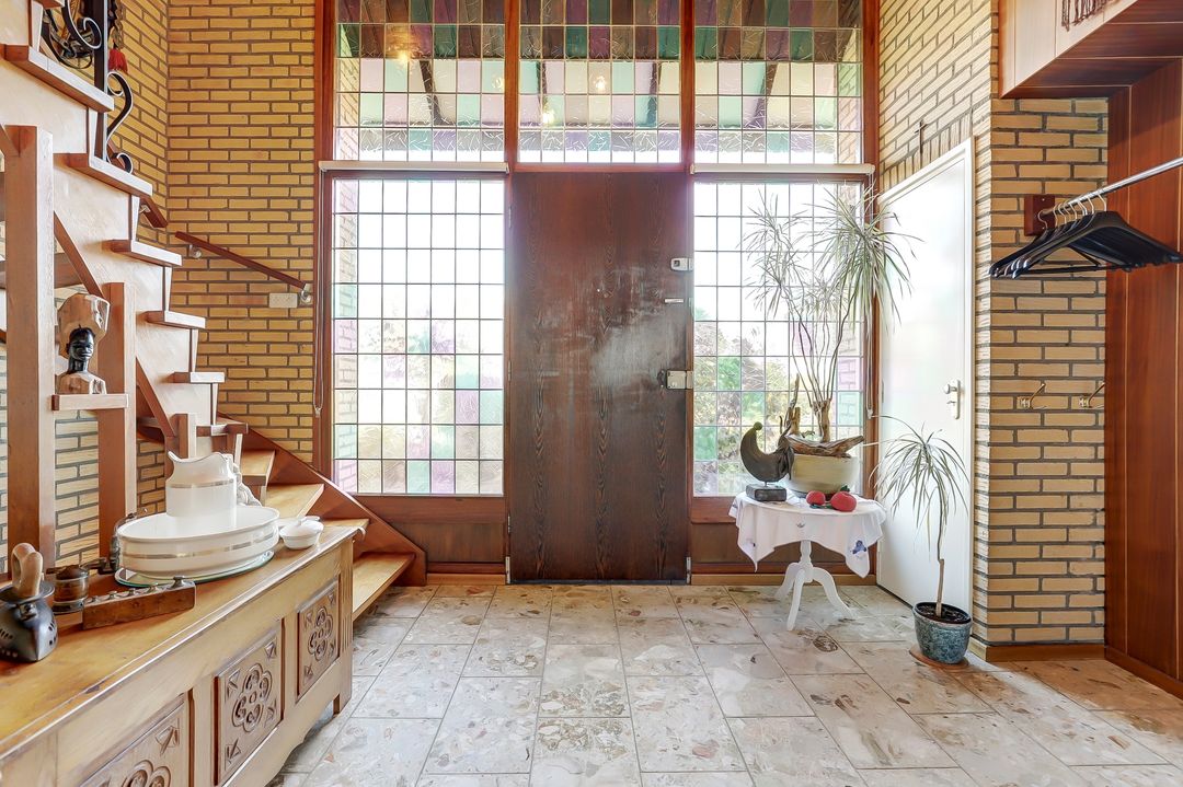 Via een uitnodigend licht oplopend paadje dat zich langs de bloeiende planten door de weelderige voortuin slingert loop je naar de hoger gelegen voordeur. Bij binnenkomst in de ruime ontvangsthal valt direct de lichtinval door de kleurige glas-in-loodramen naast en boven de voordeur op. Vanuit de hal zijn er verschillende deuren die naar de naastgelegen ruimtes leiden: links ligt de toiletruimte, netjes en functioneel ingericht. Recht voor je bevindt zich een slaapkamer of kantoorruimte en aan de rechterkant heb je toegang tot de keuken en de woonkamer. In de hal zijn verder twee trappen te vinden waarvan er eentje naar de verdieping met slaapkamers en badkamer leidt en de andere gaat naar beneden naar het souterrain, ideaal voor opslag of als extra leefruimte.