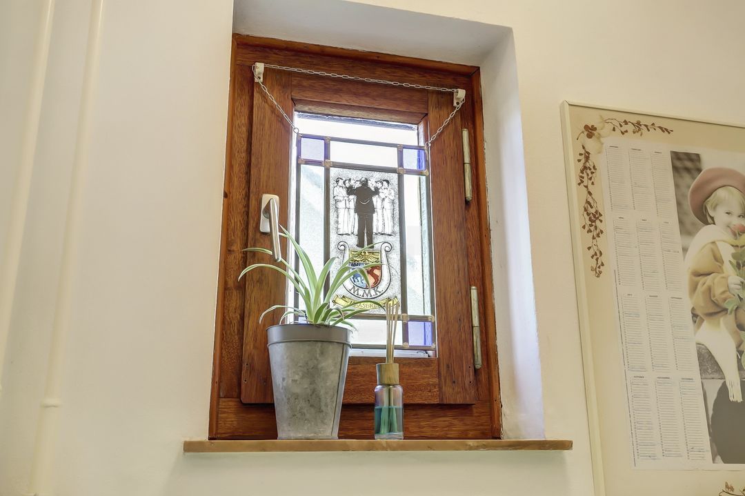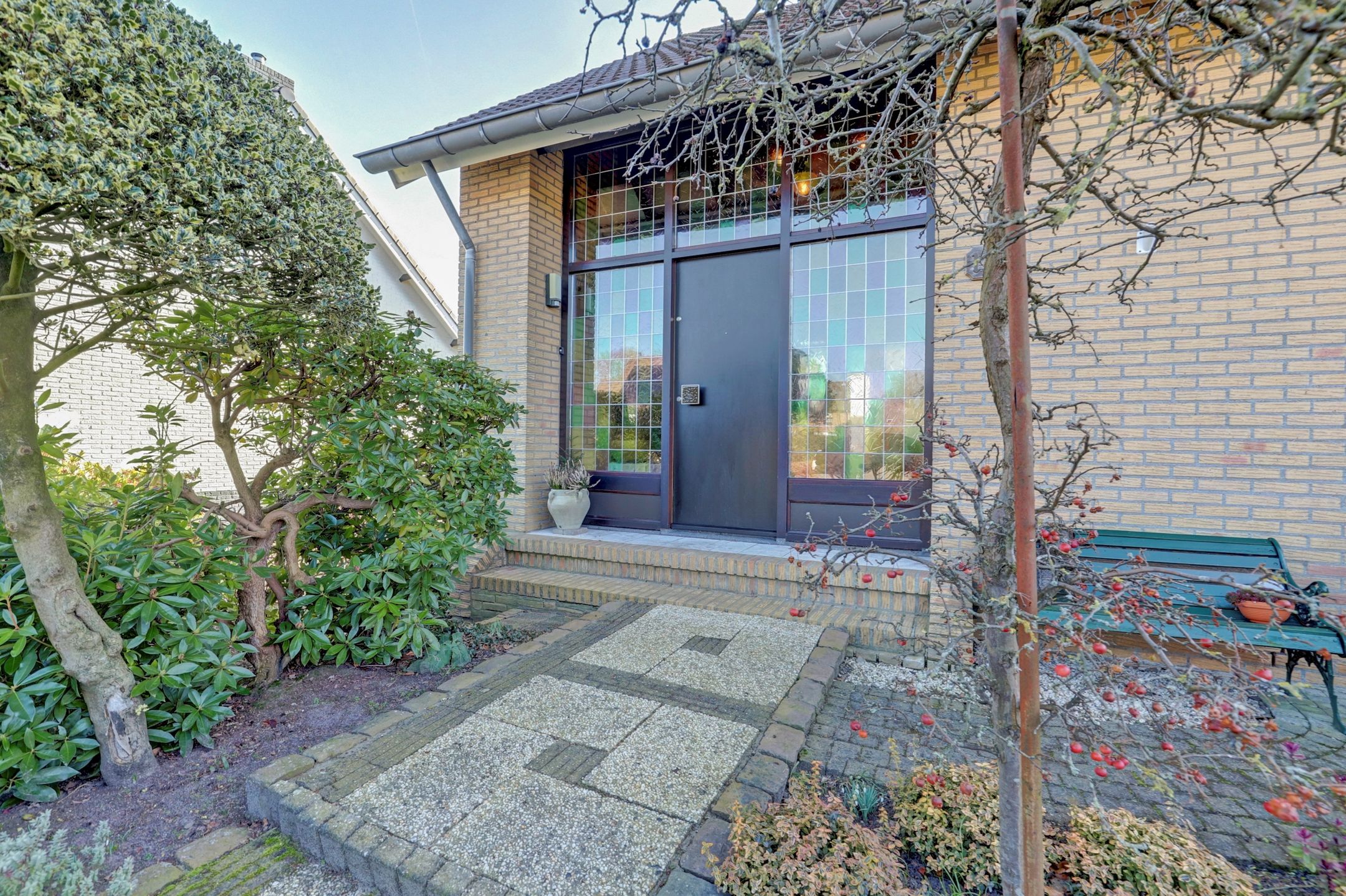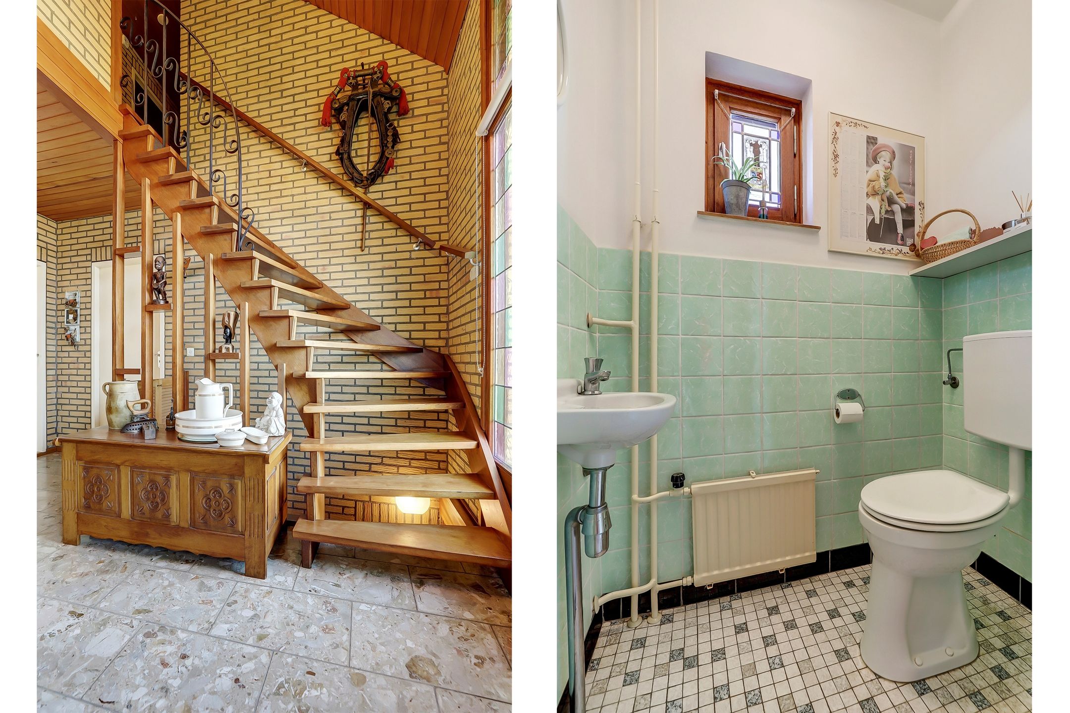 Via een uitnodigend licht oplopend paadje dat zich langs de bloeiende planten door de weelderige voortuin slingert loop je naar de hoger gelegen voordeur. Bij binnenkomst in de ruime ontvangsthal valt direct de lichtinval door de kleurige glas-in-loodramen naast en boven de voordeur op. Vanuit de hal zijn er verschillende deuren die naar de naastgelegen ruimtes leiden: links ligt de toiletruimte, netjes en functioneel ingericht. Recht voor je bevindt zich een slaapkamer of kantoorruimte en aan de rechterkant heb je toegang tot de keuken en de woonkamer. In de hal zijn verder twee trappen te vinden waarvan er eentje naar de verdieping met slaapkamers en badkamer leidt en de andere gaat naar beneden naar het souterrain, ideaal voor opslag of als extra leefruimte.