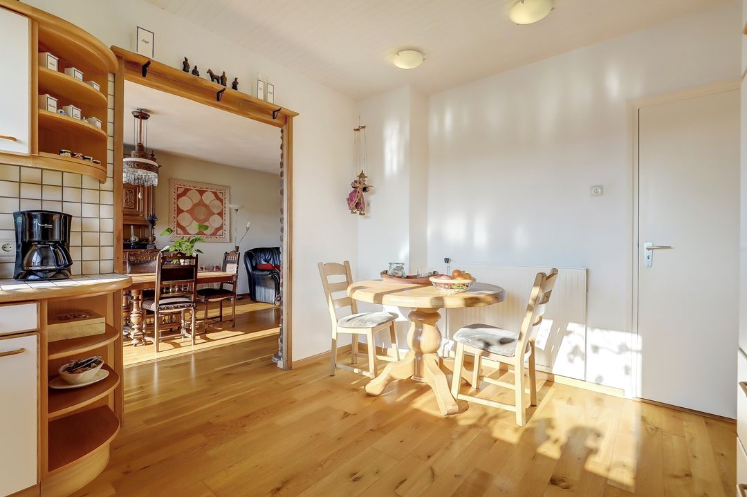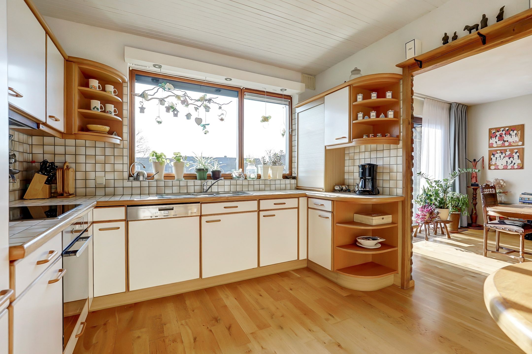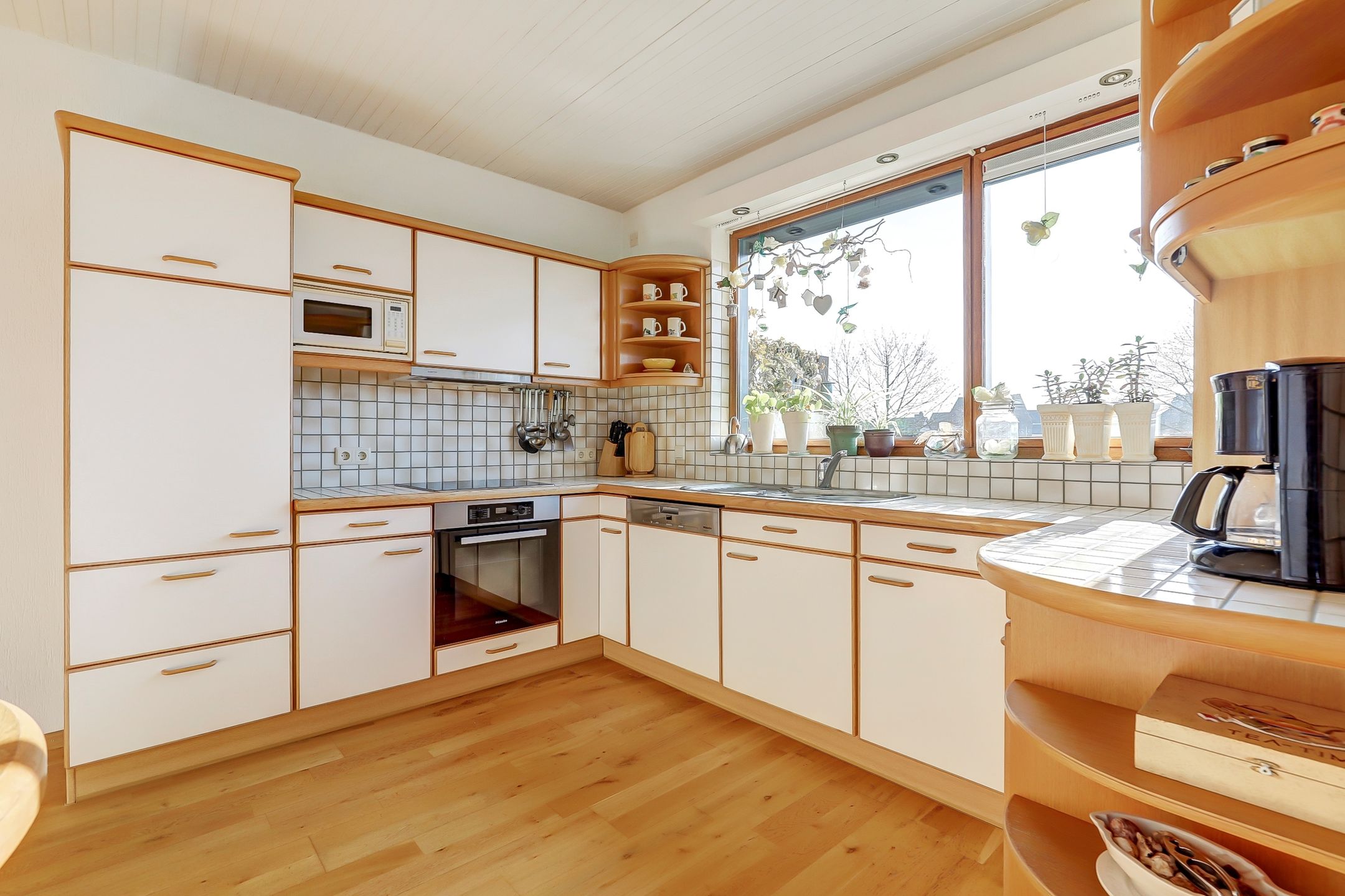 De keuken is netjes onderhouden en functioneel maar wel enigszins gedateerd. De kastjes zijn van massief hout, met een klassieke, lichte afwerking die de ruimte een warme en huiselijke sfeer geeft. Het vierpits keramisch fornuis is ingebouwd in het werkblad, met daarboven een afzuigkap. In de beschikbare oven en magnetron kunnen de makkelijke maaltijden opgewarmd worden. De koelkast en vaatwasser zijn netjes weggewerkt in de keukenkasten, waardoor het geheel een opgeruimd en georganiseerde uitstraling heeft.