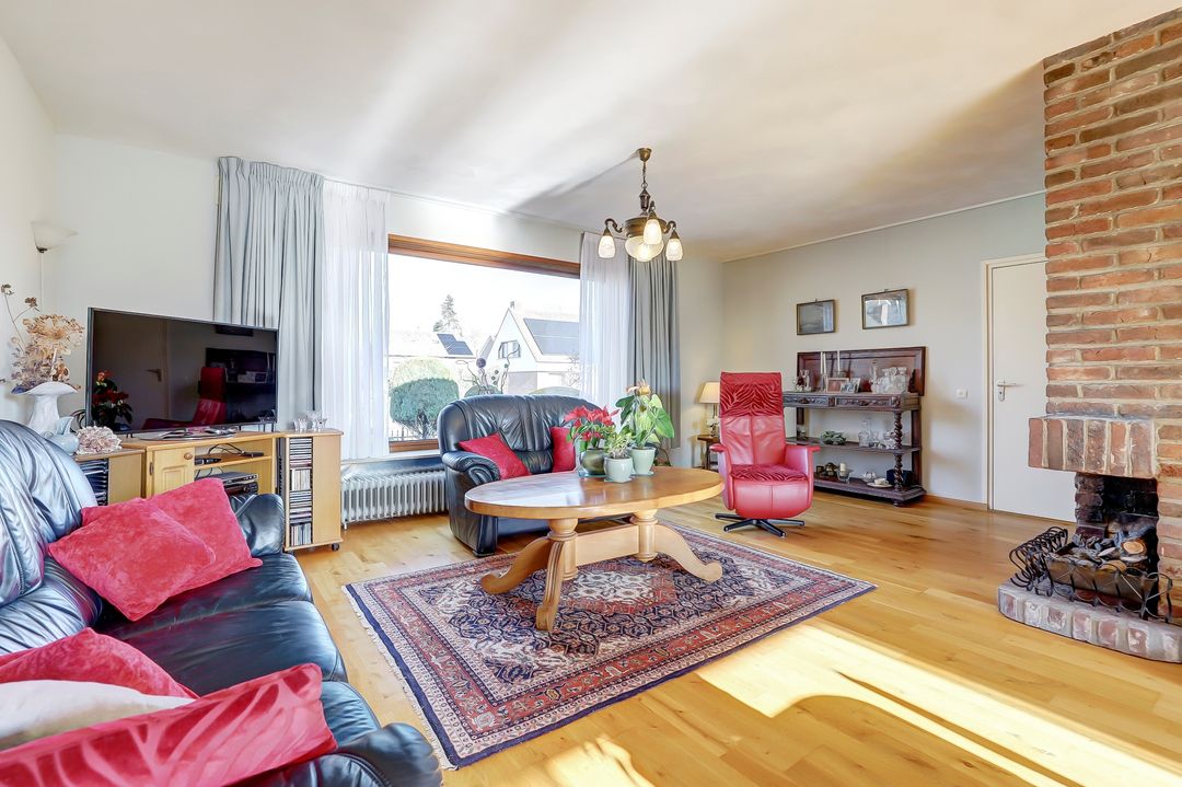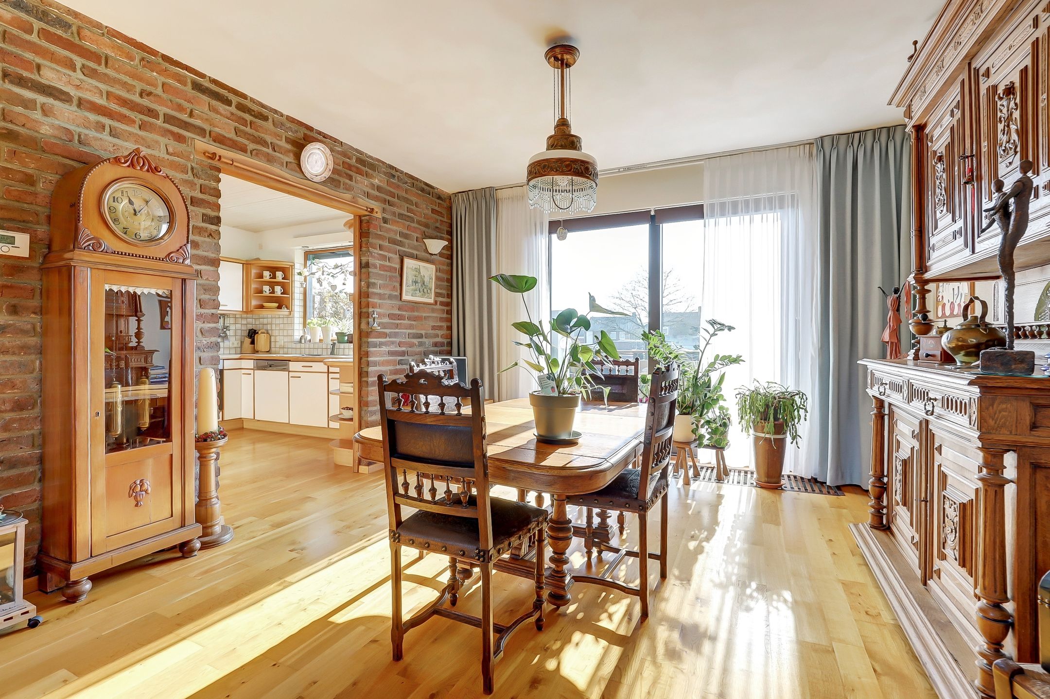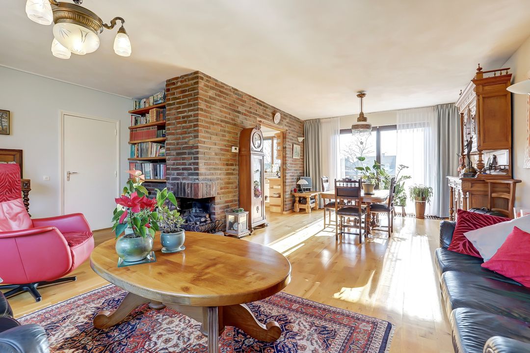 Doordat de woonkamer iets hoger is gelegen dan het straatniveau heb je hier binnen veel privacy en rust en de ruime voortuin zorgt ervoor dat je geen directe inkijk van buitenaf hebt. Aan de voorkant van de kamer bevindt zich een groot raam, dat veel natuurlijk licht binnenlaat. Aan de achterkant ligt een glazen schuifpui die de kamer opent naar de tuin, waardoor de ruimte nog lichter en luchtiger aanvoelt en je direct toegang hebt tot het buitenleven. De houten vloer zorgt voor een warme, natuurlijke uitstraling en voegt een gezellige sfeer toe. In een hoek is een elektrische open haard ingebouwd, die niet alleen functioneel is, maar ook zorgt voor extra sfeer, vooral tijdens de koudere maanden. Een echte eyecatcher in de ruimte is de ingebouwde boekenkast. De kast biedt niet alleen ruimte voor boeken maar ook voor persoonlijke items die hier op een mooie manier getoond kunnen worden.