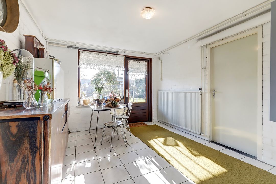 De houten vloer draagt bij aan de gezellige sfeer van de keuken en is goed onderhouden. Het grote raam boven de spoelbak biedt een prachtig uitzicht over de groene achtertuin, waardoor de keuken een fijne plek is om te werken en in te verblijven. Hoewel de keuken misschien wat ouderwets aandoet, is alles goed in stand gehouden en functioneert het nog perfect voor dagelijks gebruik.