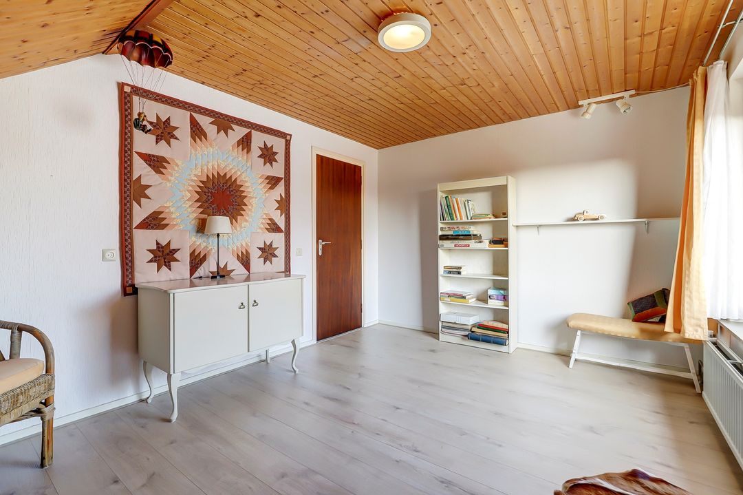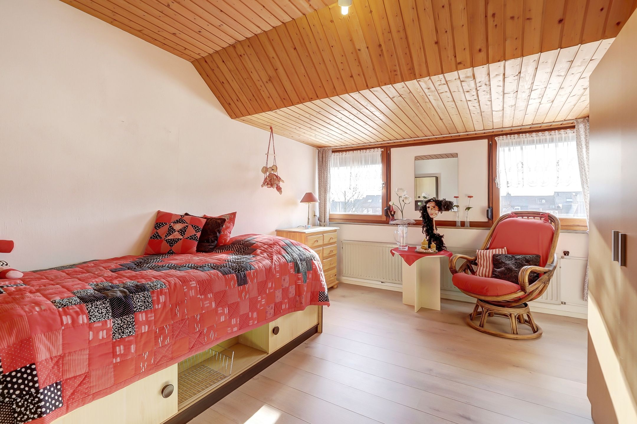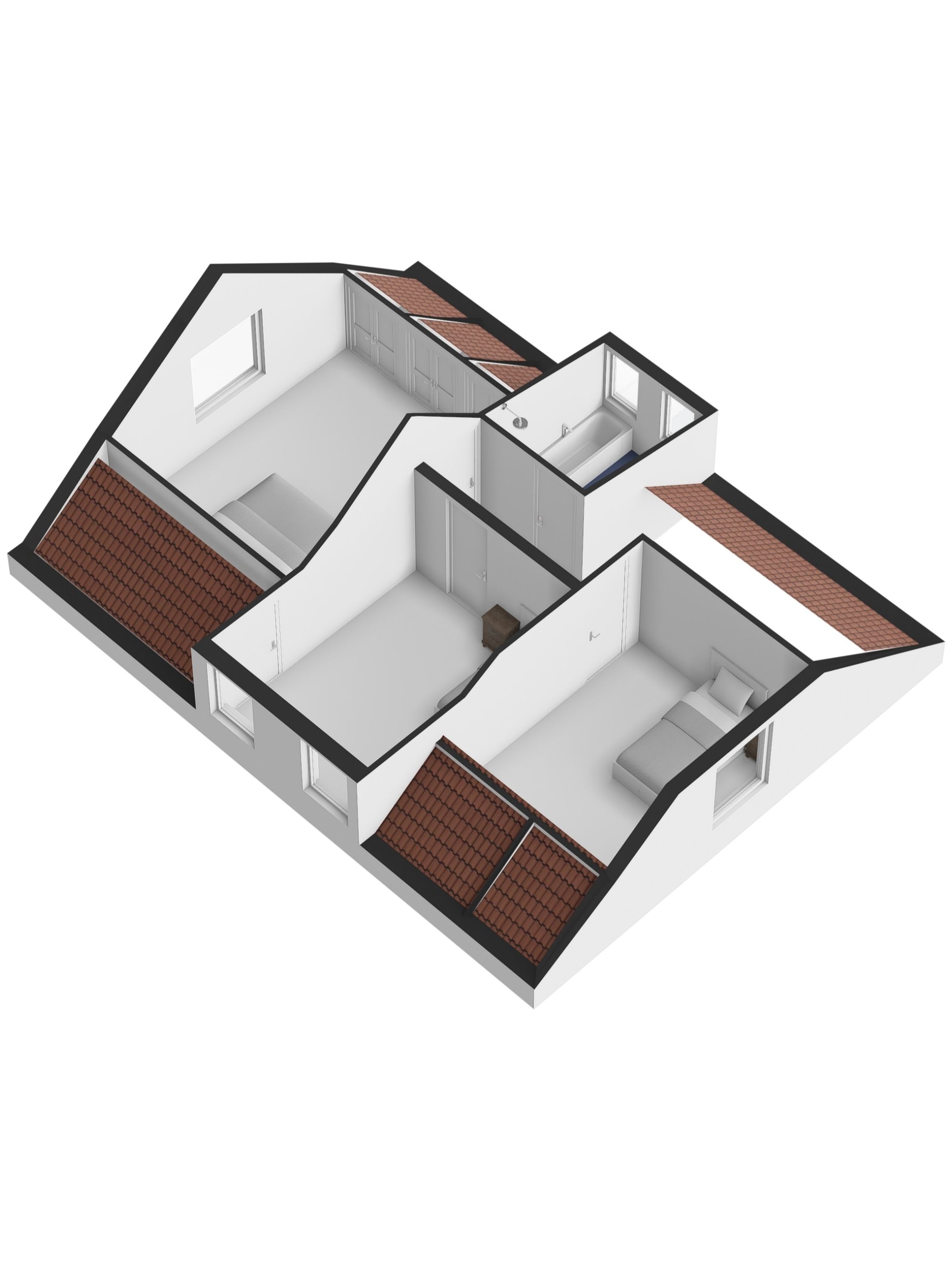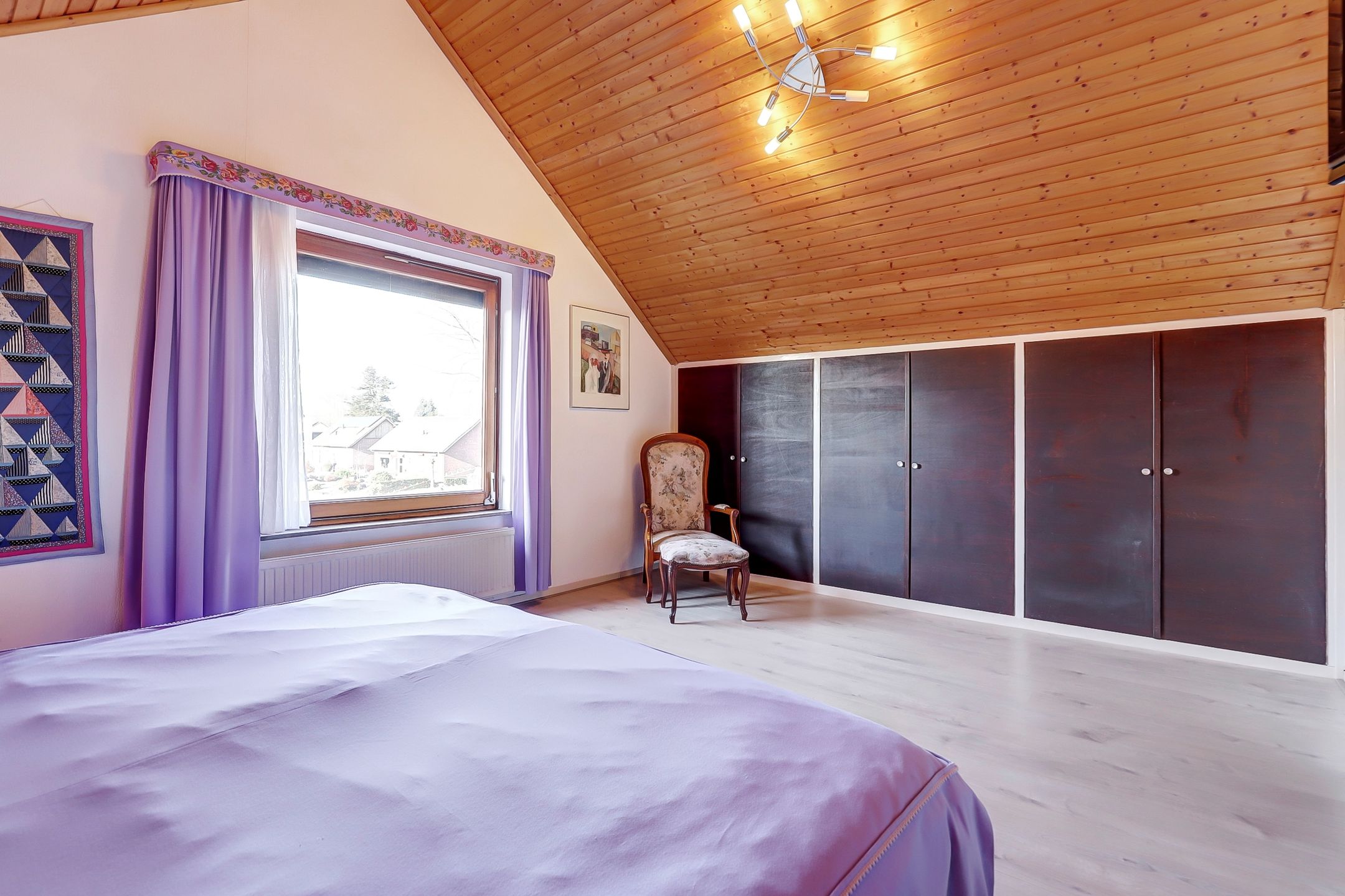 De grootste slaapkamer is een royale ruimte die zich uitstrekt over een groot deel van de verdieping. Dankzij het hoge dak heb je hier een heel ruimtelijk gevoel, terwijl de slimme indeling zorgt voor optimaal gebruik van de ruimte. Onder het schuine dak is namelijk volop bergruimte gecreëerd, ideaal voor het opbergen van kleding, seizoensspullen, koffers of andere benodigdheden. Het grote raam laat veel natuurlijk licht naar binnen. De andere twee slaapkamers zijn eveneens prettig van formaat en perfect geschikt als kamer voor de kinderen, werkkamer of logeerkamer. Beide kamers hebben een praktische indeling en voldoende lichtinval door het grote raam en de dakkapel, waardoor ze een fijne plek vormen om te ontspannen of te werken.