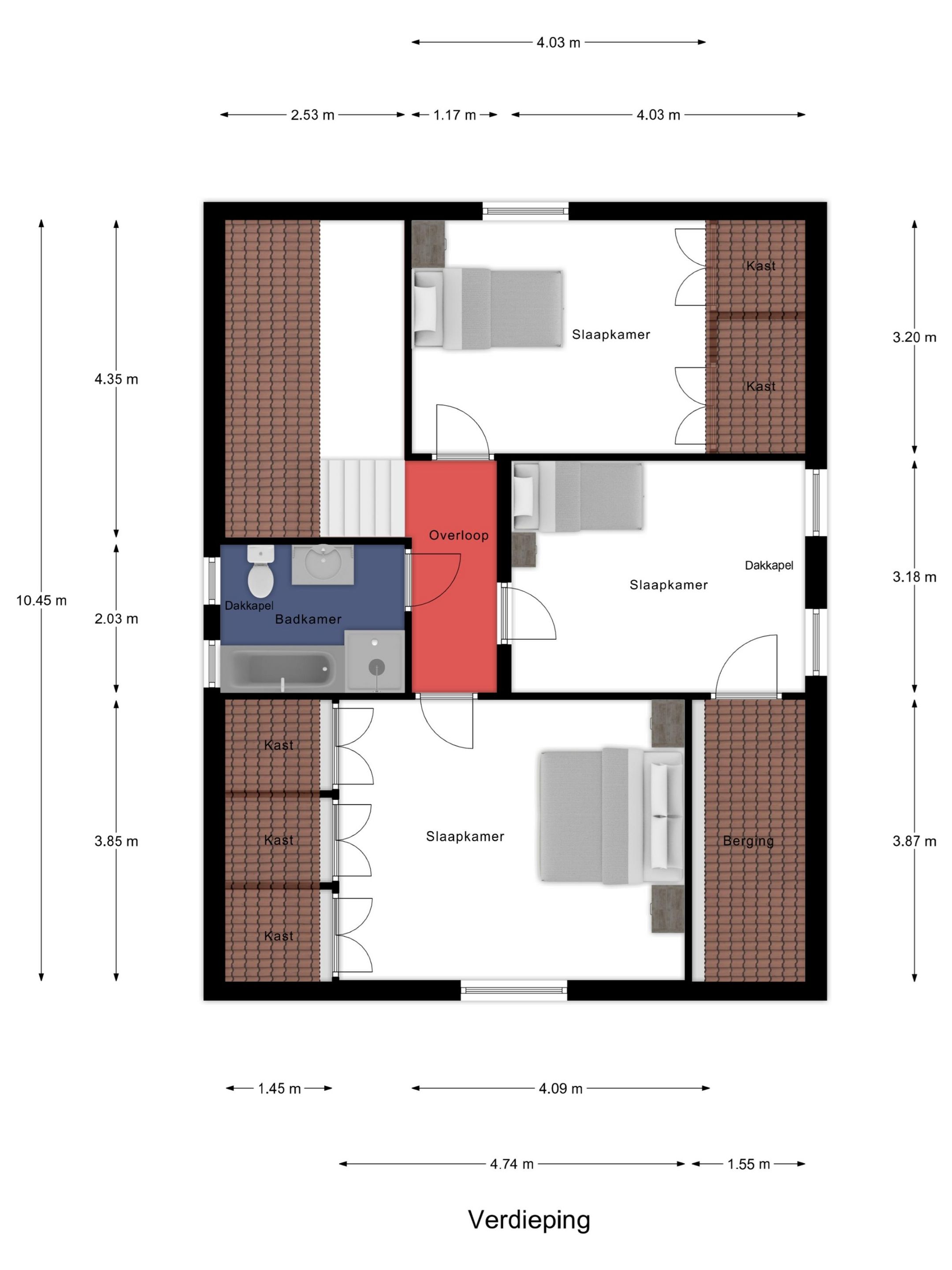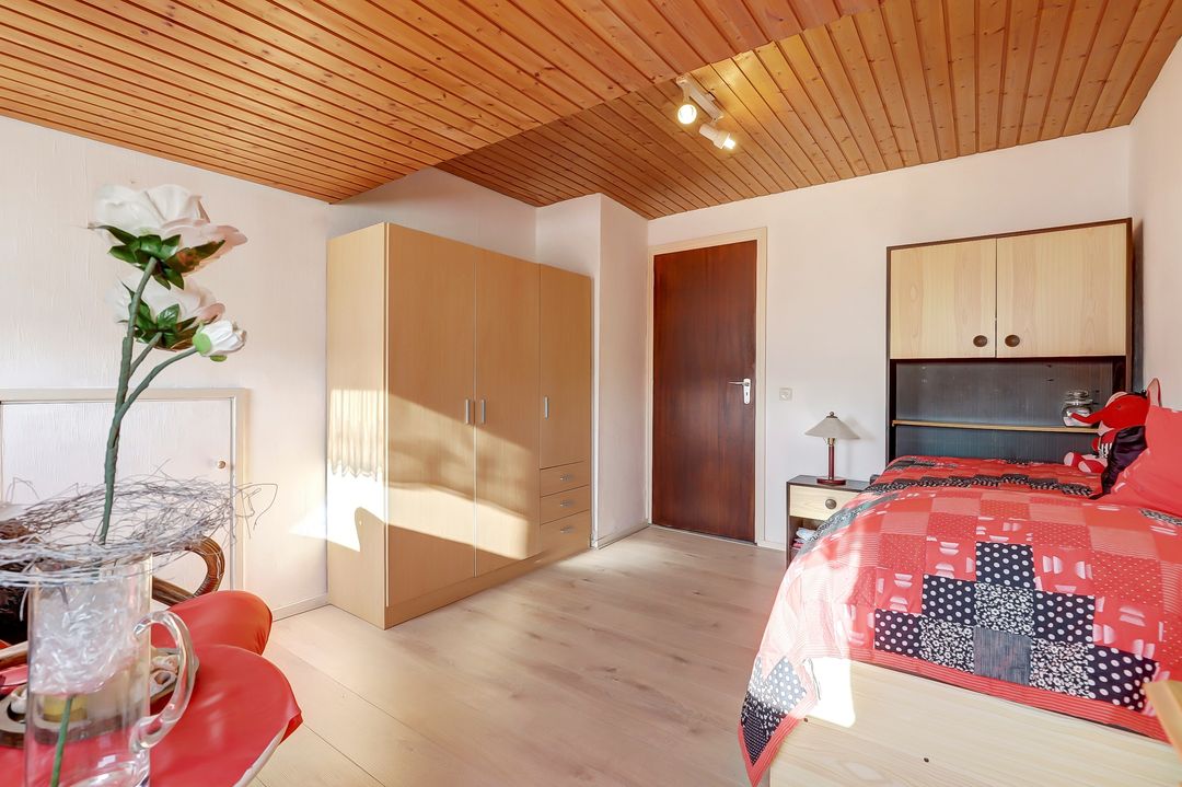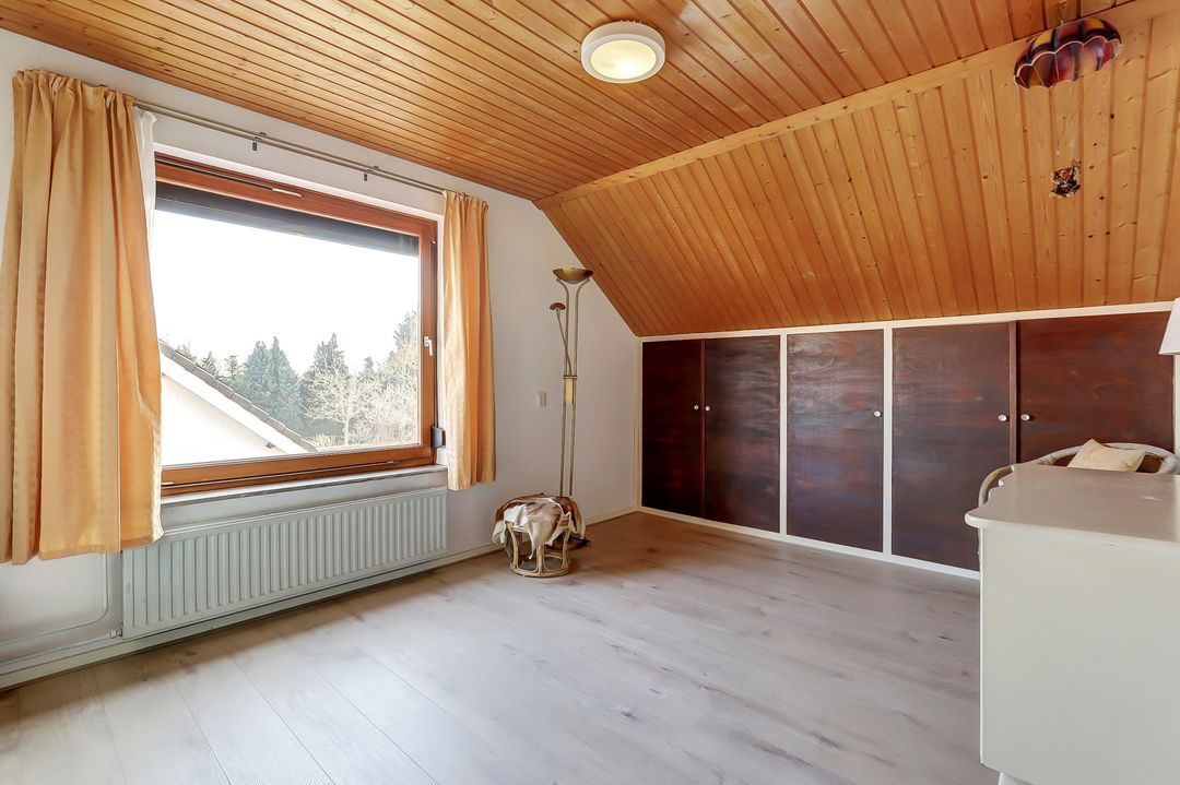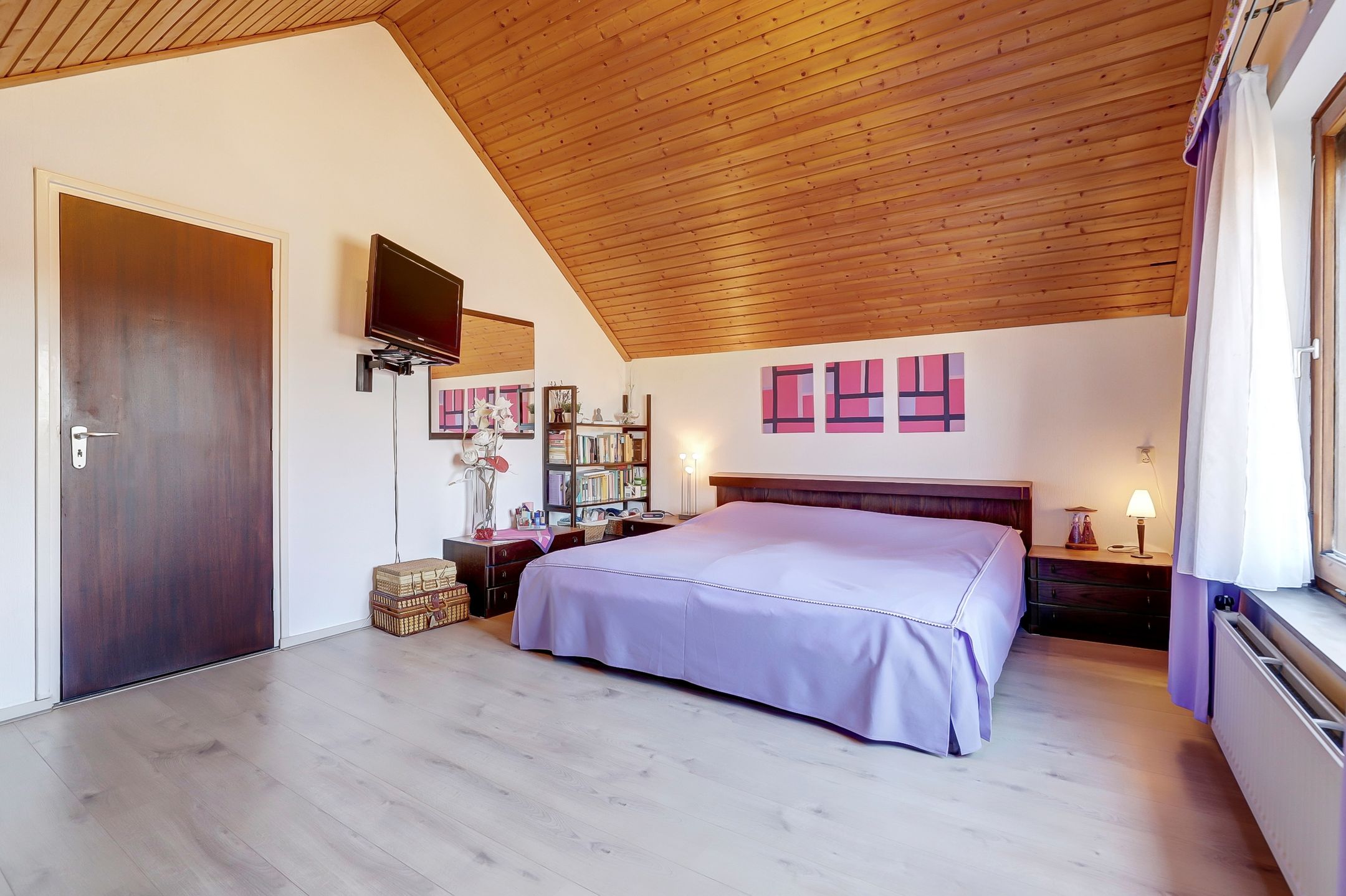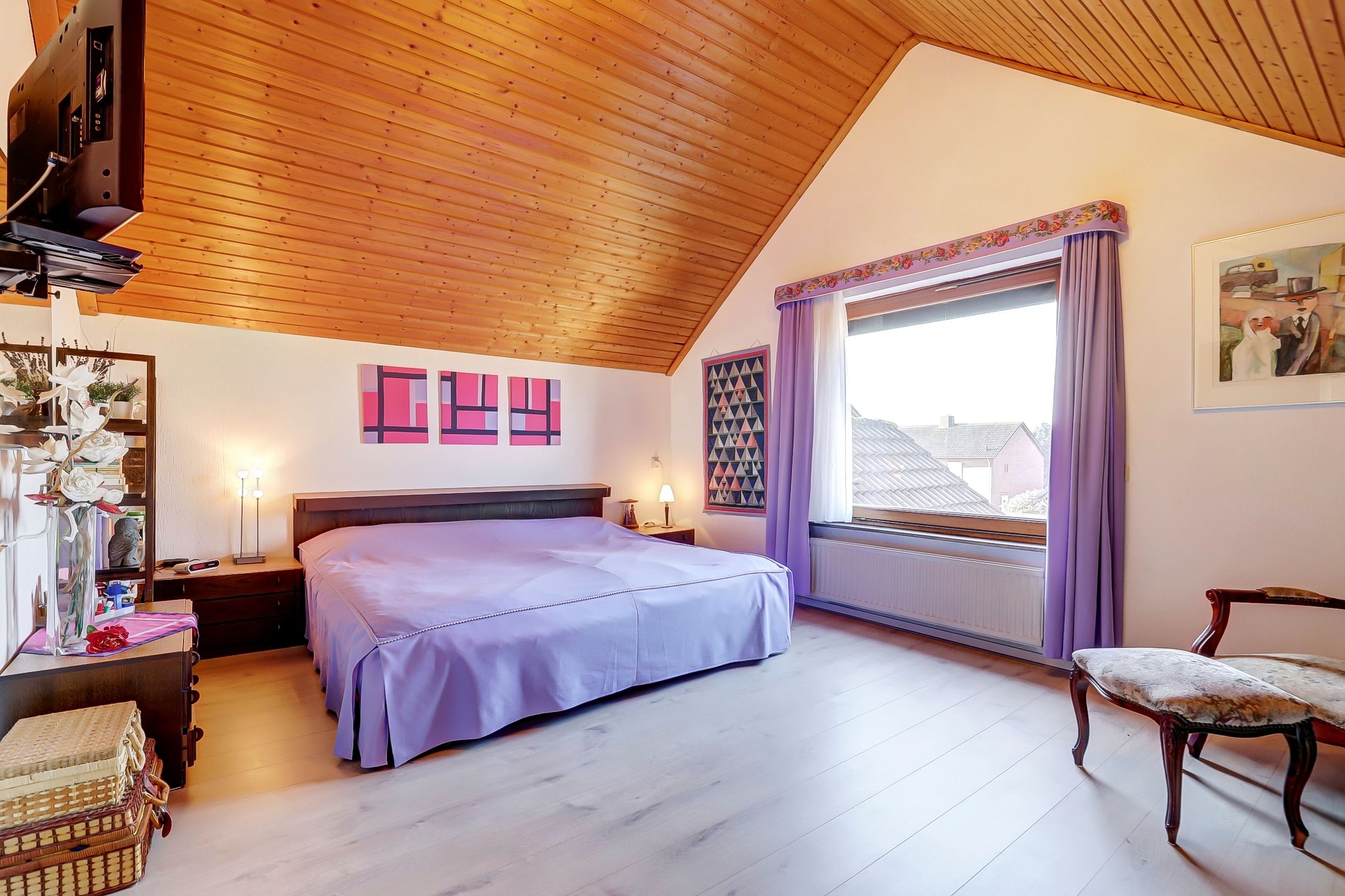 De grootste slaapkamer is een royale ruimte die zich uitstrekt over een groot deel van de verdieping. Dankzij het hoge dak heb je hier een heel ruimtelijk gevoel, terwijl de slimme indeling zorgt voor optimaal gebruik van de ruimte. Onder het schuine dak is namelijk volop bergruimte gecreëerd, ideaal voor het opbergen van kleding, seizoensspullen, koffers of andere benodigdheden. Het grote raam laat veel natuurlijk licht naar binnen. De andere twee slaapkamers zijn eveneens prettig van formaat en perfect geschikt als kamer voor de kinderen, werkkamer of logeerkamer. Beide kamers hebben een praktische indeling en voldoende lichtinval door het grote raam en de dakkapel, waardoor ze een fijne plek vormen om te ontspannen of te werken.
