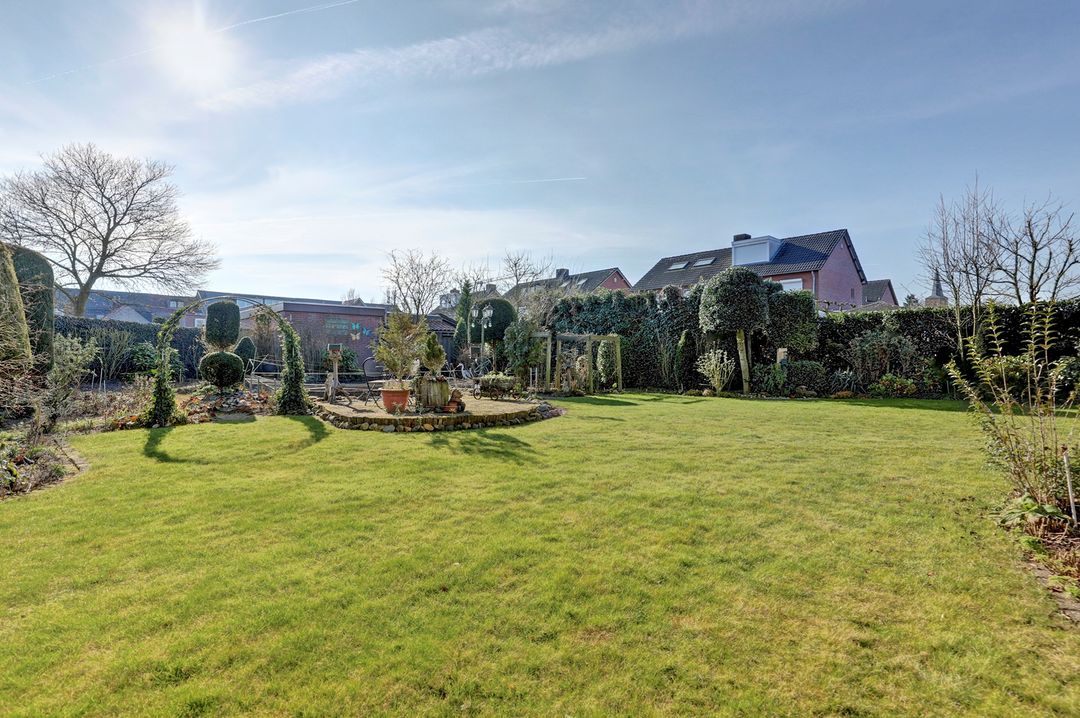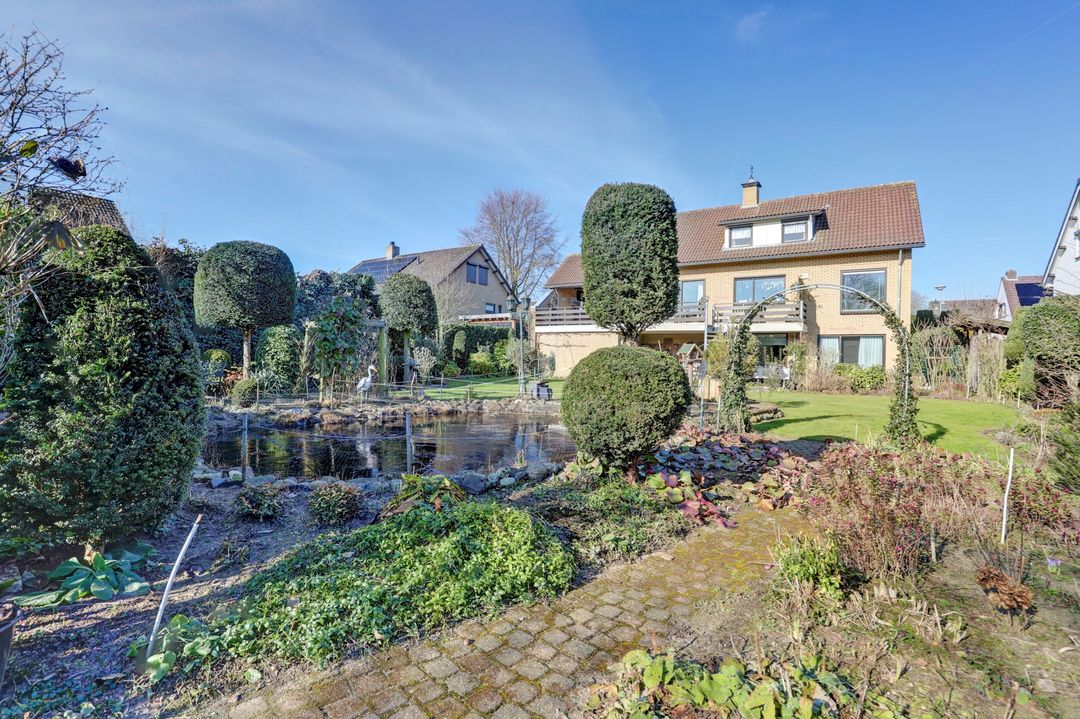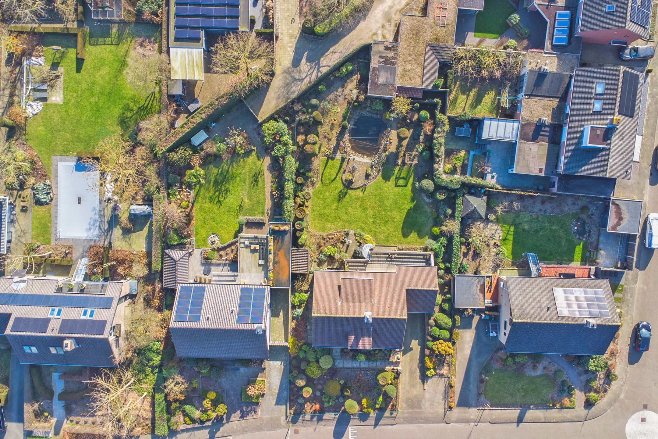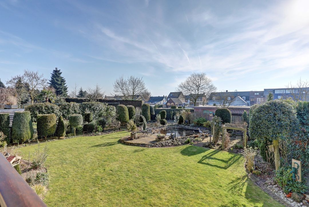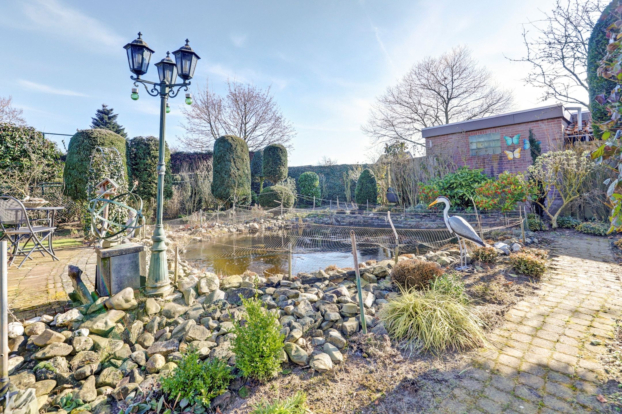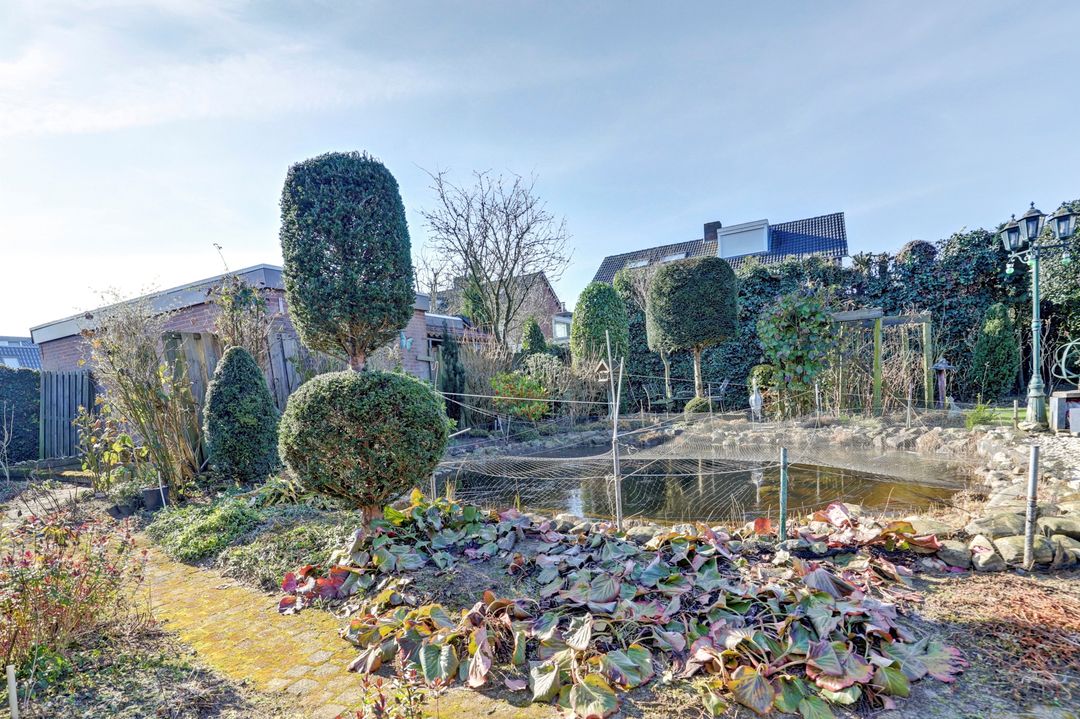 De royale achtertuin is op het langste stuk maar liefst 28 meter diep! Rust en natuur komen samen in deze groene tuin. Met diverse gezellige zitplekjes is er altijd een fijne plek te vinden om te genieten van het buitenleven. Onder een prachtig gevormde krulhazelaar kun je heerlijk wegdromen met een goed boek of een lekker kopje koffie. Dichtbij de vijver is ook een leuk zithoekje gecreëerd waar je kunt genieten van het water en de dieren die hierdoor aangetrokken worden. Onder de overkapping kun je juist lekker in de schaduw zitten. De tuin is rijkelijk beplant met een grote diversiteit aan bloemen en struiken. Weelderige hortensia’s, grote vormtaxussen en geurige skimmia’s geven veel groen en kleur aan de tuin, terwijl door het eetbare groen de tuin ook een functionele toevoeging heeft. Bramen, frambozen, aardbeien en twee grote druivenstruiken zorgen ieder jaar voor een lekkere oogst van eigen bodem. Dankzij de zorgvuldige beplanting staat er een groot deel van het jaar wel iets in bloei, waardoor de tuin in elk seizoen iets moois te bieden heeft.