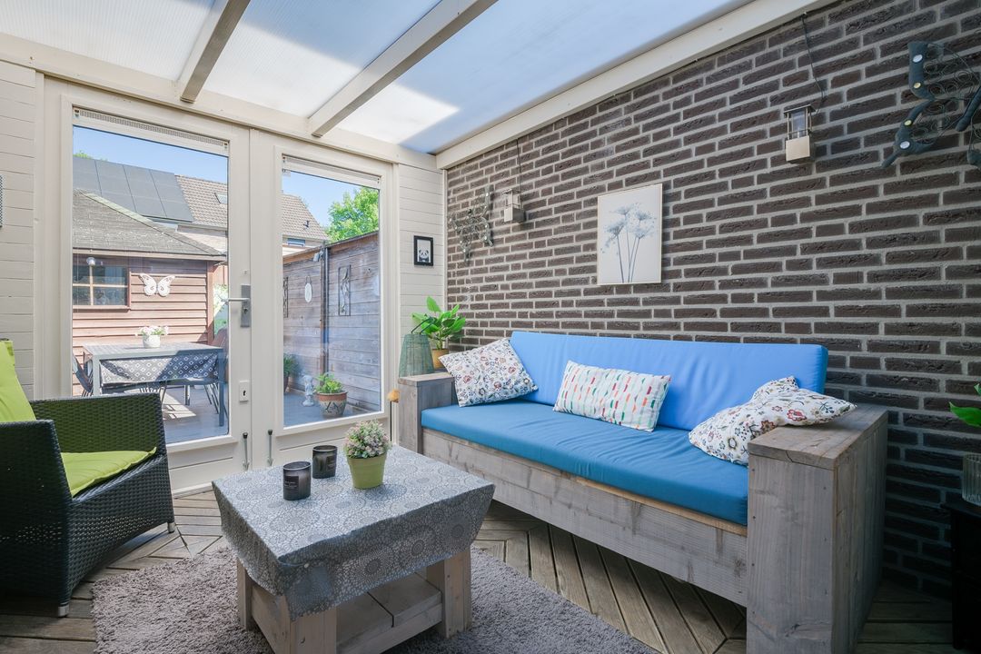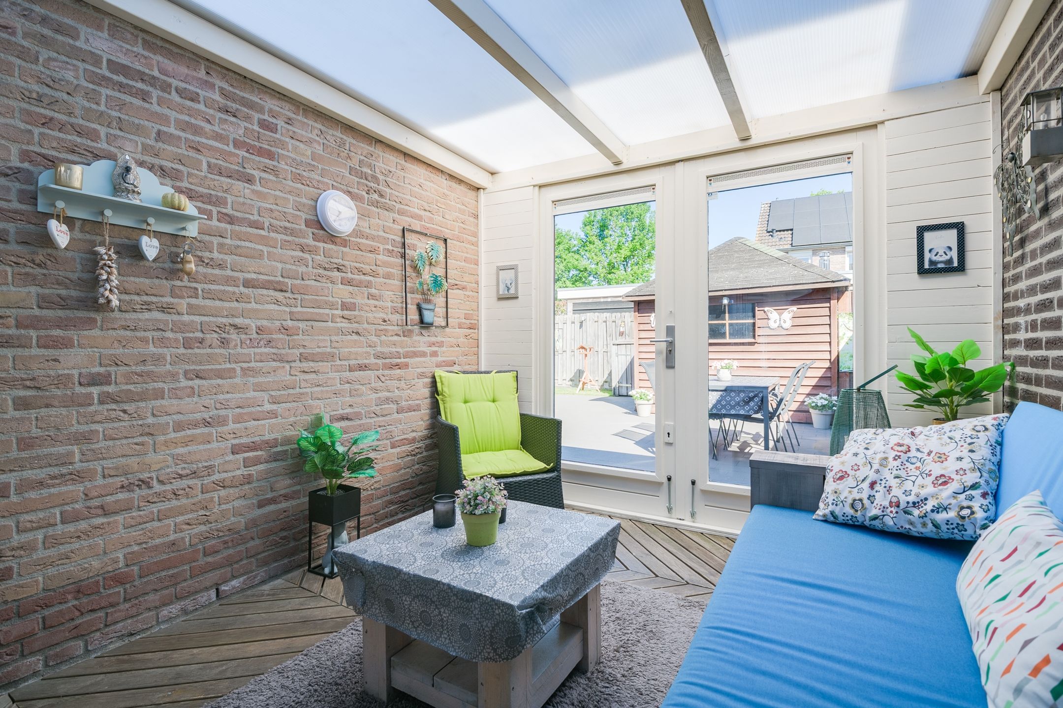 Een unieke toevoeging aan de woning is de prachtige tuinkamer, een overdekte buitenruimte die het beste van twee werelden combineert. Deze sfeervolle ruimte beschikt over een volledig kunststof overkapping waardoor u optimaal van het daglicht kunt genieten, ongeacht het weer. De karakteristieke bakstenen muren creëren een warme en gezellige sfeer, perfect voor ontspanning en gezellige avonden. Via de openslaande deuren heeft u vanuit de tuinkamer direct toegang tot de achtertuin, waardoor binnen en buiten naadloos in elkaar overlopen.