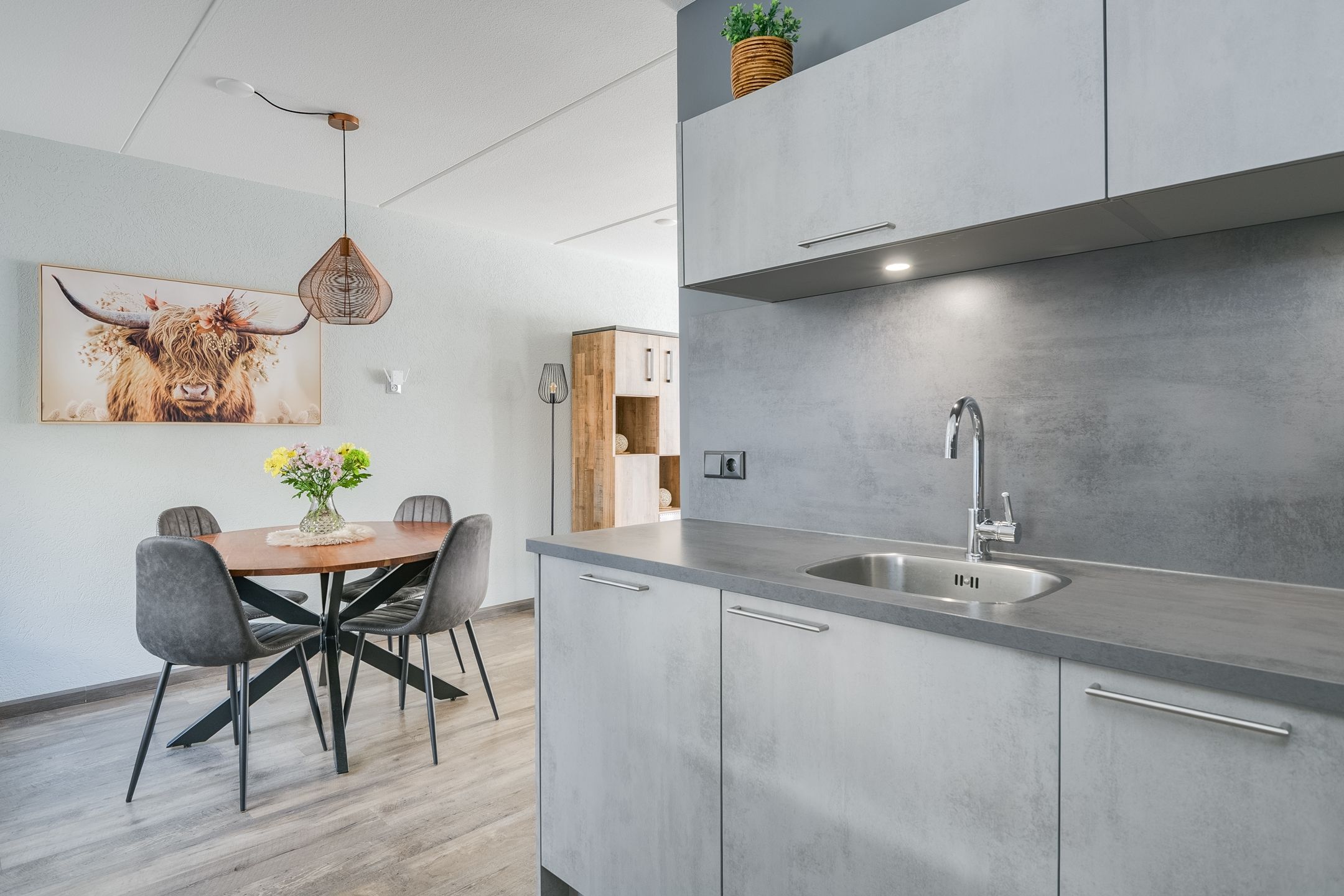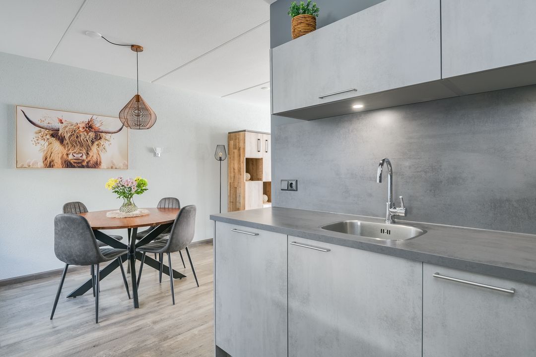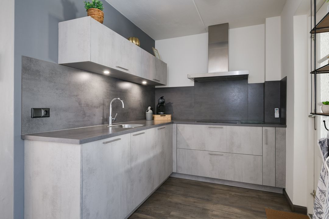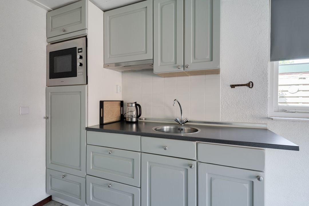De moderne keuken staat in open verbinding met de woonkamer en is voorzien van alle hedendaagse gemakken. Het kunststof keukenblad combineert functionaliteit met een strakke uitstraling, terwijl de apparatuur compleet is: een keramische kookplaat, koelkast, afzuigkap, vaatwasser en magnetron zorgen voor optimaal kookgemak. De neutrale kleurstelling past perfect bij de stijlvolle afwerking van de woning. Via de openslaande deur heeft u vanuit de keuken direct toegang tot de sfeervolle tuinkamer/overdekt terras.