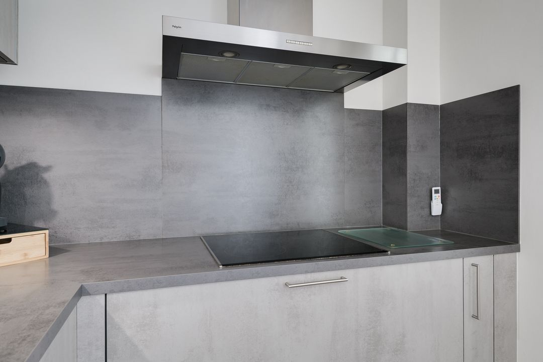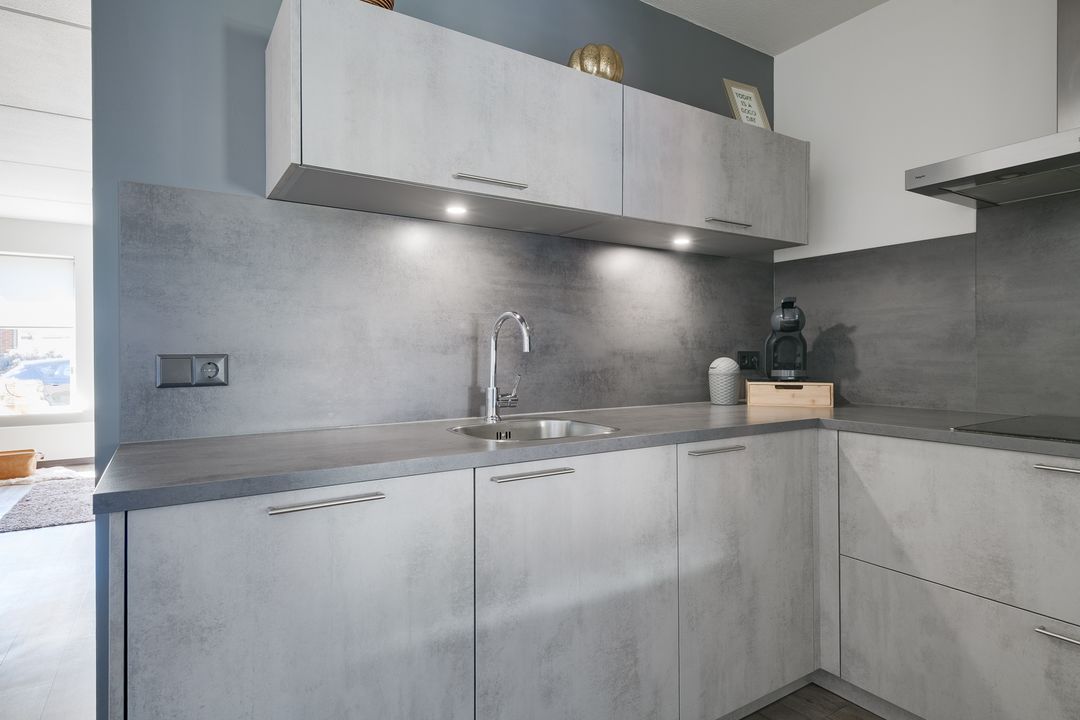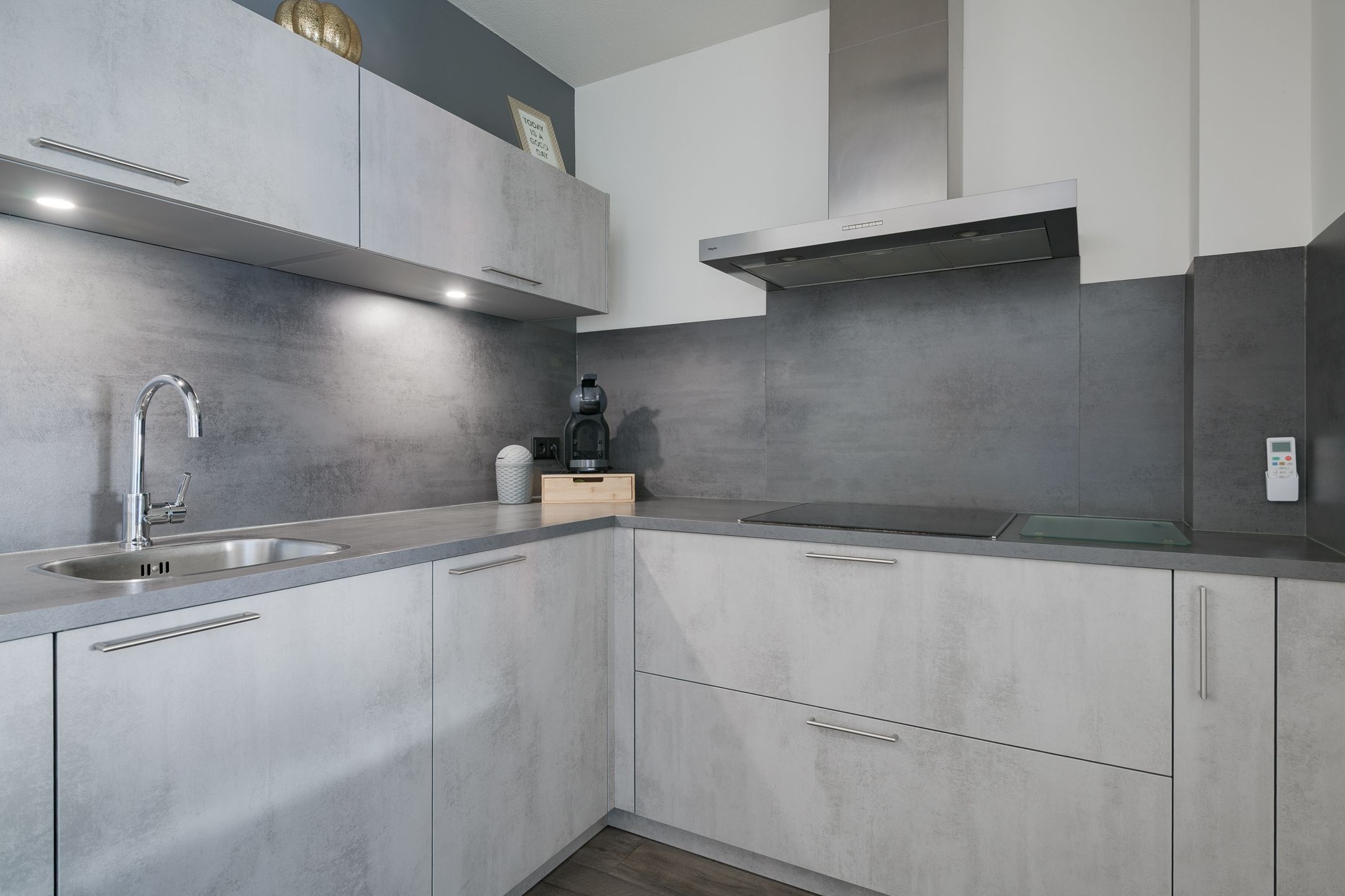 De moderne keuken staat in open verbinding met de woonkamer en is voorzien van alle hedendaagse gemakken. Het kunststof keukenblad combineert functionaliteit met een strakke uitstraling, terwijl de apparatuur compleet is: een keramische kookplaat, koelkast, afzuigkap, vaatwasser en magnetron zorgen voor optimaal kookgemak. De neutrale kleurstelling past perfect bij de stijlvolle afwerking van de woning. Via de openslaande deur heeft u vanuit de keuken direct toegang tot de sfeervolle tuinkamer/overdekt terras.