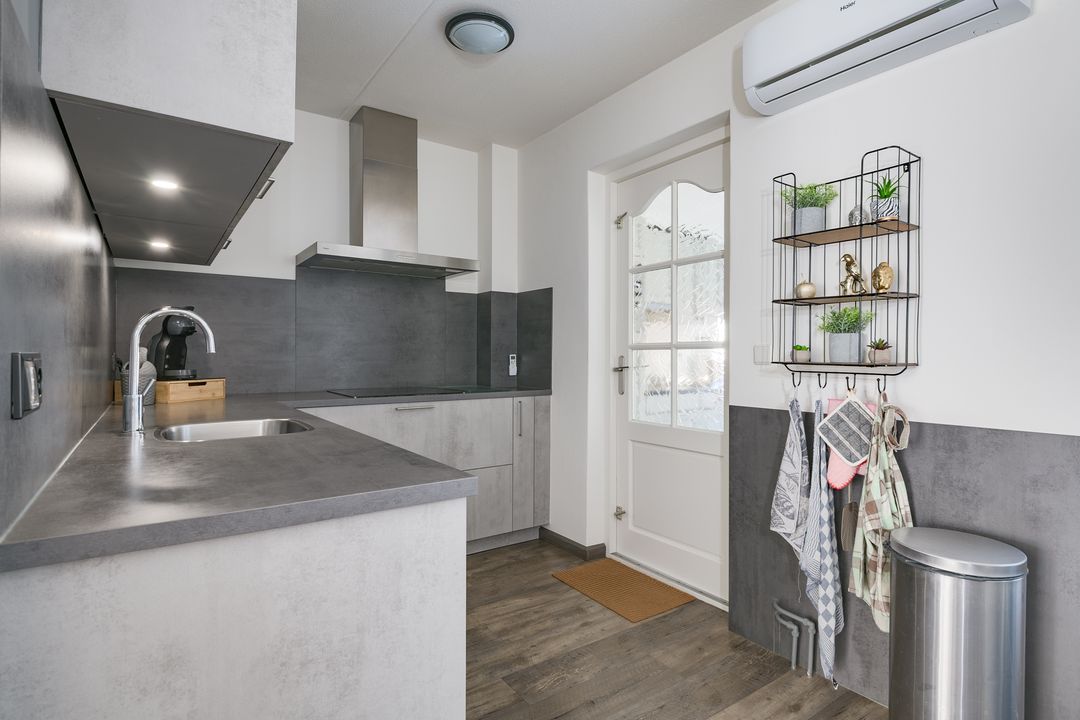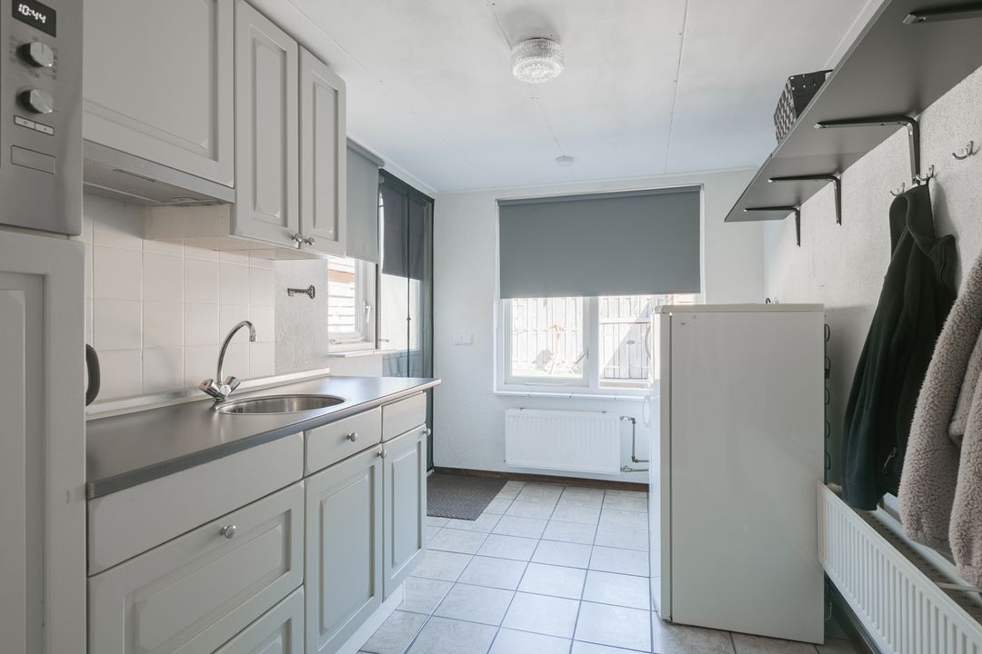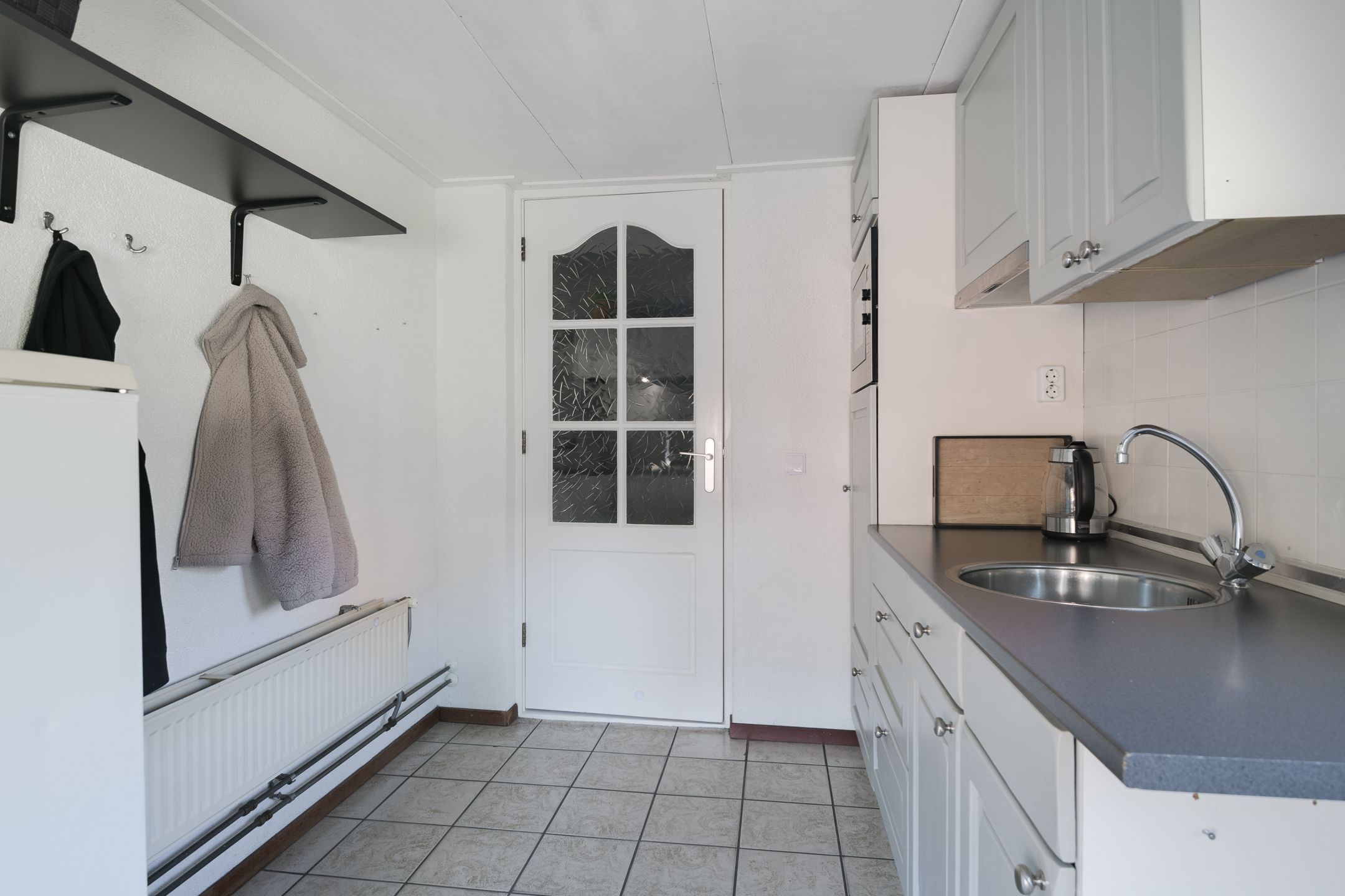 De praktische bijkeuken is een welkome aanvulling op de keuken. Deze ruimte beschikt over een eigen keukenblok en biedt extra bergruimte en werkruimte. Vanuit de bijkeuken heeft u toegang tot de tuin en via daar ook tot de garage, wat de praktische indeling van de woning ten goede komt.