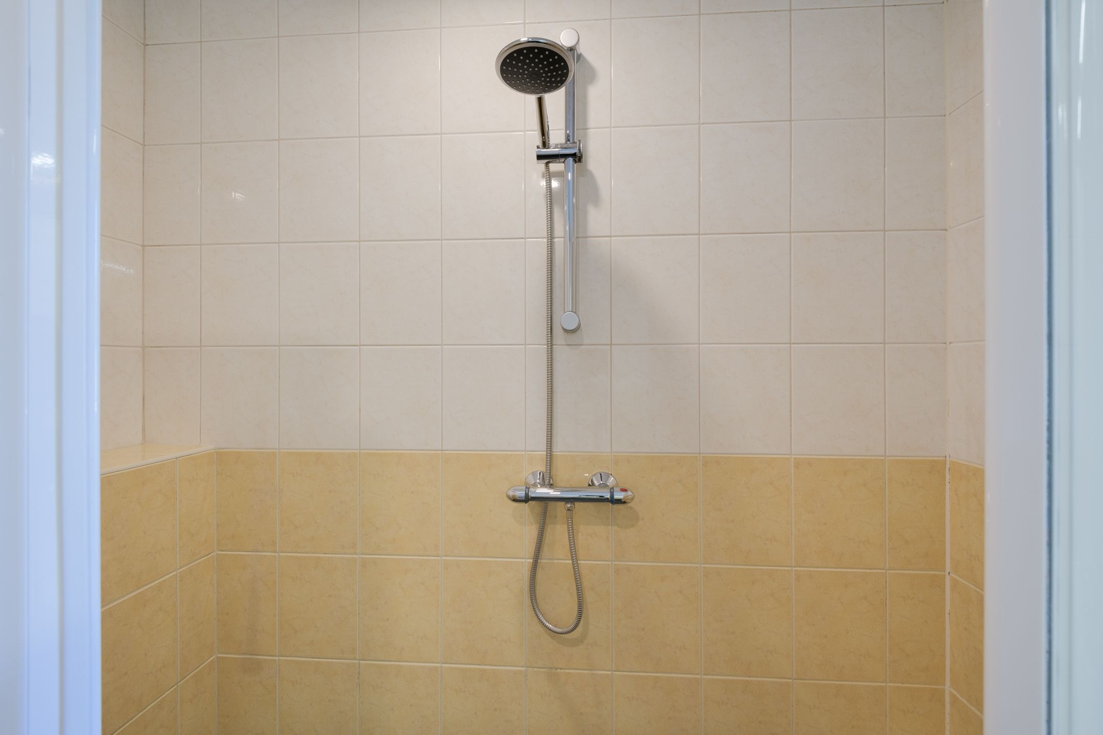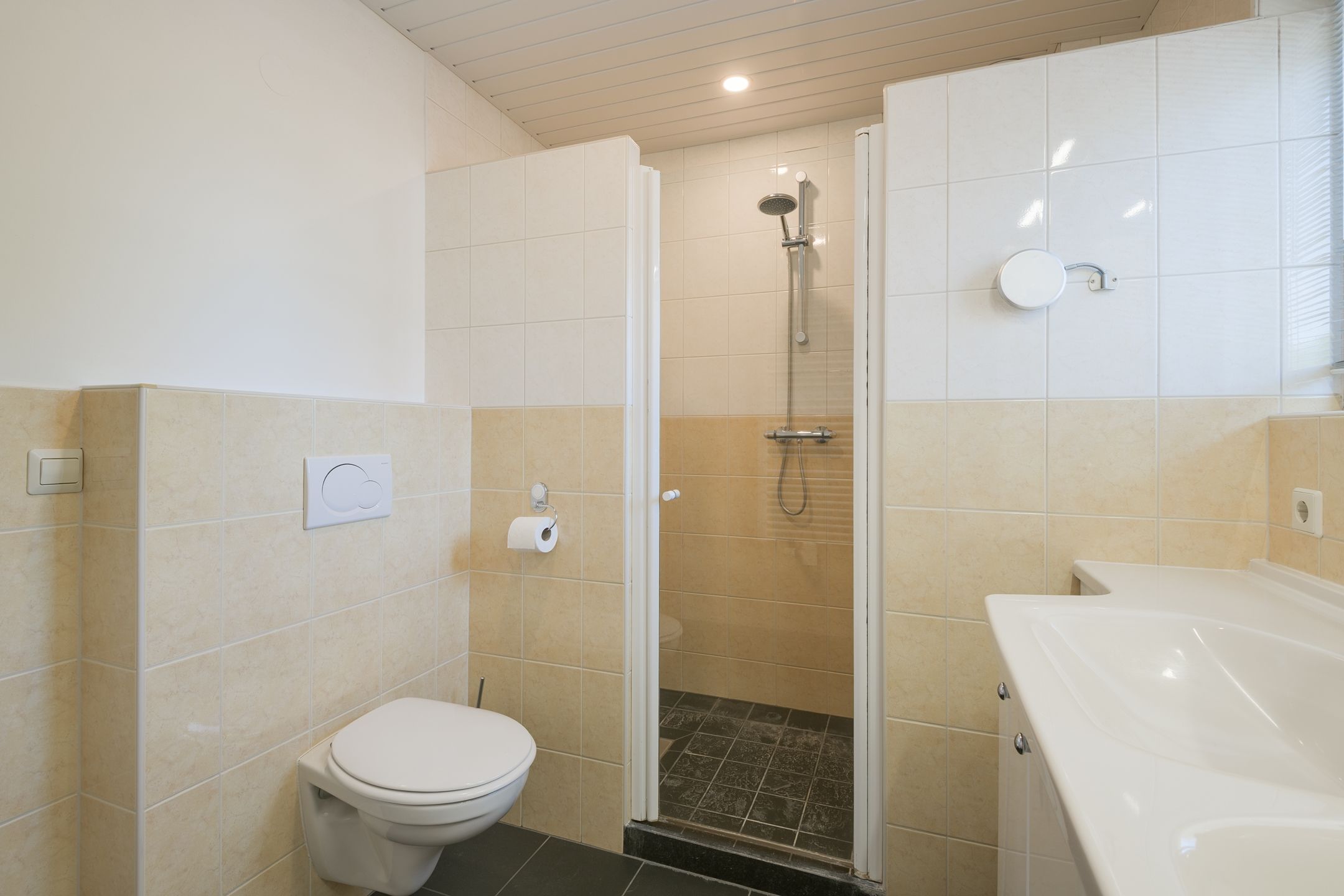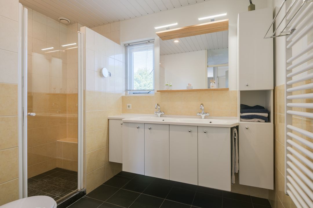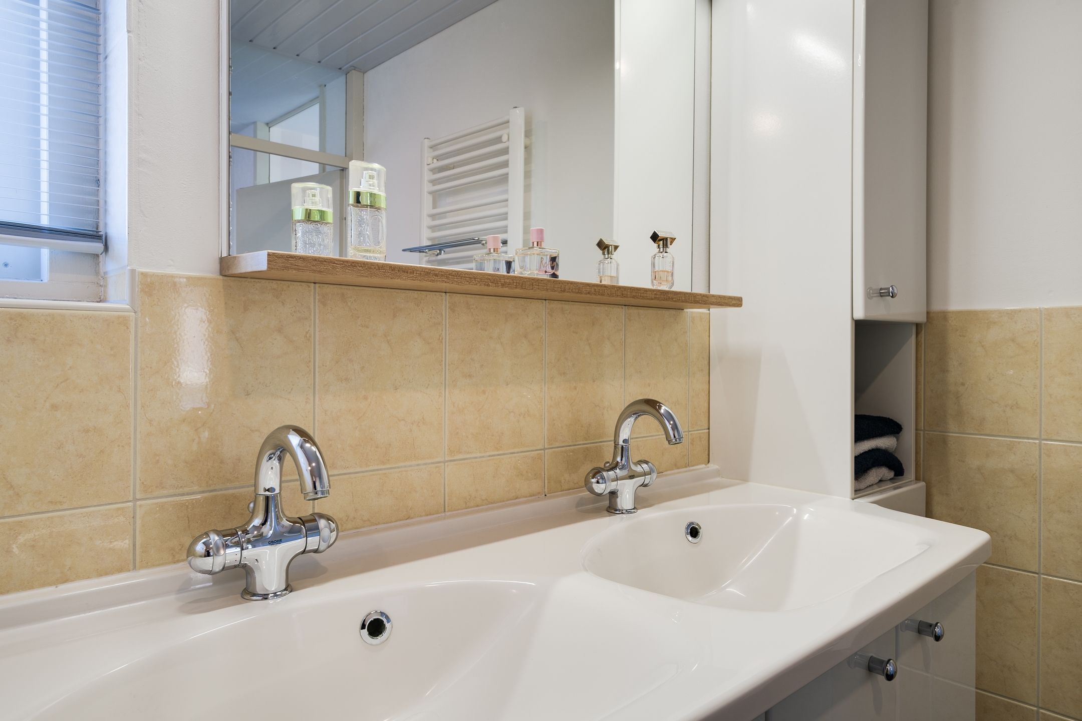 De luxe badkamer is volledig betegeld en van alle gemakken voorzien. De inloopdouche, het toilet en de dubbele wastafel bieden alle comfort voor het gezin. De combinatie van gele en witte tegels geeft de ruimte een warme uitstraling, terwijl het grote raam zorgt voor prettig daglicht en natuurlijke ventilatie. De praktische indeling garandeert optimaal gebruiksgemak voor het hele gezin.