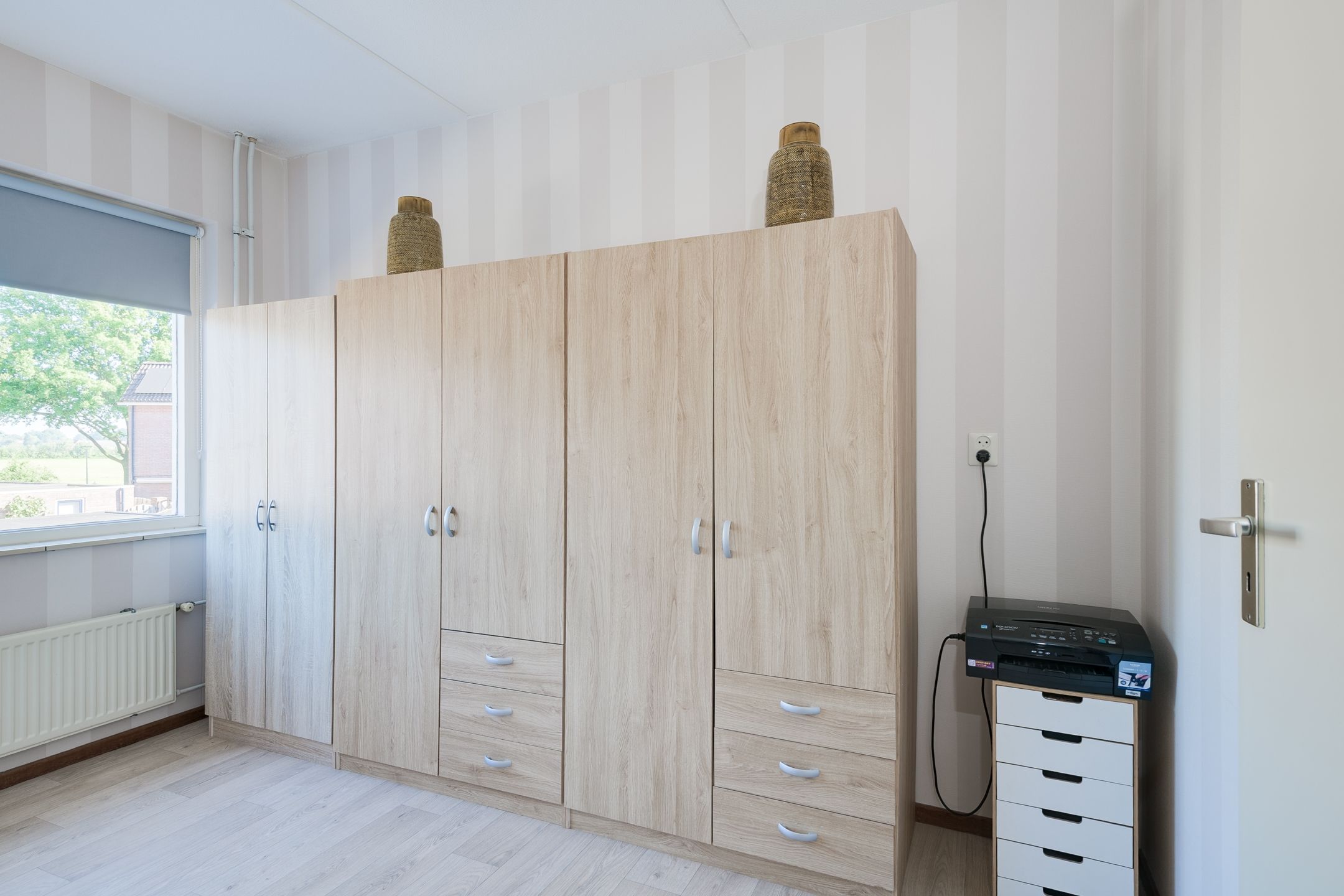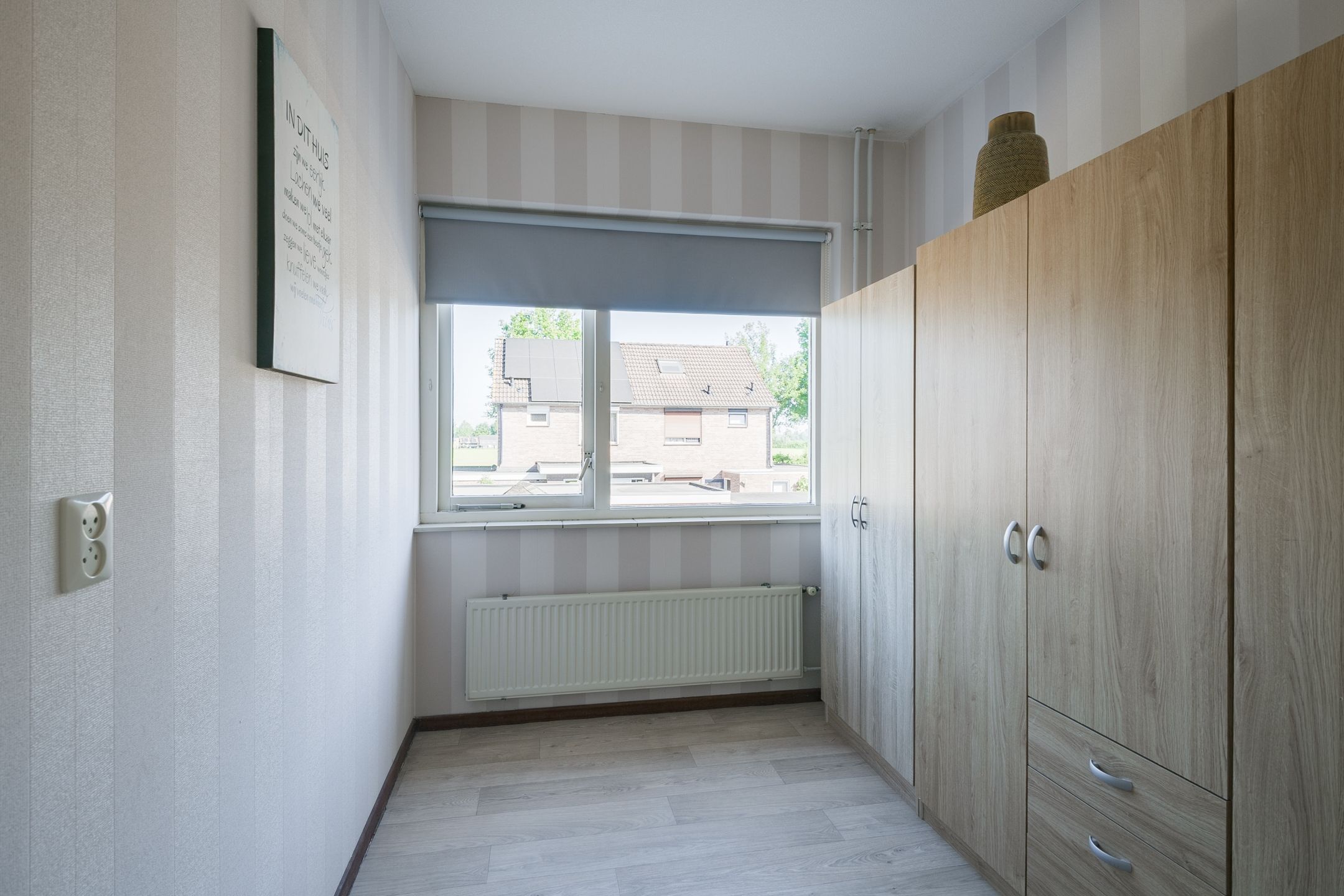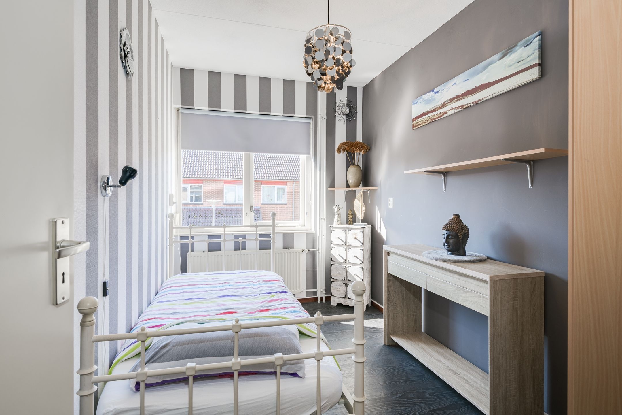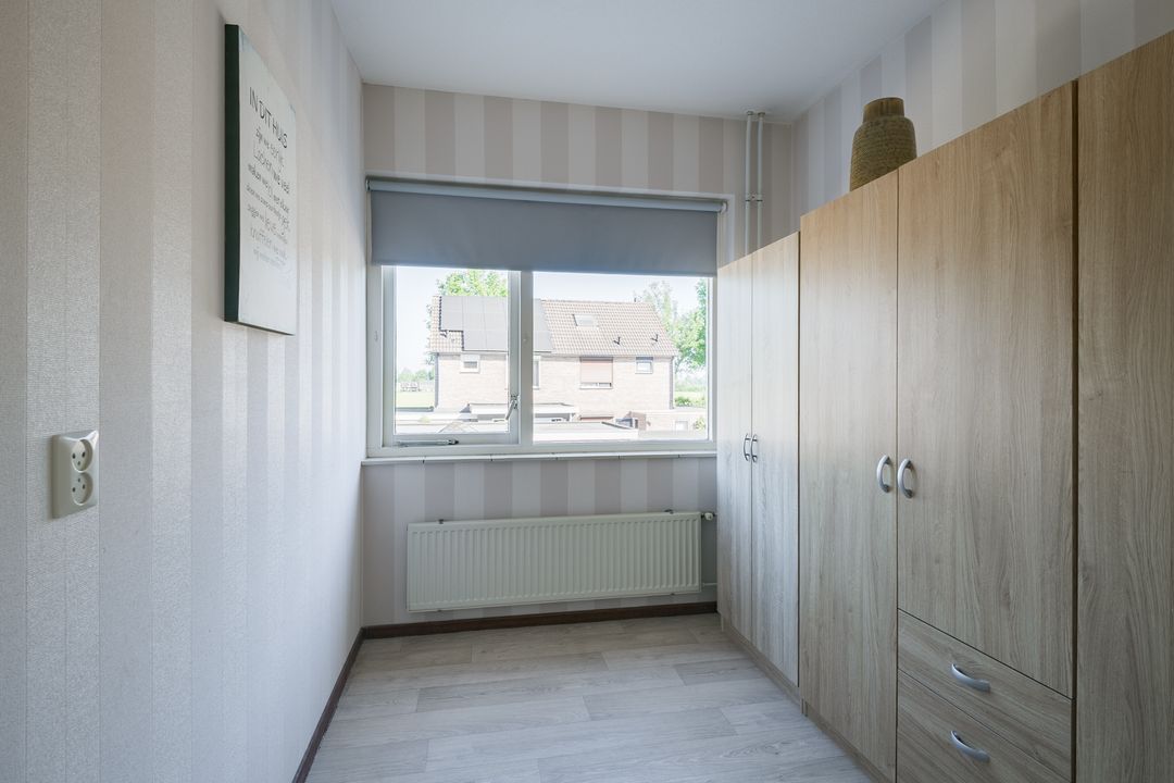 De derde slaapkamer is gelegen aan de voorzijde van de woning en profiteert eveneens van prettige lichtinval door het grote raam. Het opvallende gestreepte behang op de muren geeft deze ruimte een speelse uitstraling. Deze kamer is perfect geschikt als kinderkamer, hobbykamer of thuiskantoor; de mogelijkheden zijn eindeloos en laten zich gemakkelijk aanpassen aan uw specifieke wensen.