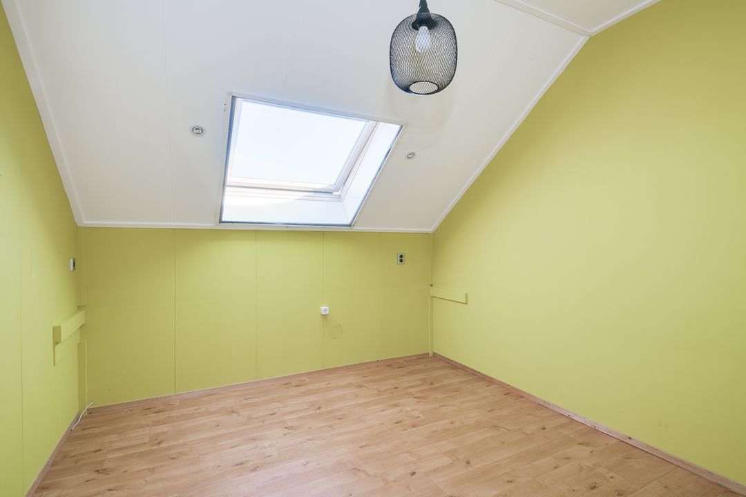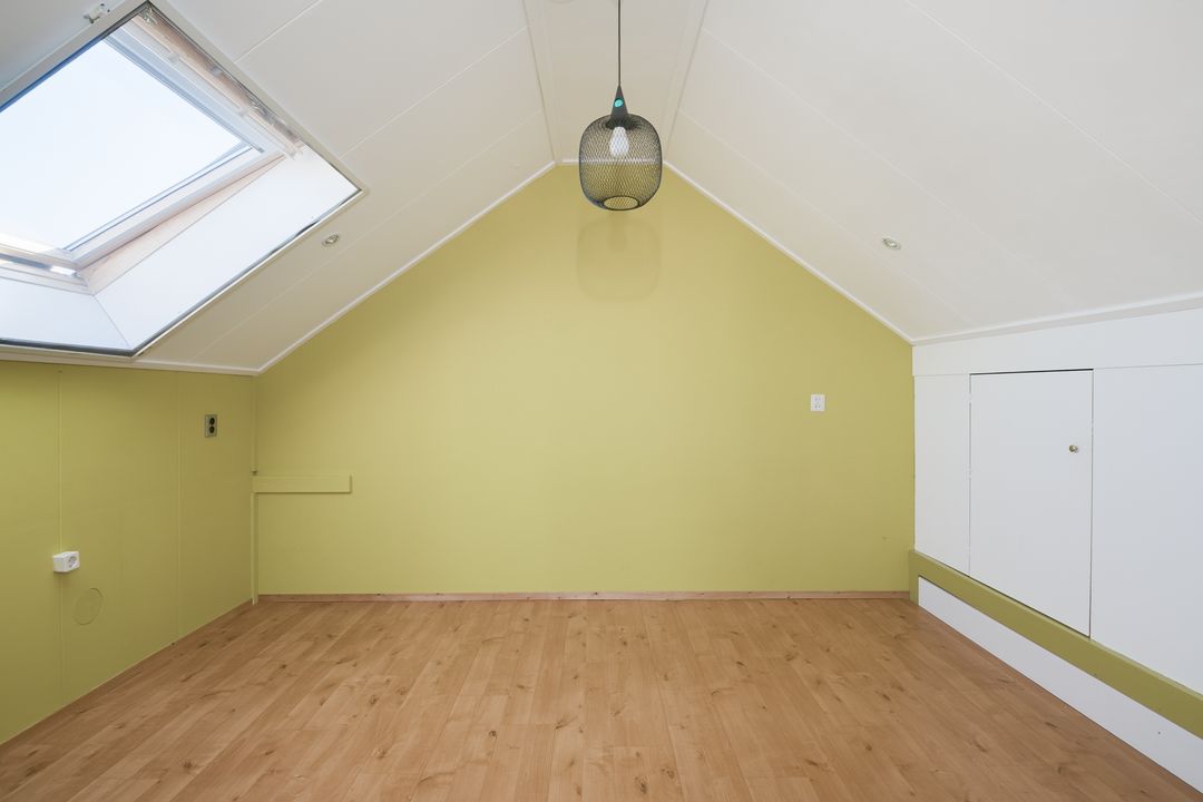 De vierde slaapkamer kenmerkt zich door het grote dakraam dat zorgt voor veel natuurlijk licht. De ruimte kan dienen als slaapkamer, speelkamer of extra werkplek. Dankzij de opvallende limegroene wanden heeft deze kamer een gezellige, vrolijke uitstraling.