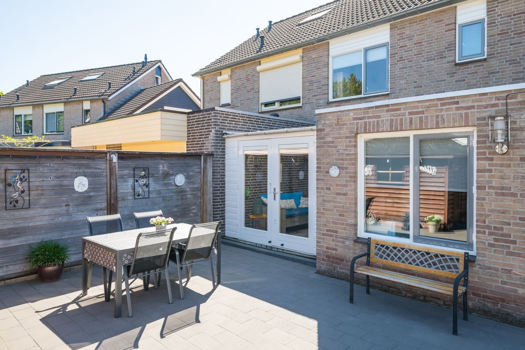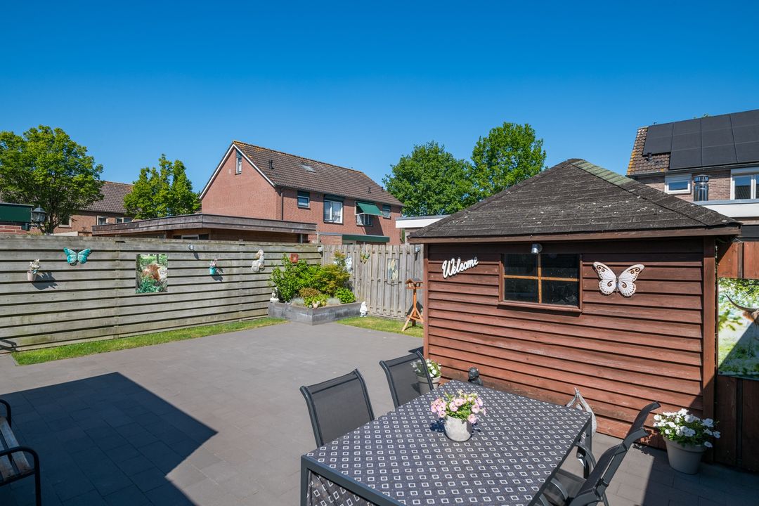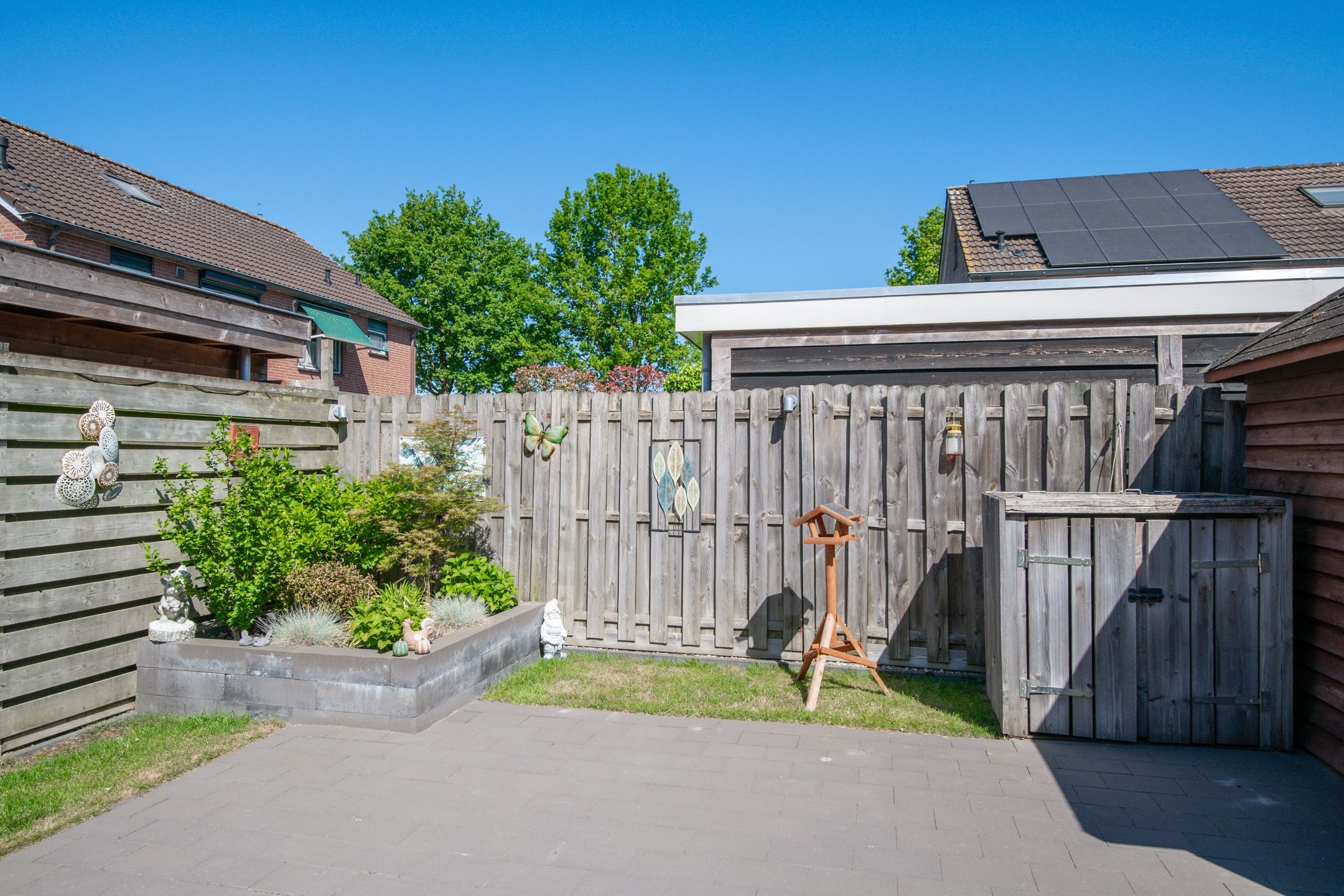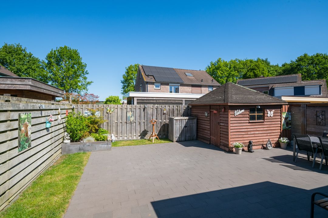 De geheel omheinde achtertuin is onderhoudsvriendelijk aangelegd en biedt volop ruimte voor buitenleven en ontspanning. Het ruime terras zorgt ervoor dat u altijd een plekje kunt vinden: zowel in de zon als in de schaduw van het huis. Het gazon en de borders zorgen voor een groene uitstraling zonder overdreven onderhoud te vergen. Het houten tuinhuis biedt bergruimte voor tuingereedschap en buitenspullen, terwijl u via de achtertuin ook toegang heeft tot de garage. De buitenverlichting maakt het mogelijk om ook 's avonds heerlijk buiten te vertoeven.