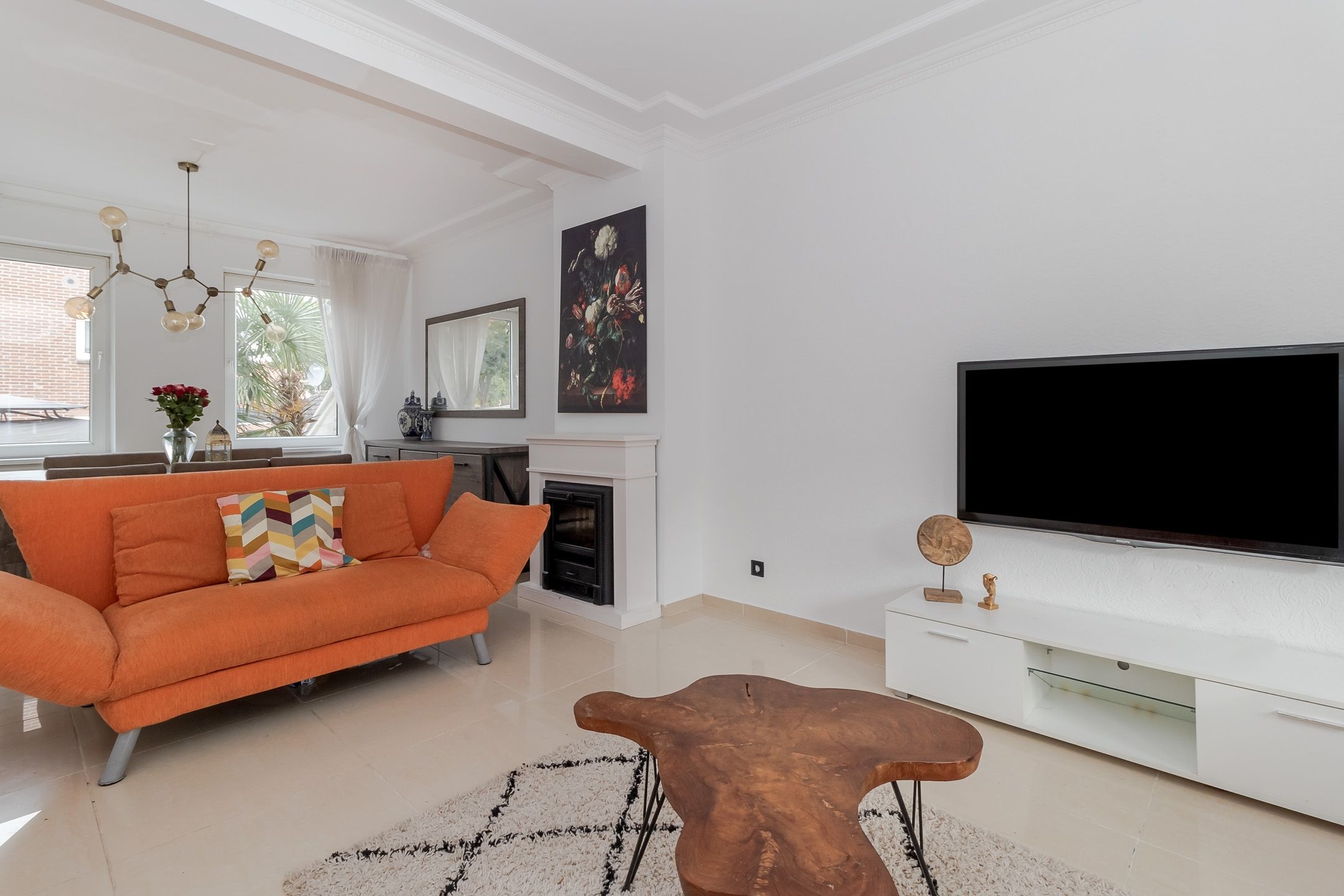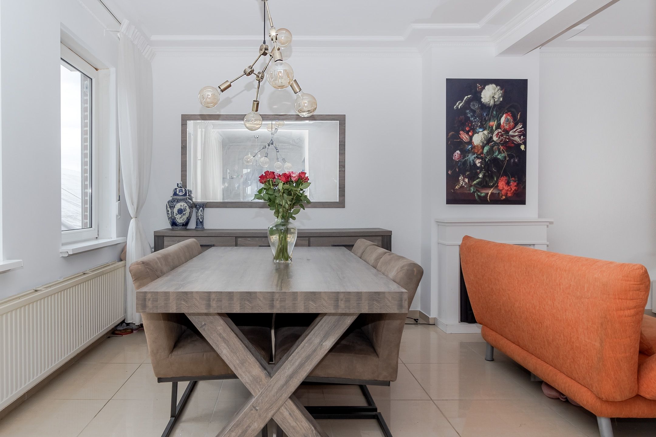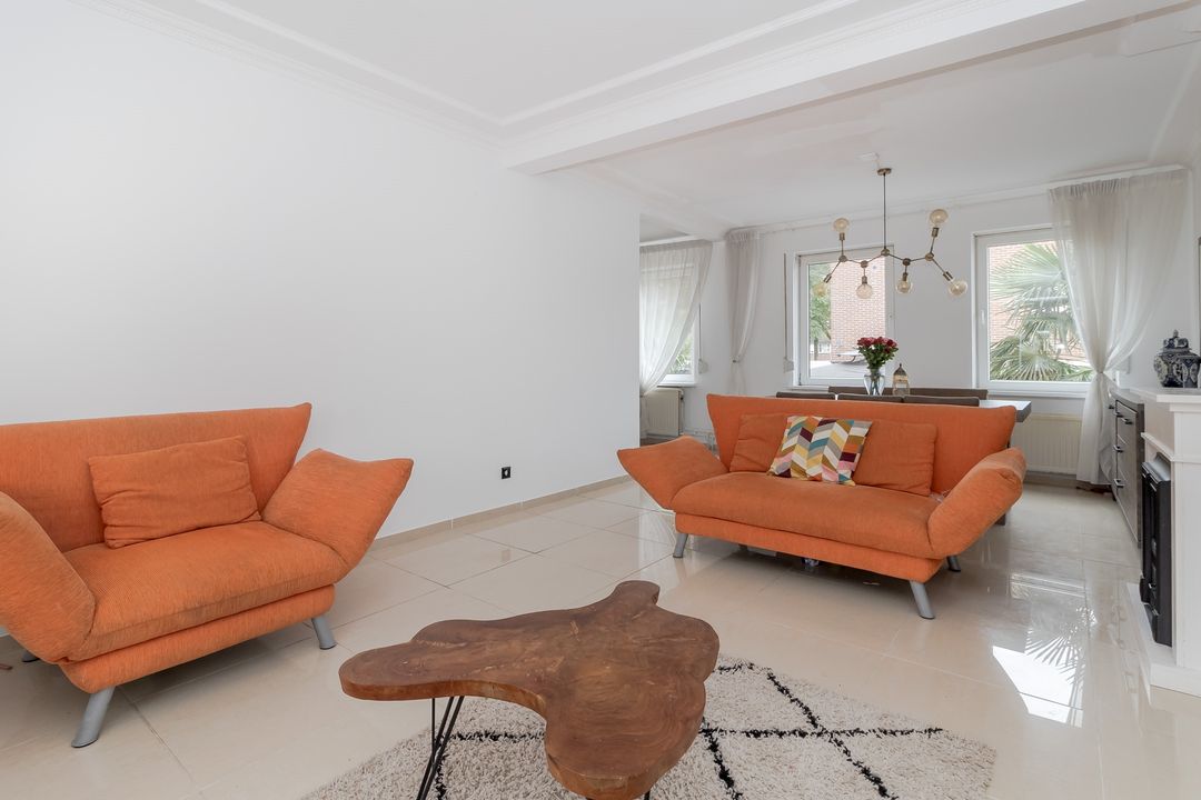 Grote ramen aan de voor- en achterkant zorgen voor veel licht. De vloer van grote, glanzende, lichtbeige tegels geven de woonkamer een luxe uitstraling.