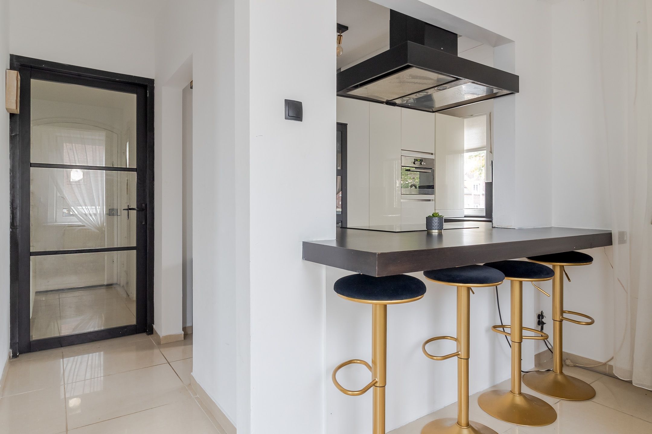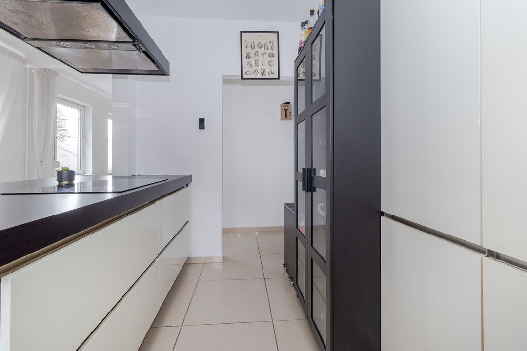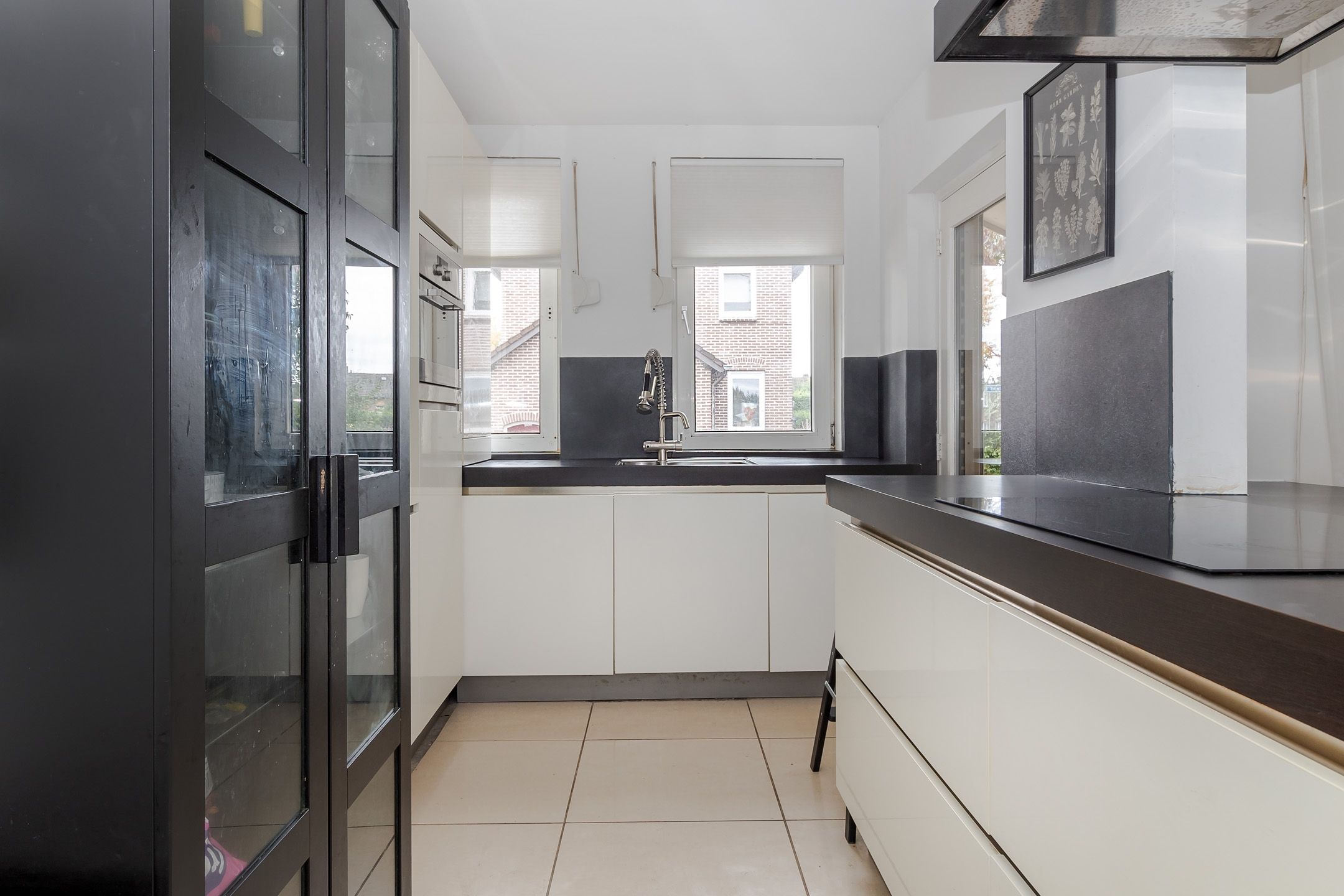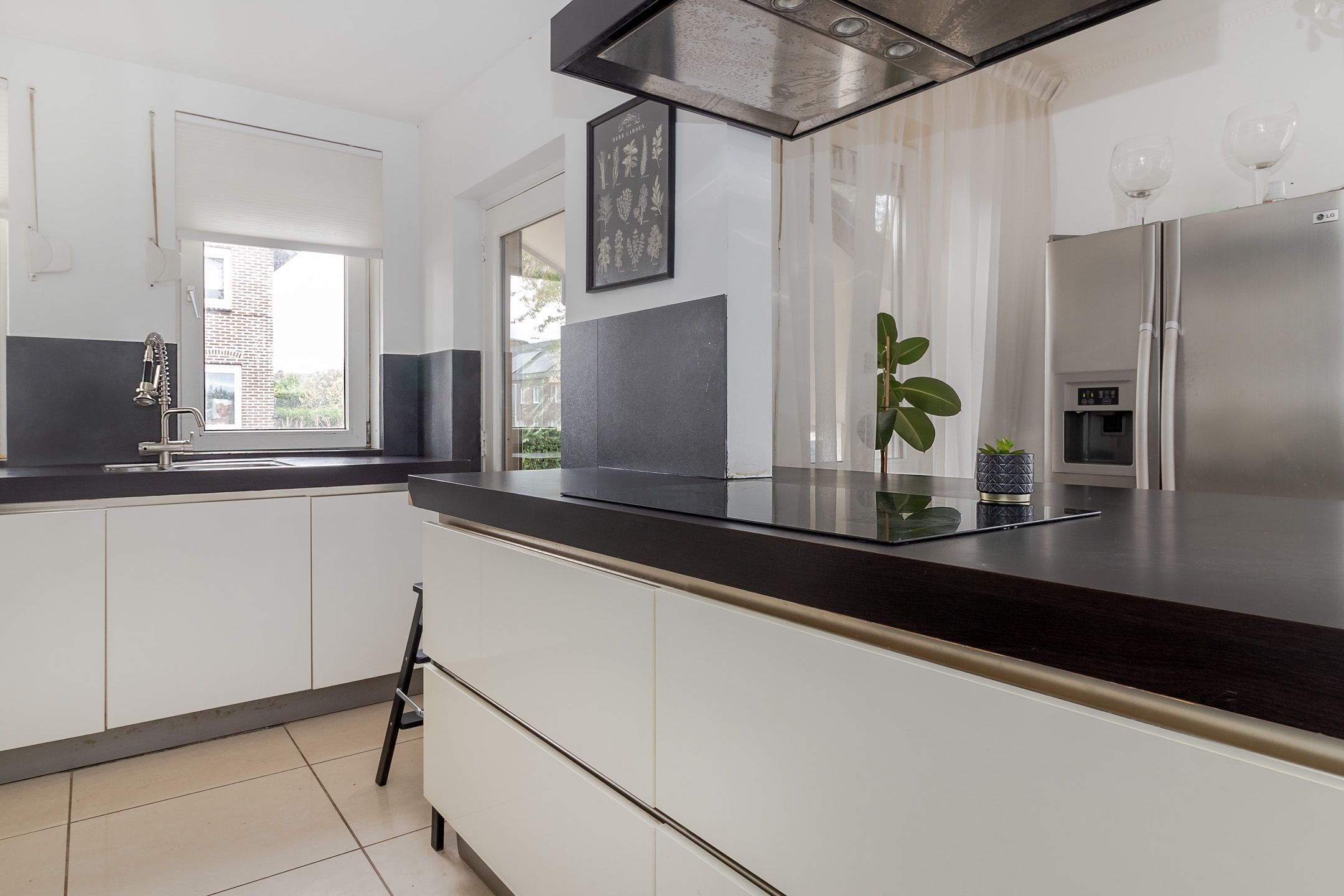 De keuken heeft een witte, moderne hoekopstelling met een speels kookeiland en een antraciet werkblad.