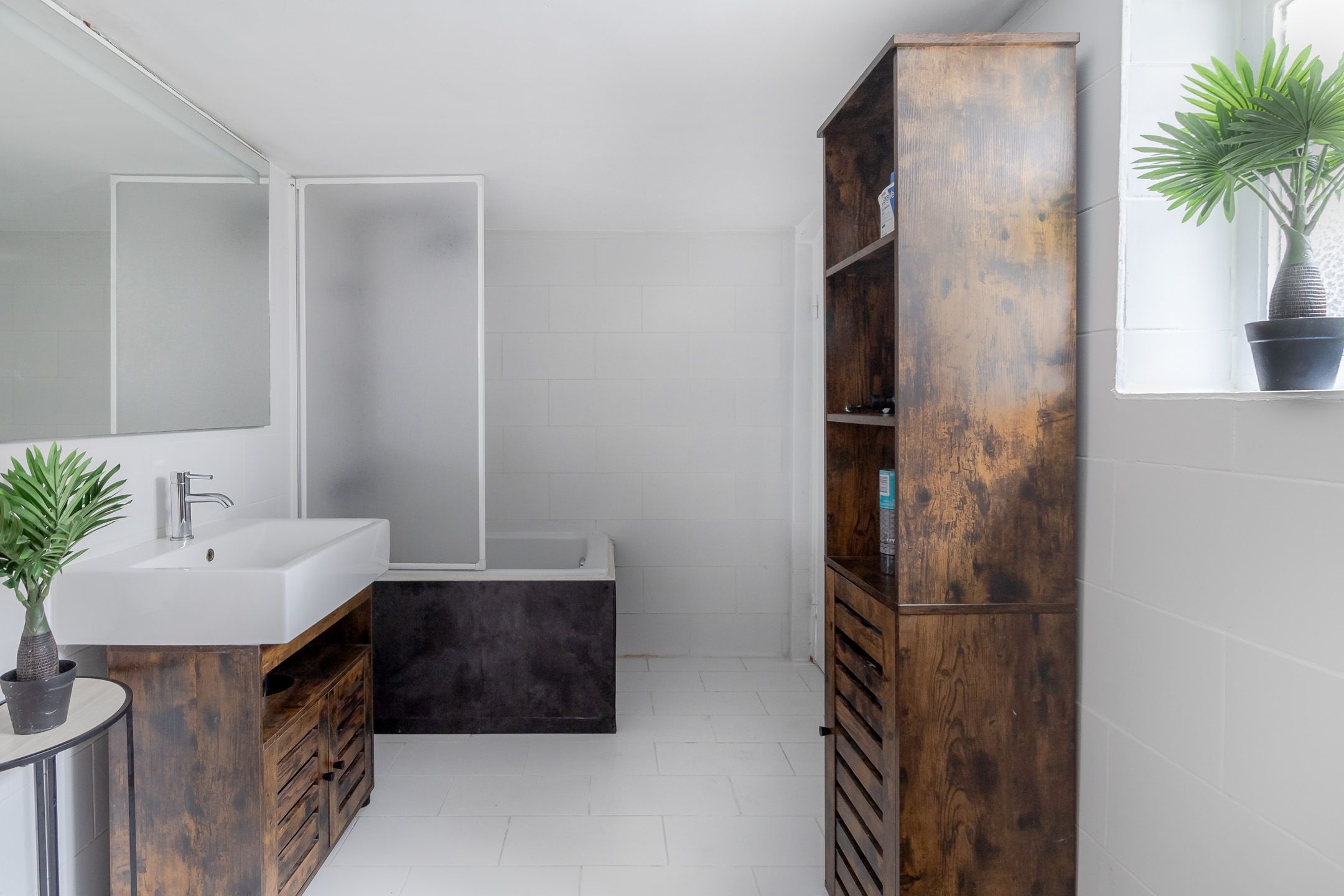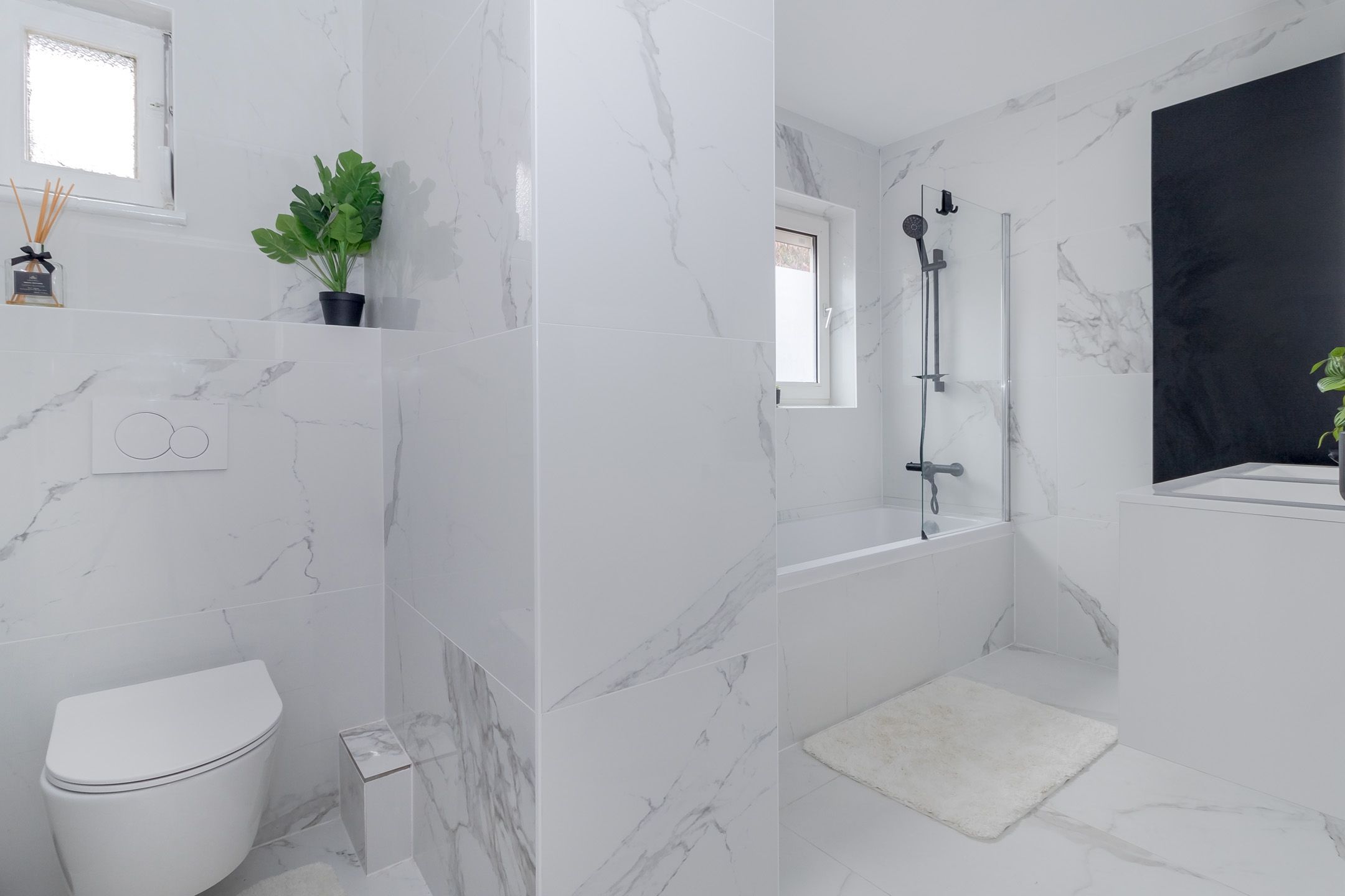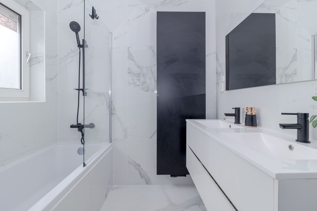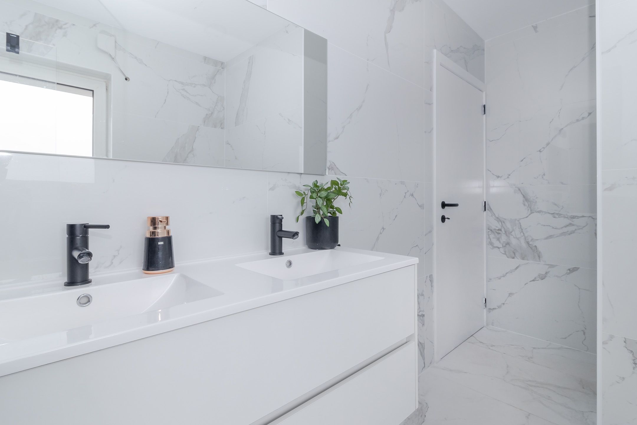 De moderne badkamer (2024) is een plaatje. Met een 2-persoonswastafel, een bad en grote, witte tegels met marmerlook. Zie jij je ’s morgens al klaarmaken voor je werk? Of erna uren badderen?