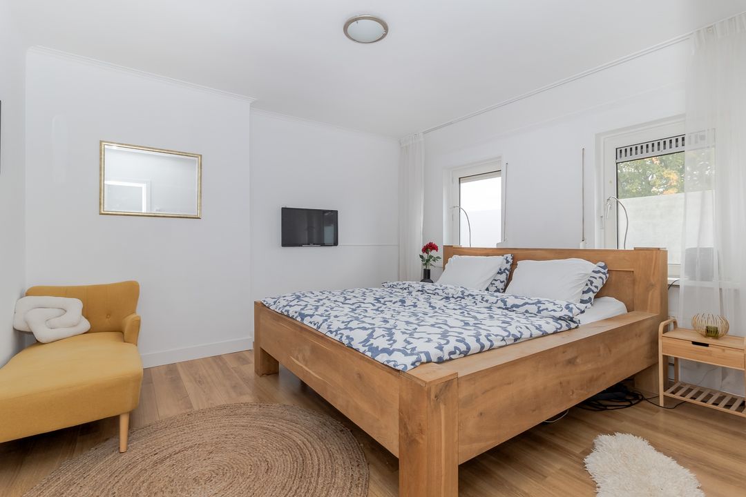 Alle kamers hebben strakke, witte muren en plafonds. En een lichte houtlook laminaatvloer.