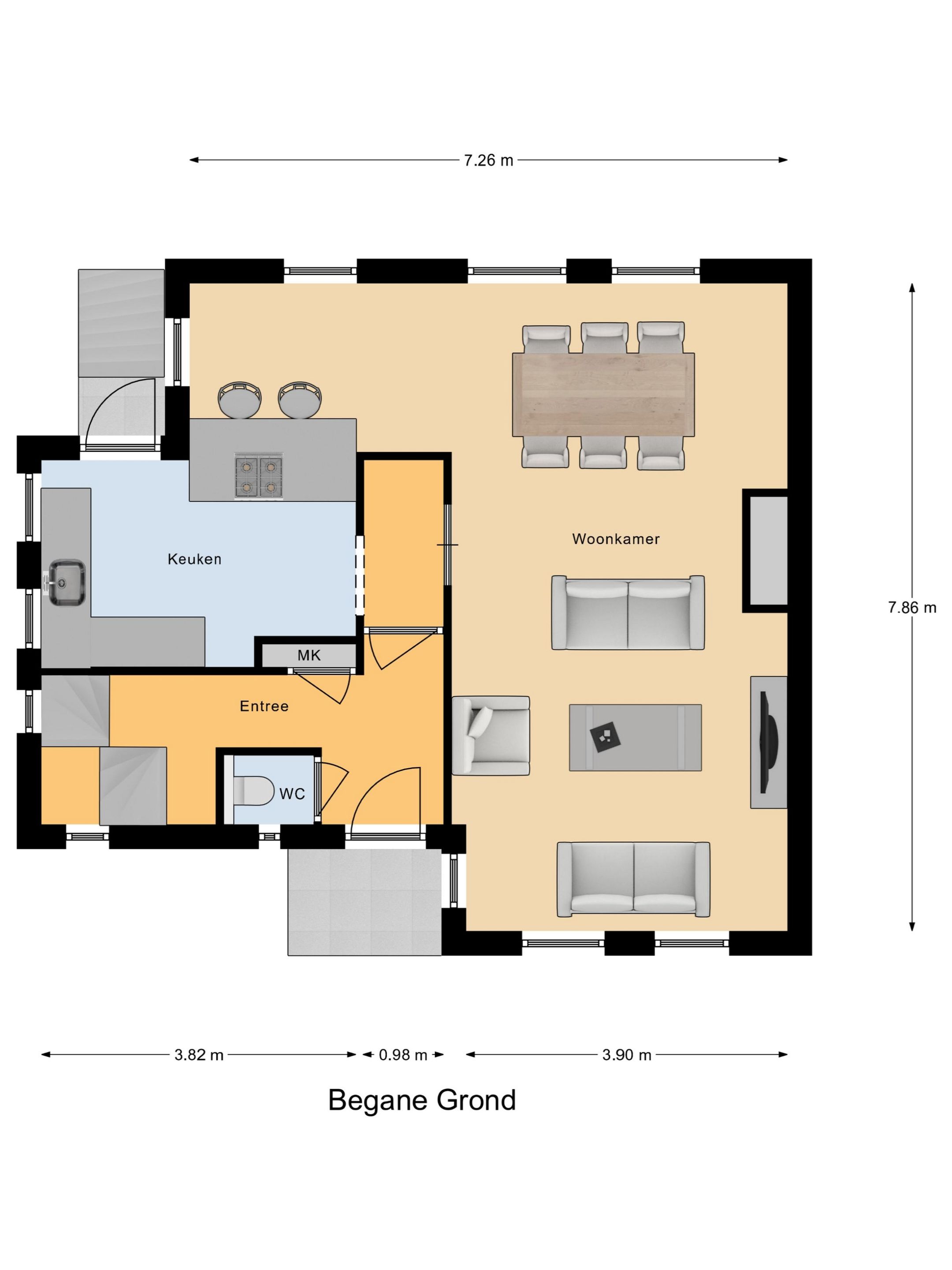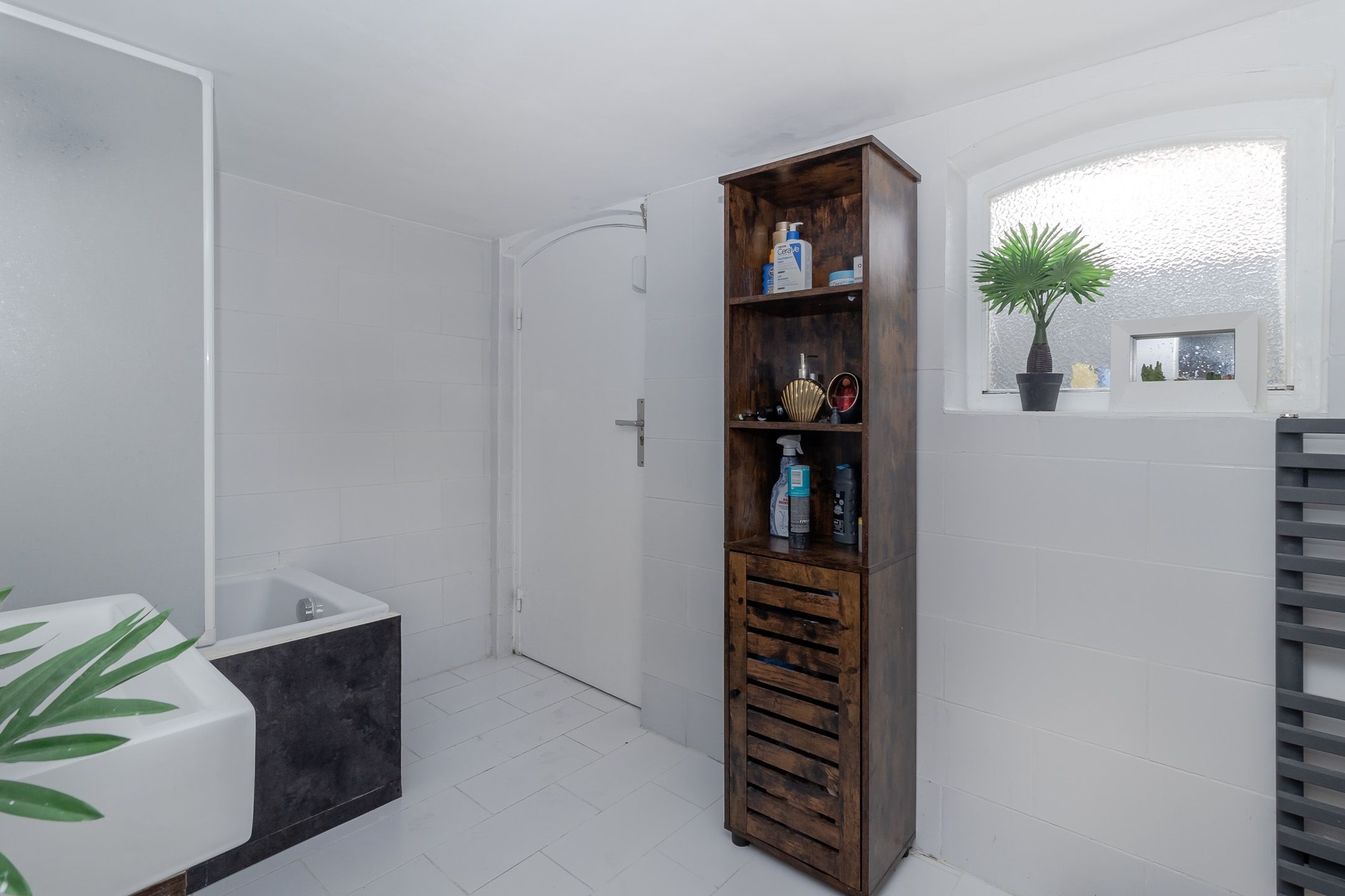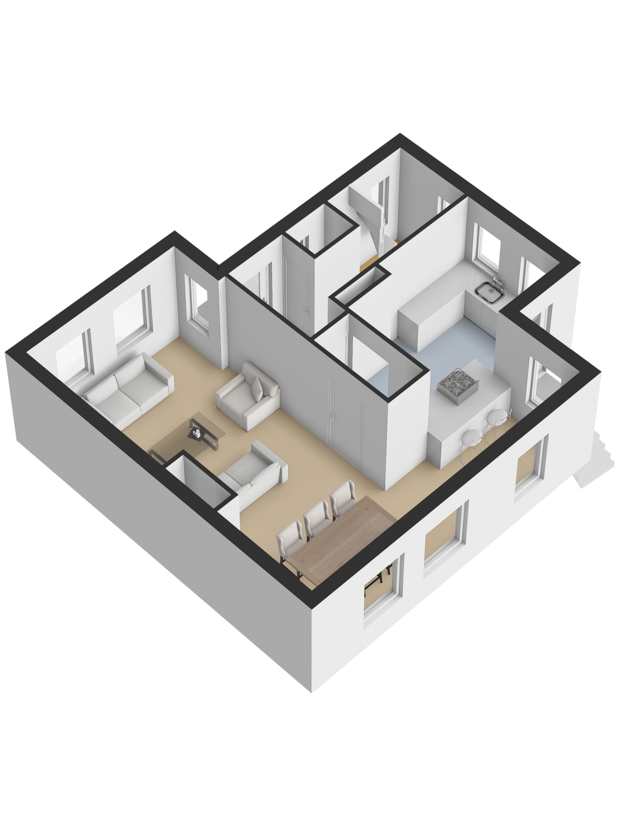 Een paar trapjes op en je bereikt de voordeur aan de voorkant van de woning. Van hieruit kom je in de hal met toegang tot het toilet, de meterkast en de keuken. Verderop heb je een aparte trap naar de zijingang van de woning, de trap naar de eerste verdieping én naar het souterrain.