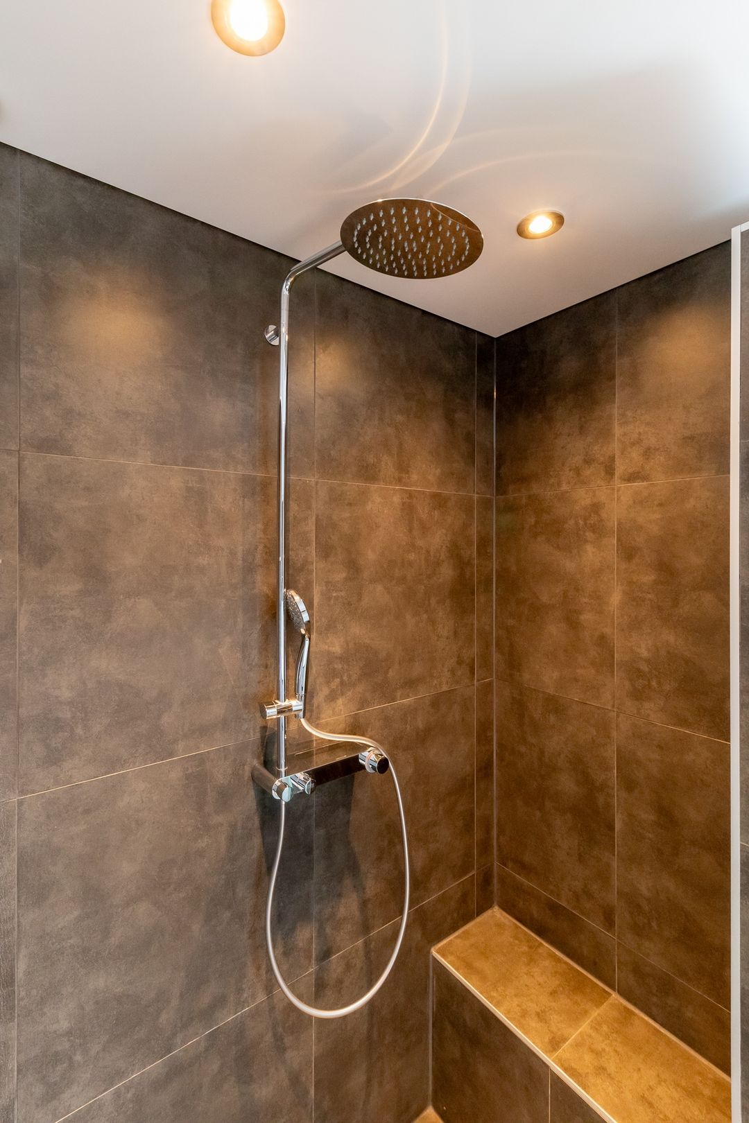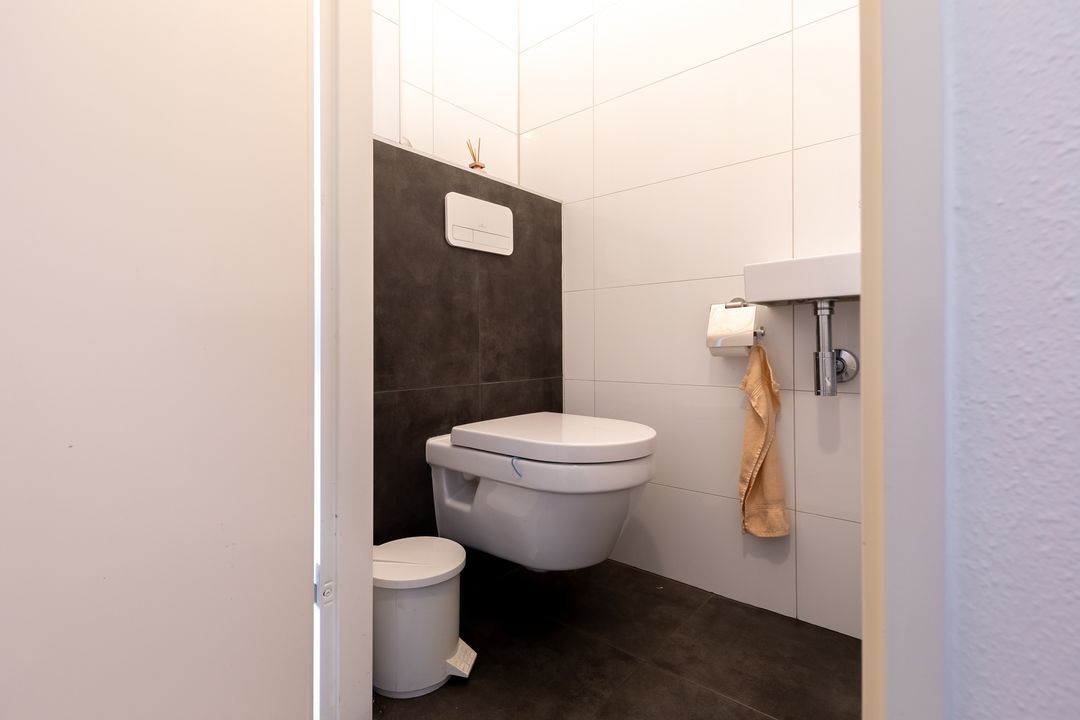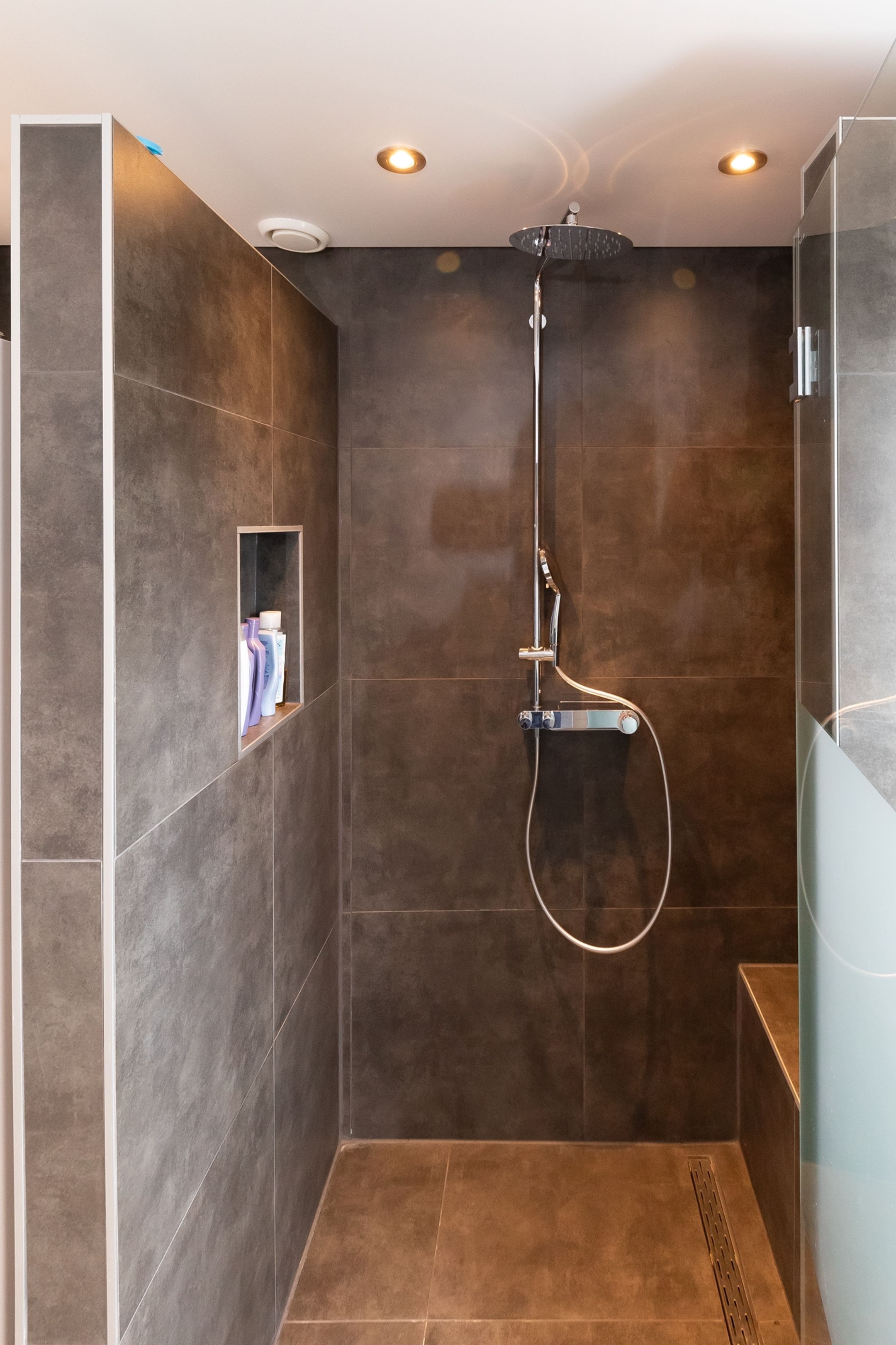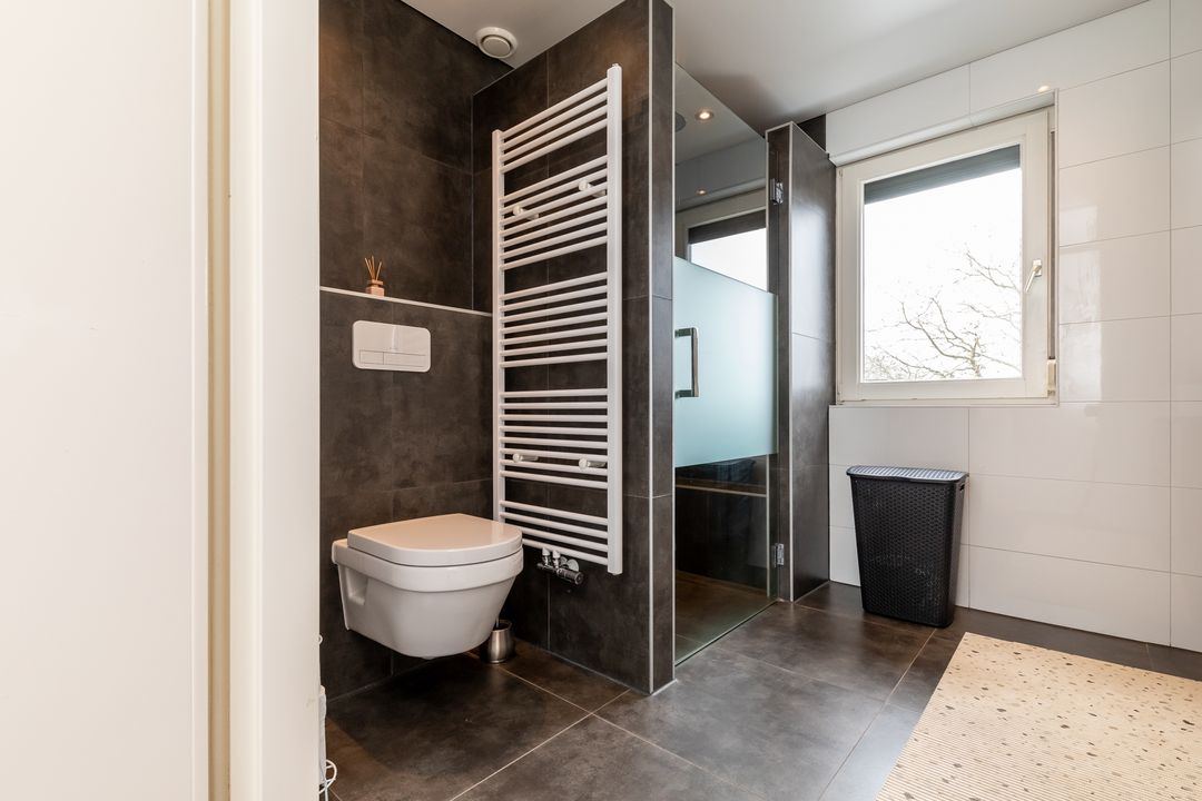 De badkamer is functioneel ingericht en voorzien van vloerverwarming. Geen koude voeten tijdens het tandenpoetsen dus! De dubbele wastafel met strak meubel zorgt ervoor dat u elkaar niet in de weg zit tijdens het ochtendritueel. De inloopdouche is voorzien van zowel een luxe regendouche als een praktische handdouche, waarbij de handige nis in de wand uw doucheproducten binnen handbereik houdt. Extra prettig is het raam, waardoor u niet alleen van daglicht geniet maar ook voor natuurlijke ventilatie zorgt. Tot slot geeft de combinatie van witte en antracietgrijze tegels de badkamer een eigentijdse uitstraling.