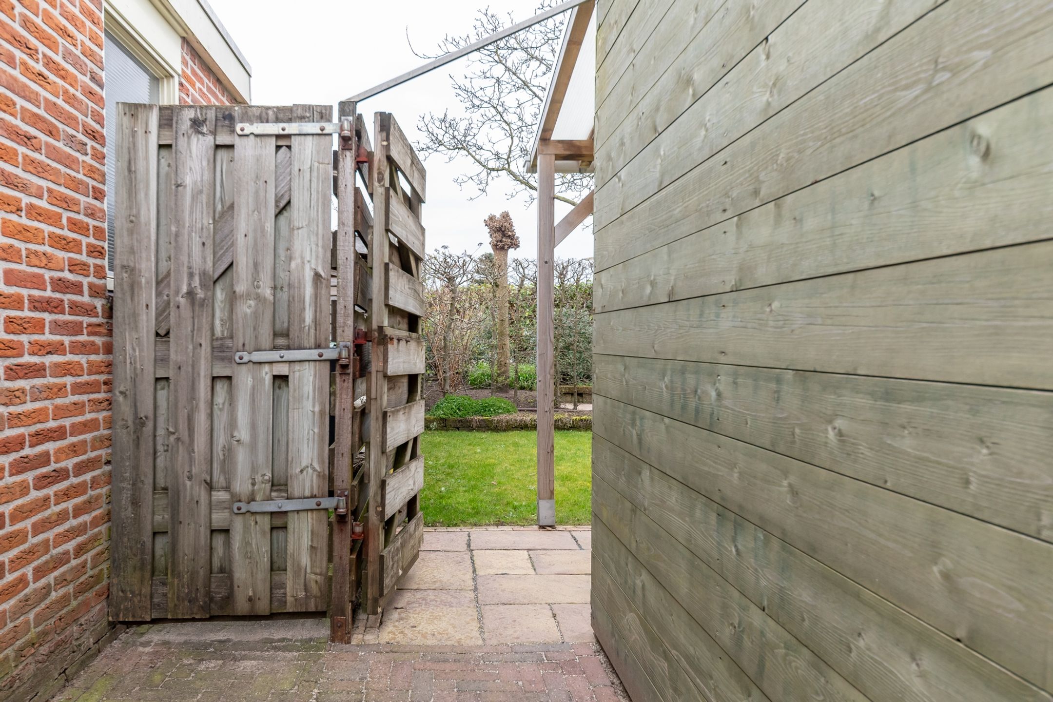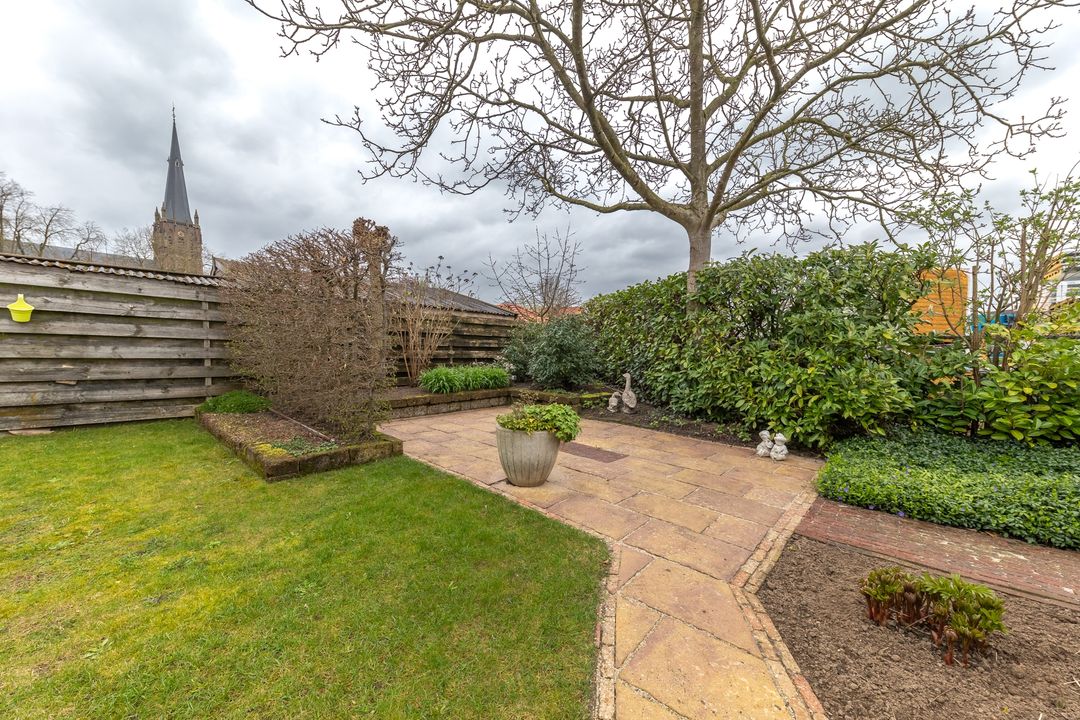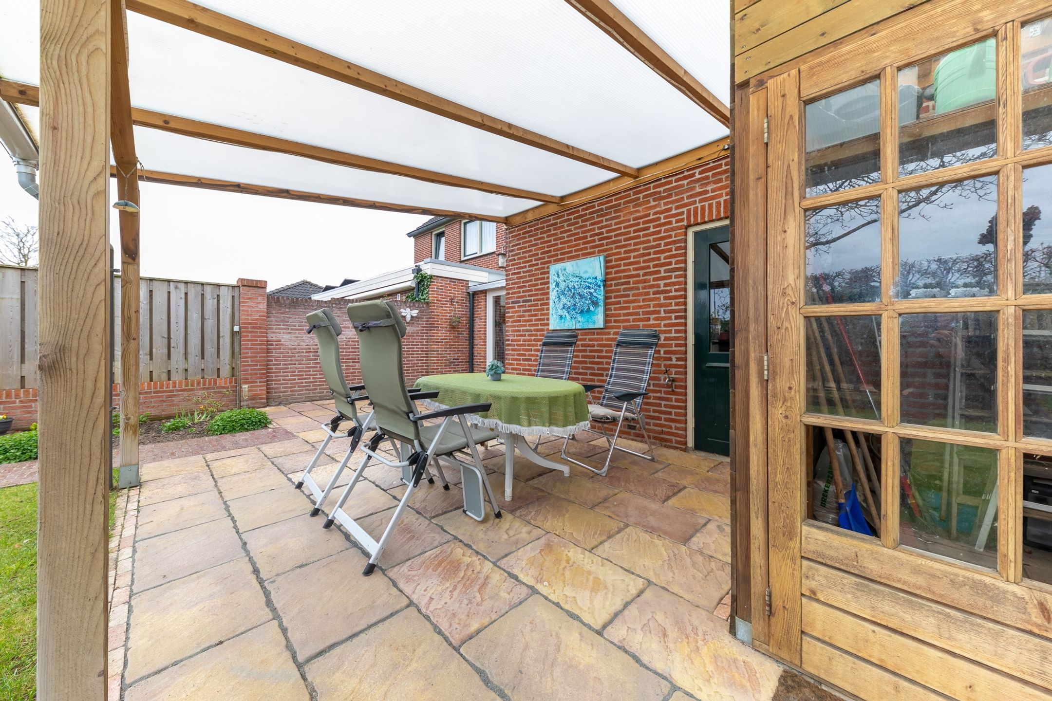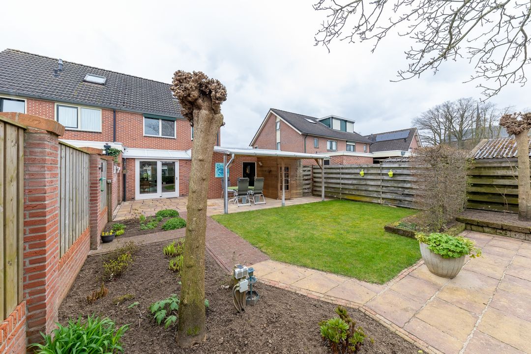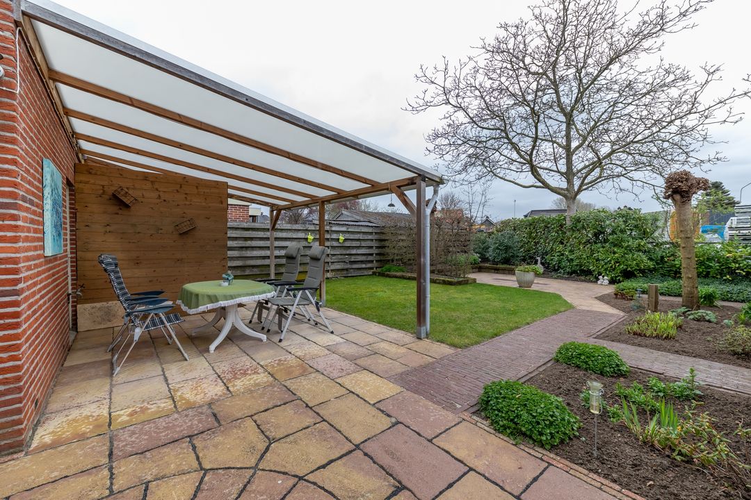 De tuin is een fijne buitenruimte waar u het hele jaar door van kunt genieten. Het overdekte terras zorgt ervoor dat u ook bij een zomerse regenbui lekker buiten kunt blijven zitten. De verzorgde borders en het gazon maken het plaatje compleet, terwijl de erfafscheiding zorgt voor privacy. De tuin is geheel omheind, heeft een vrije achterom en is voorzien van buitenstopcontacten en een buitenkraan. In de houten berging is ruimte voor bijvoorbeeld fietsen en tuingereedschap.