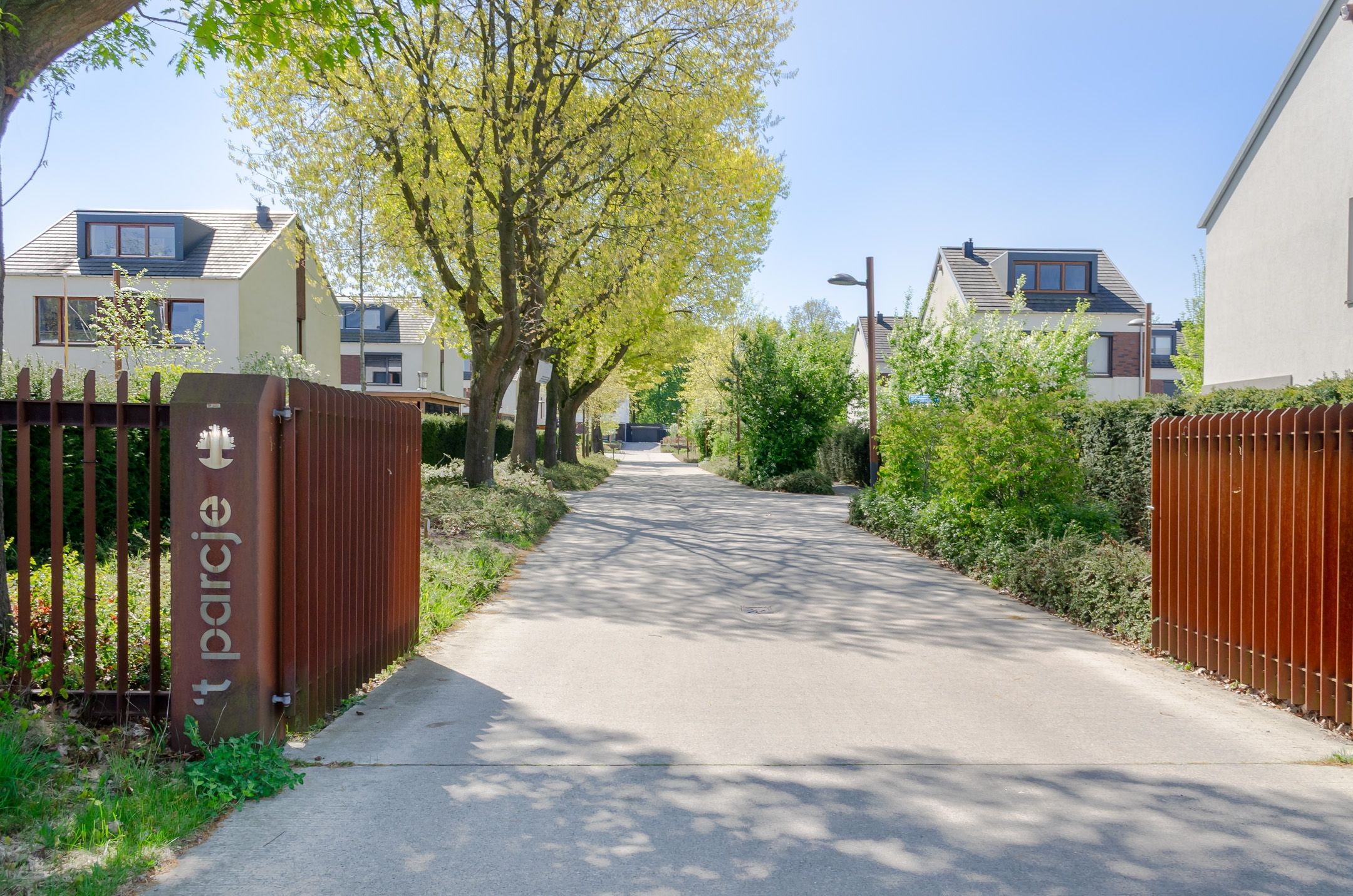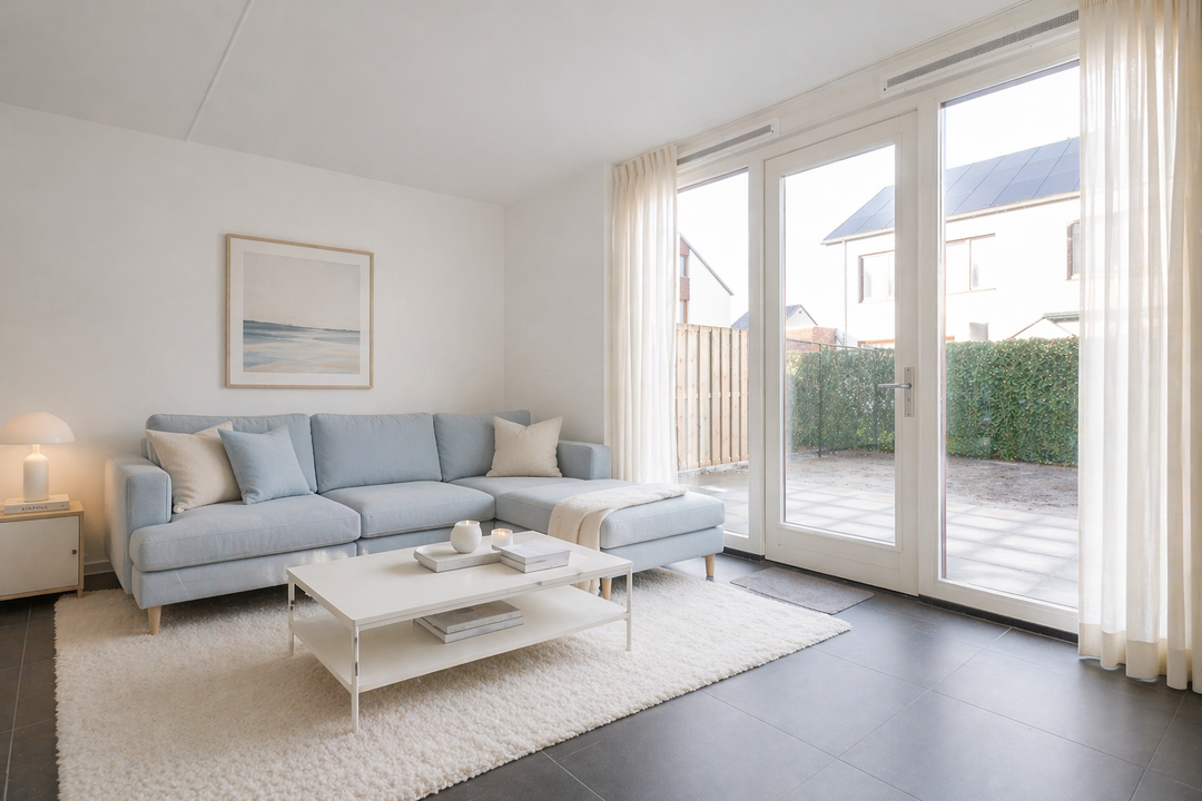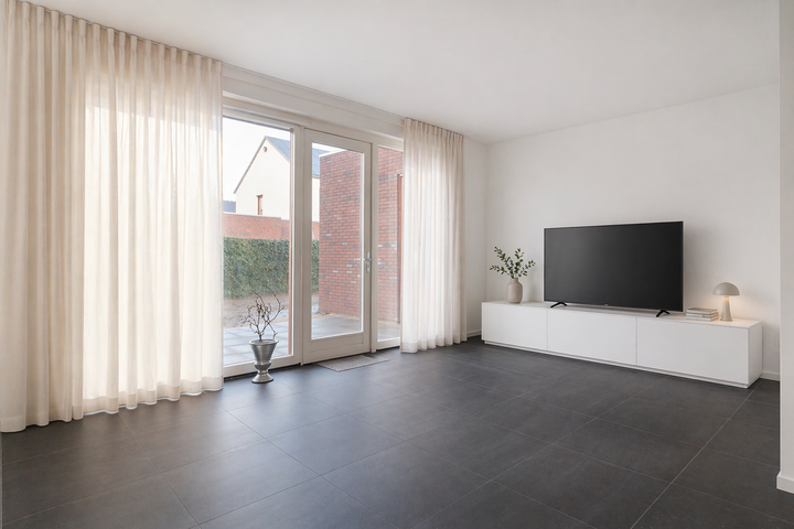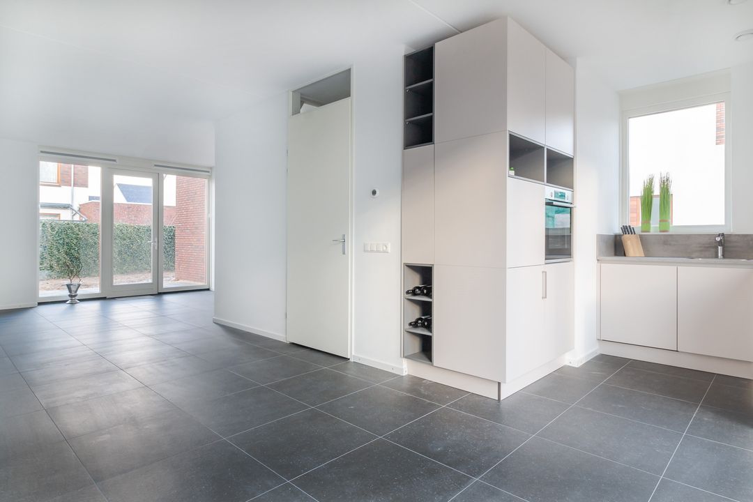 In de tuin komt nog een gazon. Het terras ligt aansluitend aan de woonkamer. De nog tegen het hekwerk te planten klimopbegroeiing gaat zorgen voor de nodige privacy.