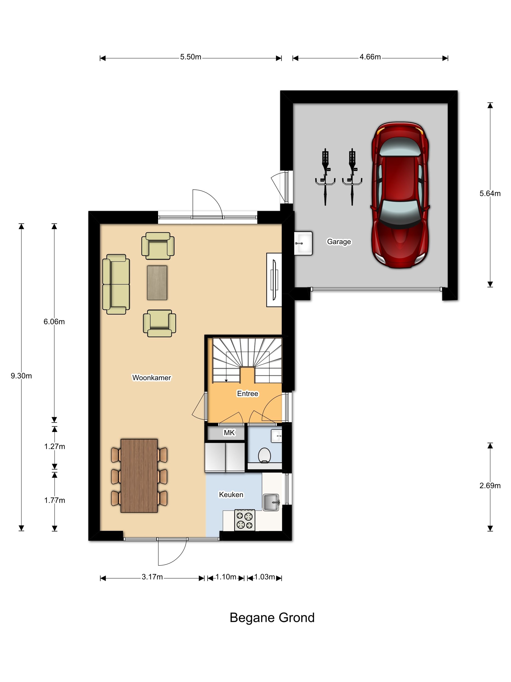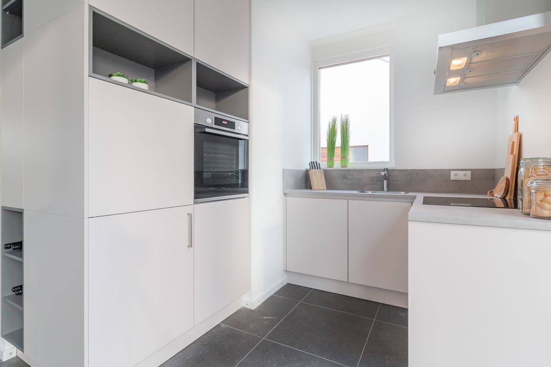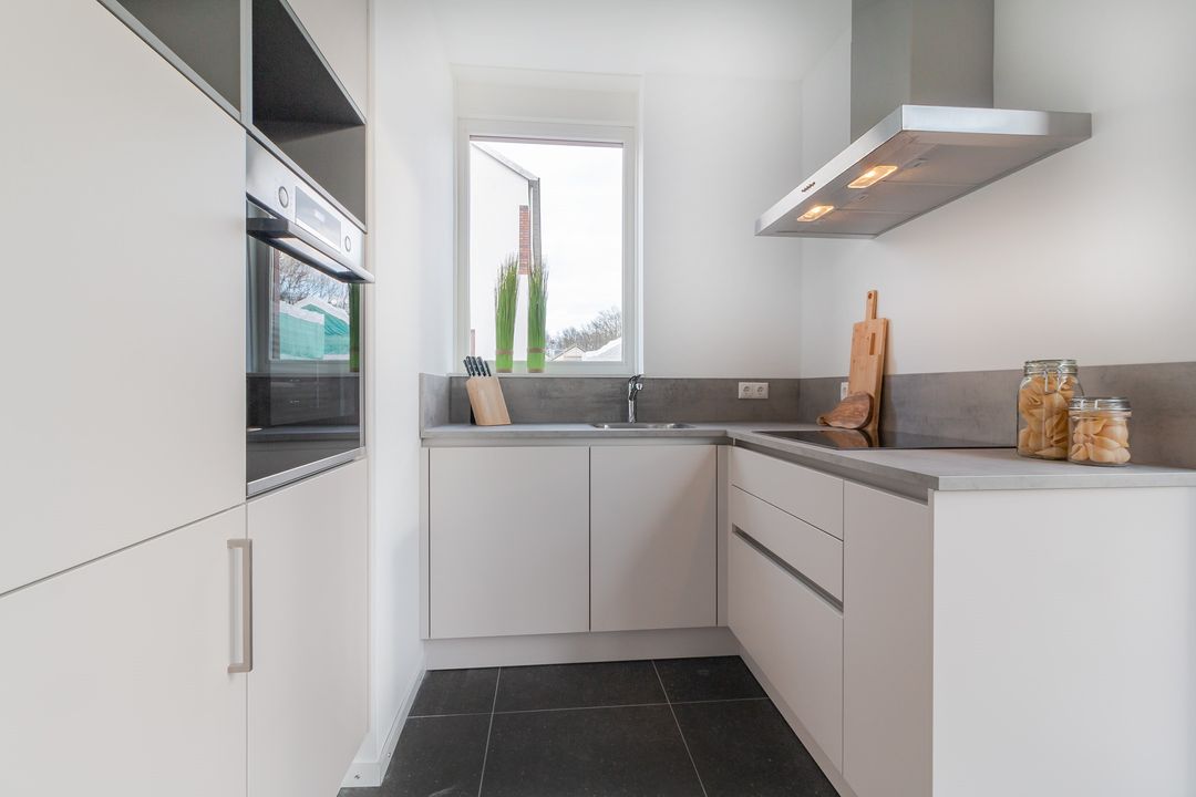 Via de brede oprit kom je bij de aan de zijkant gelegen voordeur. In de entree is de meterkast, toiletruimte, deur naar de woonkamer en de trapopgang naar boven. De woonkamer is geheel betegeld met een mooie antraciet vloertegel. Direct grenzend aan de woonkamer ligt de open keuken. De hoekopstelling biedt voldoende werkruimte, maar geeft ook genoeg plek voor het opbergen van al je keukenspullen.