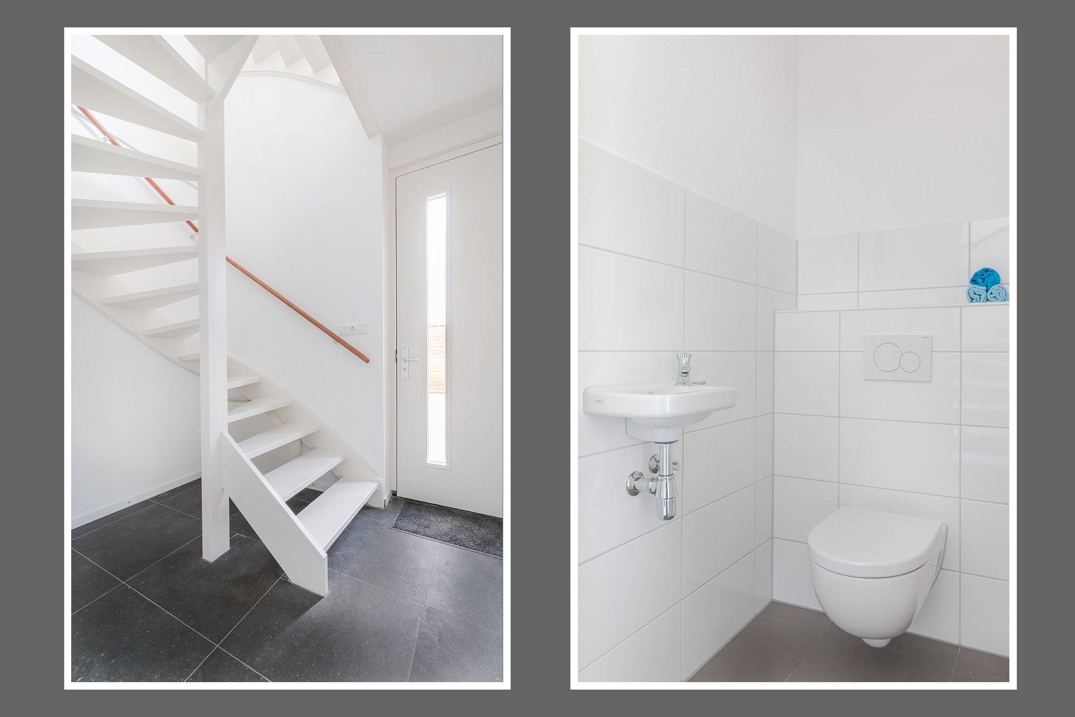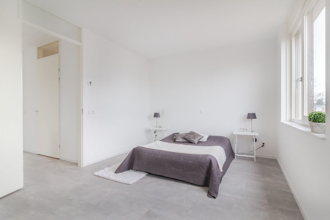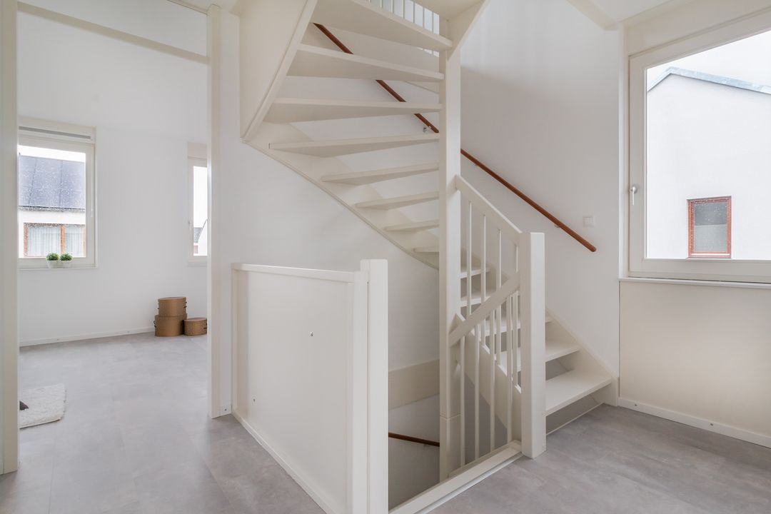 Een extra brede open trap in de hal leidt je naar de eerste verdieping waar 3 slaapkamers en de moderne badkamer gesitueerd zijn. De vloer van de gehele 1e en 2e verdieping zijn voorzien van pvc-stroken met een mooie grijze 'betonlook'.