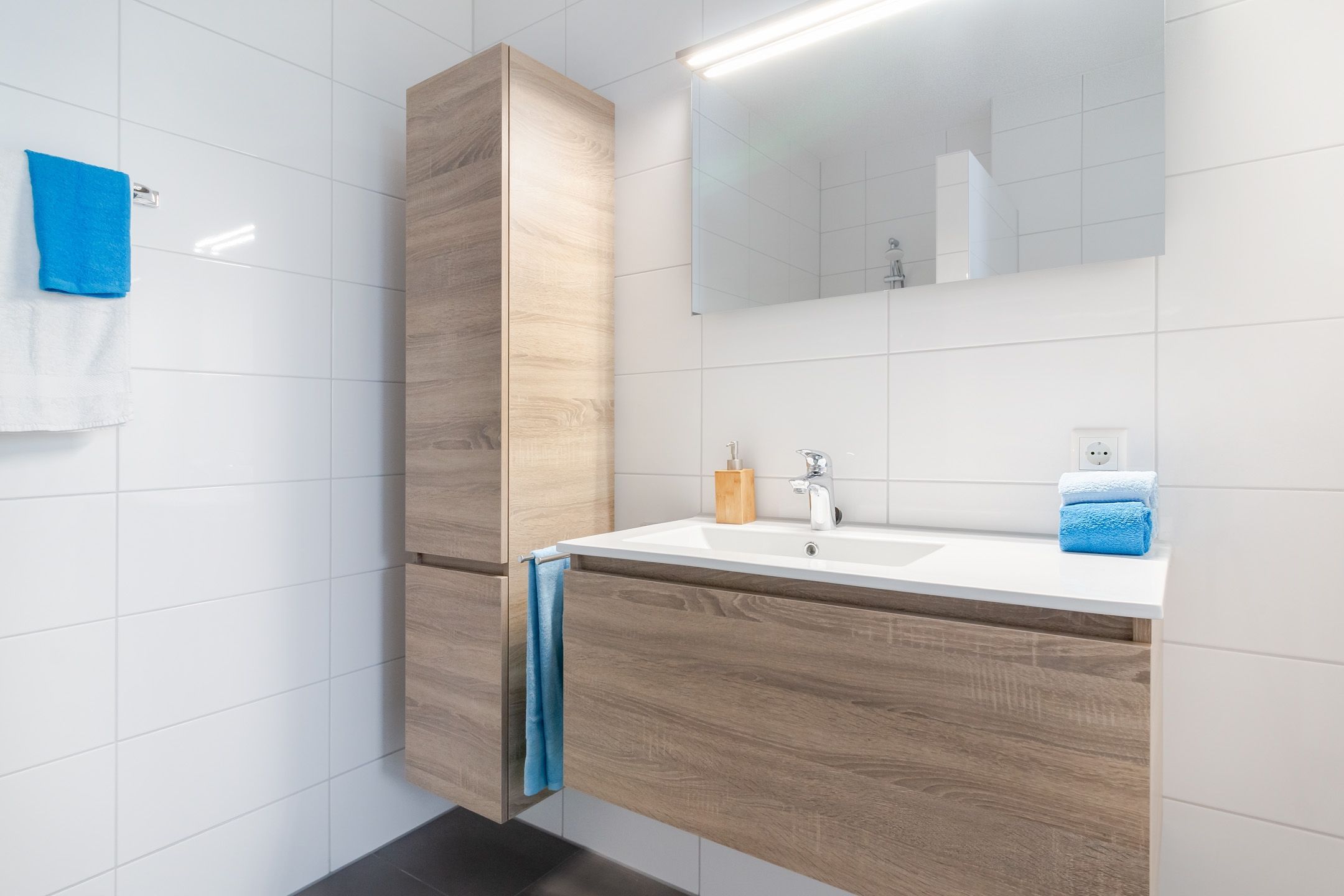 De badkamer is compleet met een inloopdouche, toilet, wastafel, wastafelonderkast en een kast voor diverse toiletartikelen.