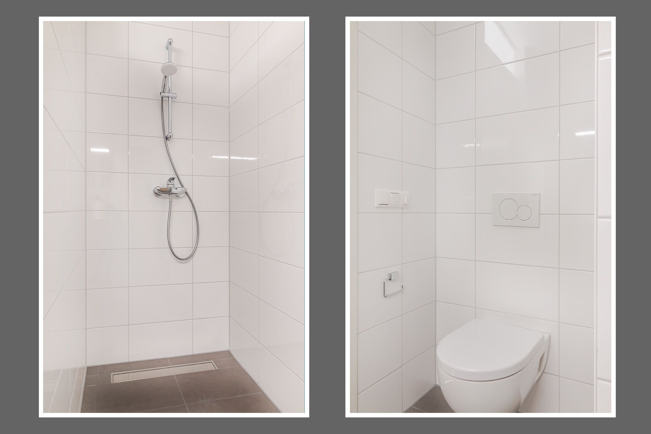 Antraciet vloertegels en de witte wandtegels zorgen ook hier weer voor een ruimtelijk en modern effect.